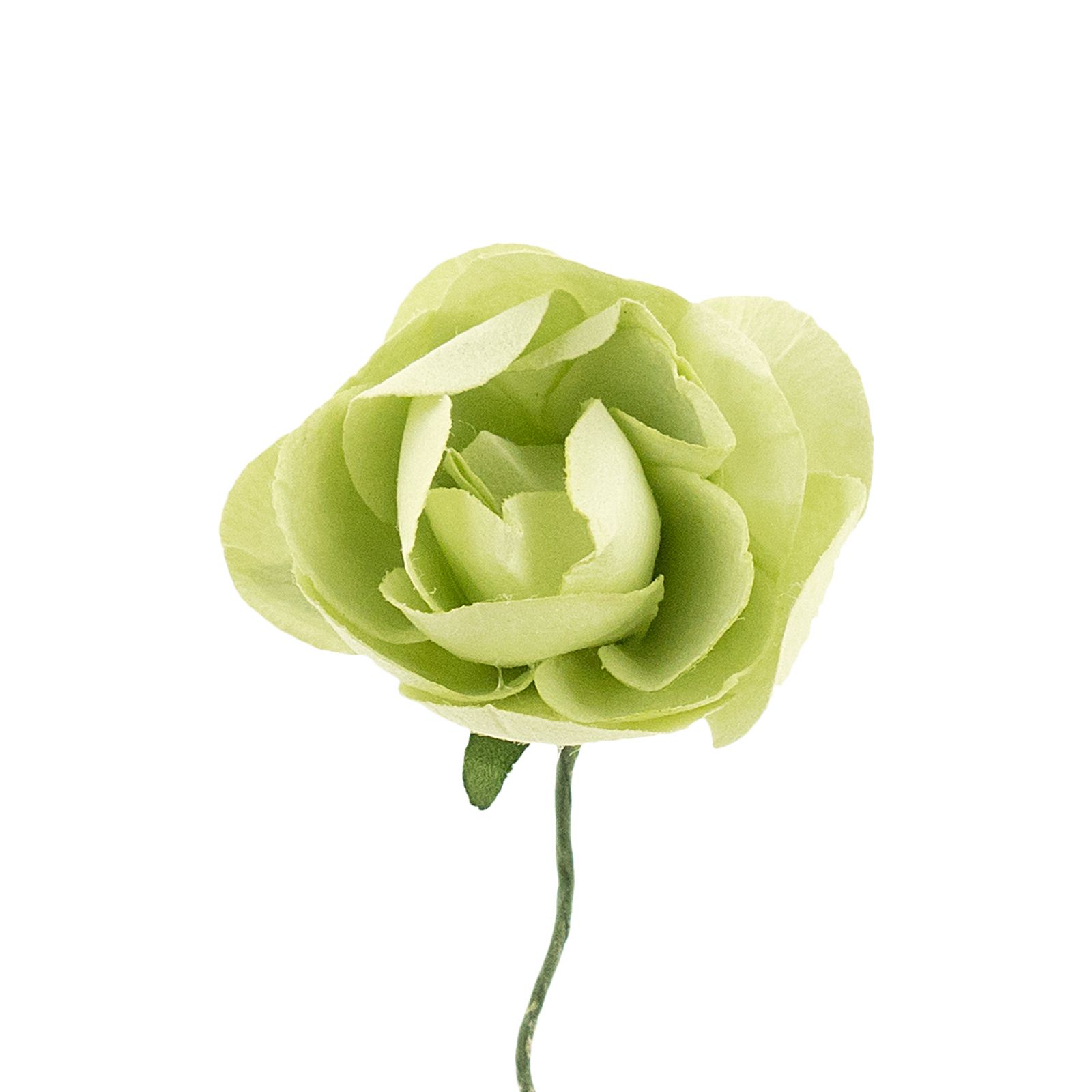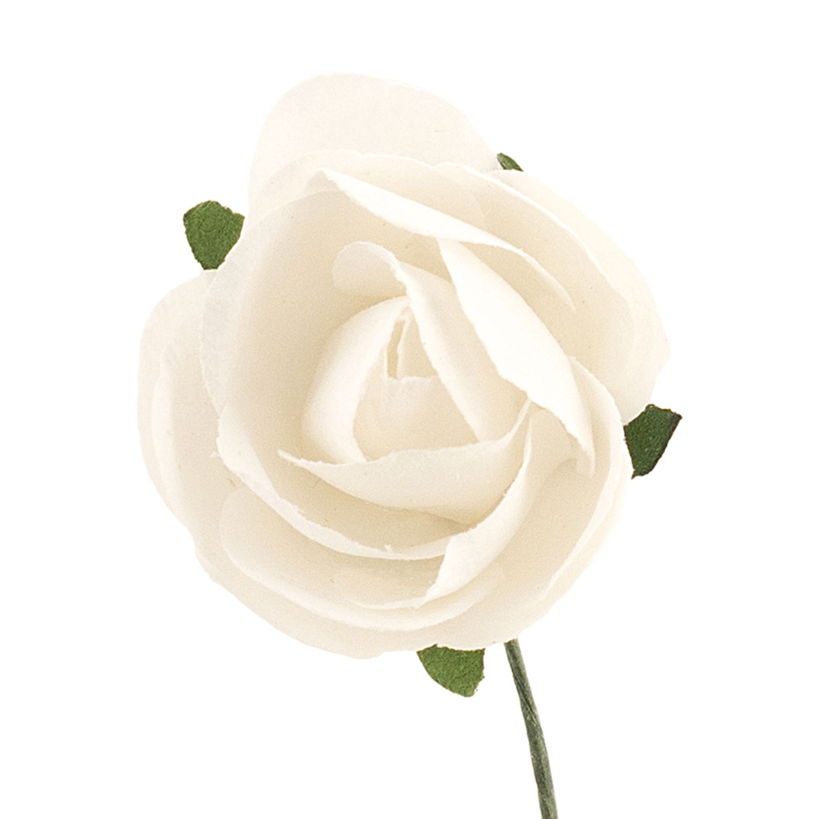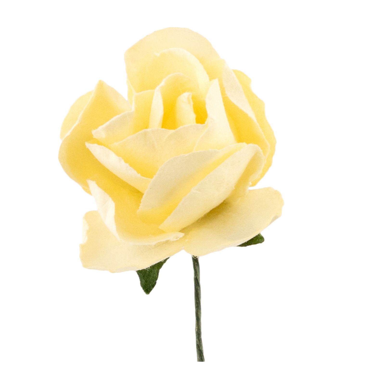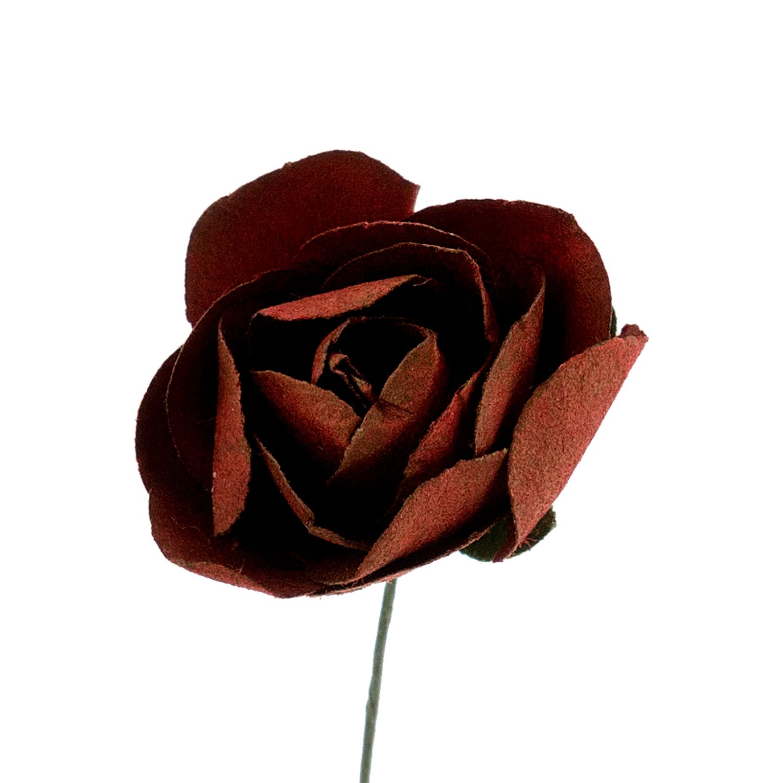 Fiori artificiali in carta, con bocciolo di rosa con stelo in metallo modellabile rivestito in verde.