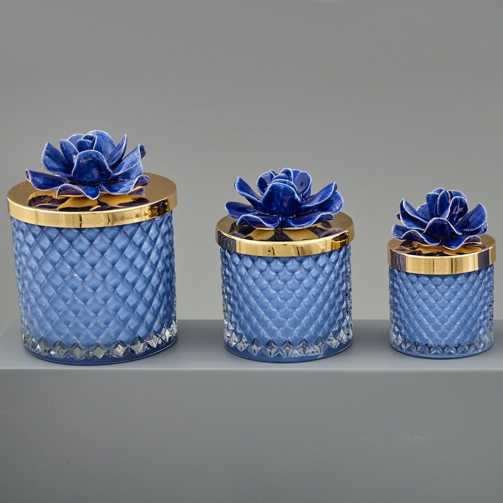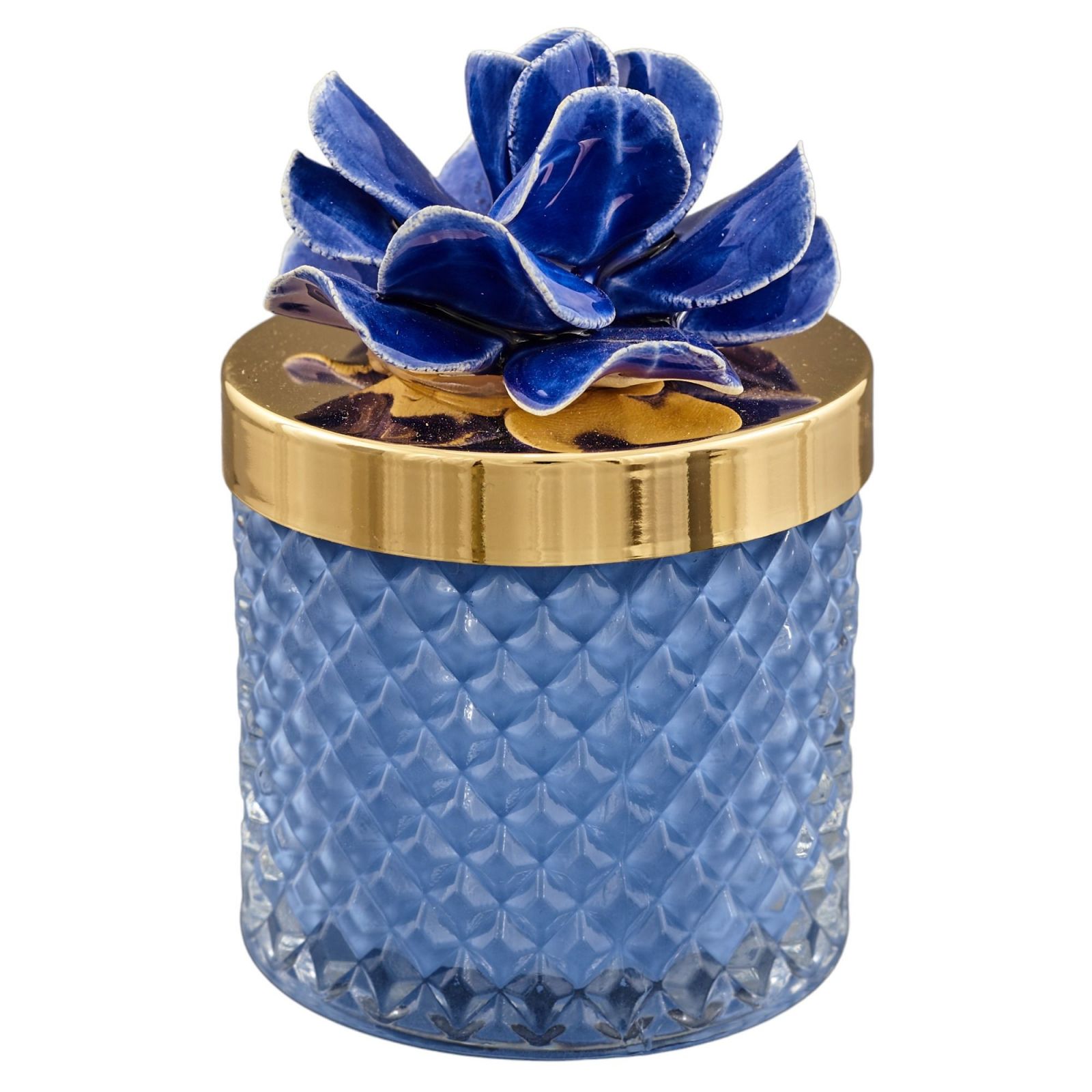 Questa bellissima bomboniera è composta da un portacandela in vetro con un fiore Capodimonte di colore blu, con un tappo in oro. Disponibile in tre diverse dimensioni: Standard (D.6,8 H.9.5), Grande (D.8,5 H.11) e Maxi (D.10,5 H.13). La scatola regalo è inclusa nel prezzo.