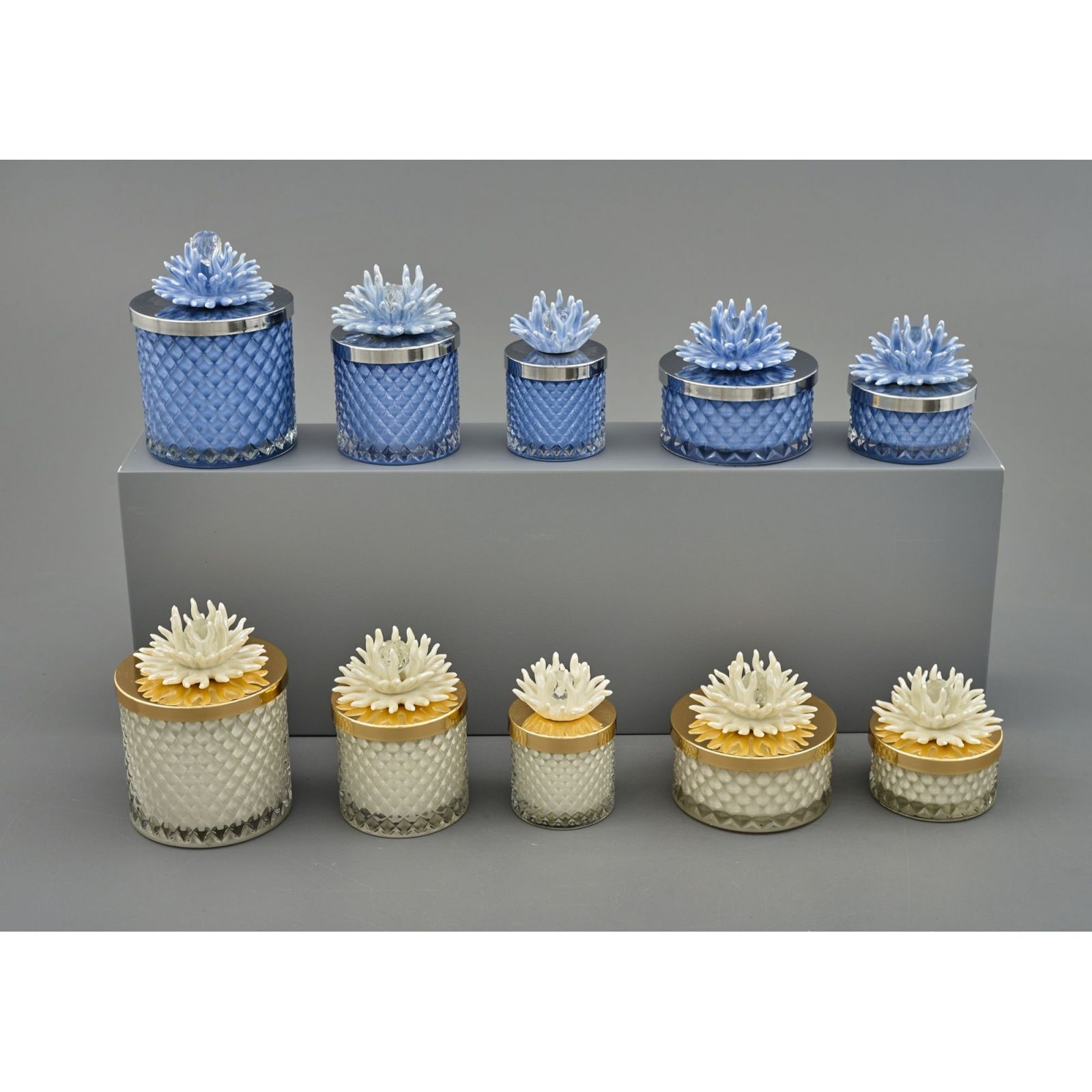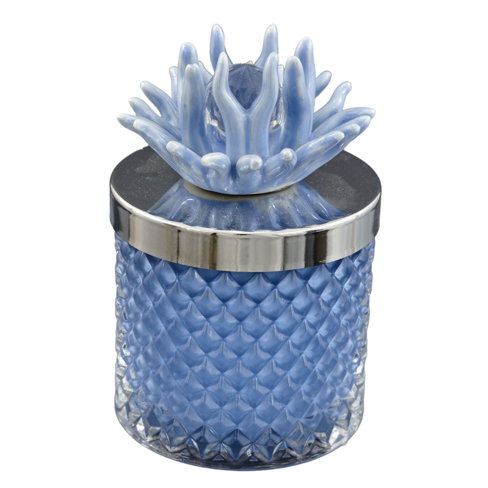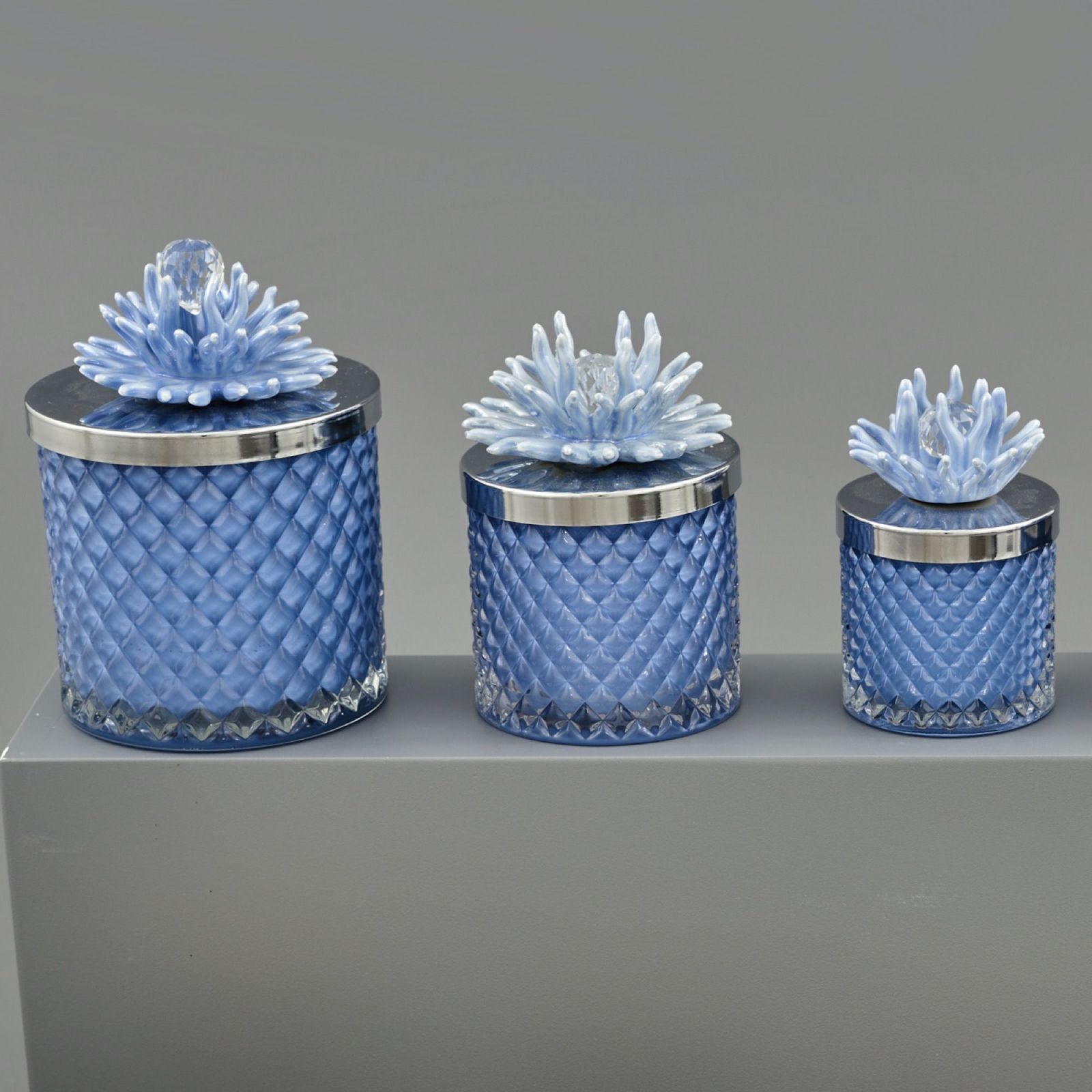 Disponibile in due pratiche dimensioni, Standard :H.9,5X8,5X8,5CM e Grande: H.11X11X11CM, con un tappo di colore argento e un corallo blu. Ogni bomboniera include una elegante scatola regalo