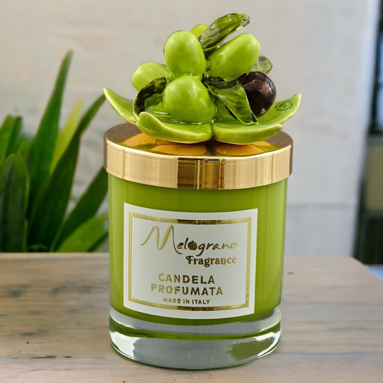 Scegli l'eleganza e lo stile di questa candela profumata con tappo oro e decorazione con ramoscello di ulivo e olive e regala un'esperienza unica ai tuoi invitati. Una bomboniera particolare e ricercata in grado di rendere indimenticabile ogni momento.