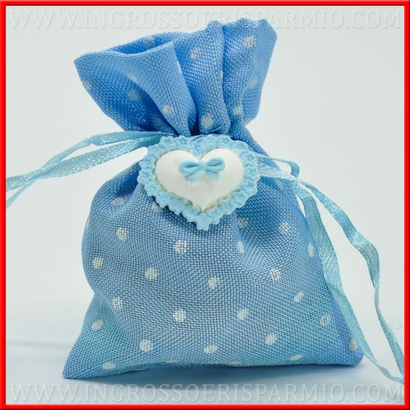 Il nostro laboratorio propone una soluzione già pronta per essere regalata, composta da sacchetto in cotone azzurro con pois bianchi al quale abbiamo applicato il gessetto cuore, completo di 5 confetti Crispo.