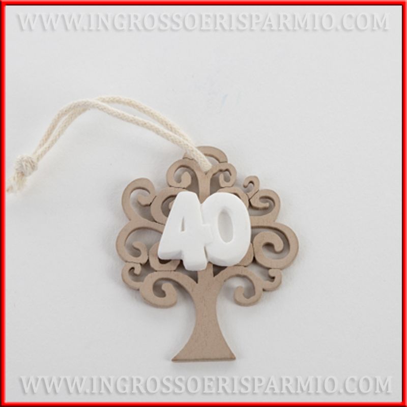 Bomboniere in legno albero della vita con decorazioni in gesso bianco a forma di numero 40, applicati al centro dell'albero. Incluso appendino in corda.