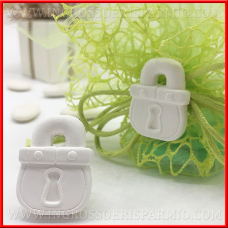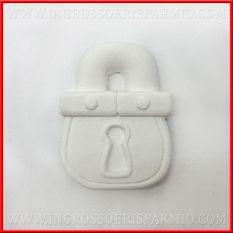 Bomboniere lucchetto in gesso bianco, con dettaglio toppa e manico. Da utilizzare come applicazioni e accessori per confezioni di vario tipo.