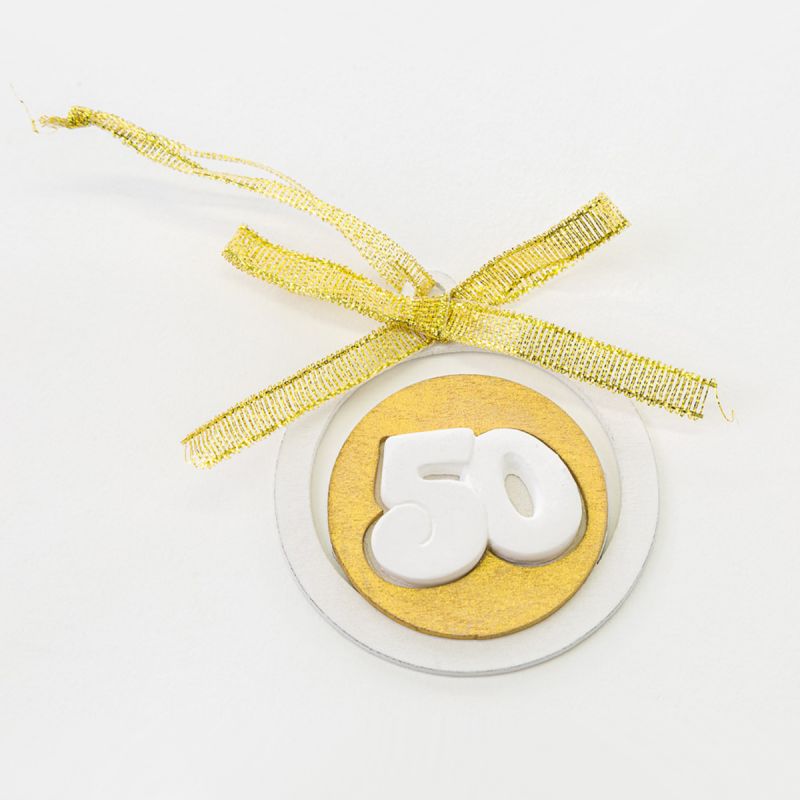 Decorazioni per bomboniera 50° compleanno o anniversario, realizzate in legno e gesso.