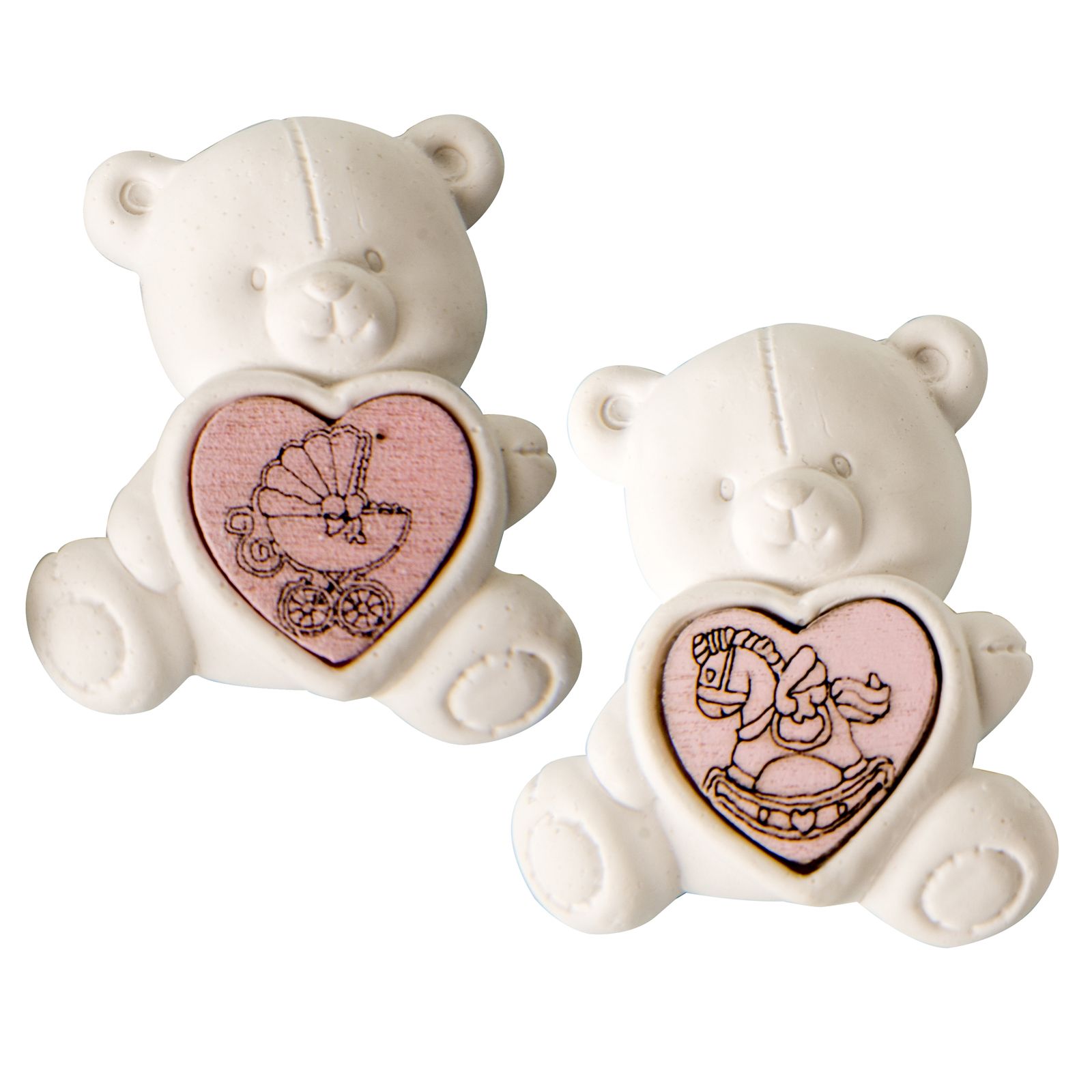 Ti presentiamo i nostri orsetti, dei gessetti decorativi in tonalità bianca, rappresentati in posizione seduta, che racchiudono all'interno un inserto in legno di colore rosa a forma di cuore con il disegno di un carrozzino o di un cavallo a dondolo (soggetti in assortimento, non selezionabili singolarmente).