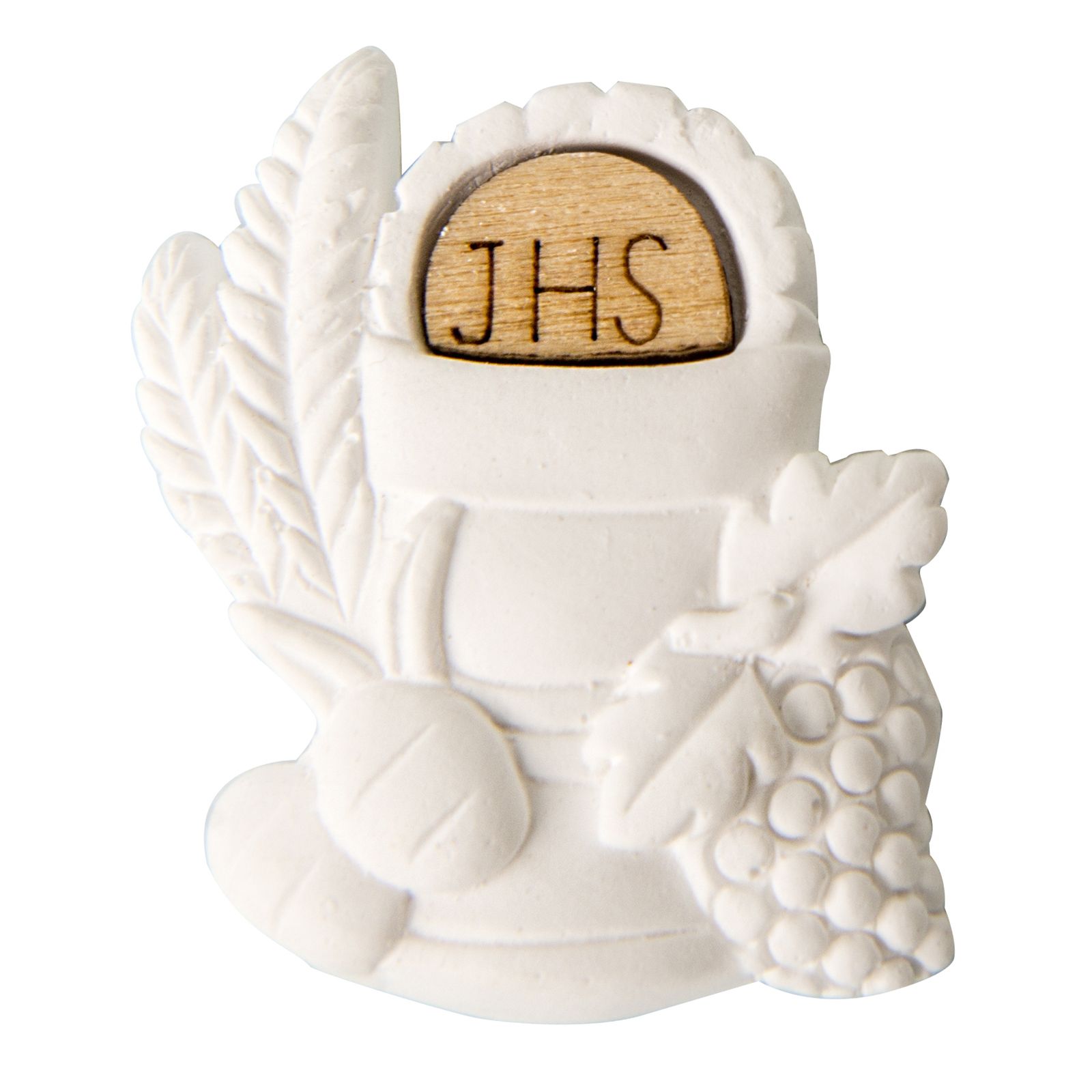 Piccoli gessetti che rappresentano i simboli della comunione: calice, spiga, pane, uva e all'interno una piccola applicazione in legno a forma di ostia con le iniziali "JHS".