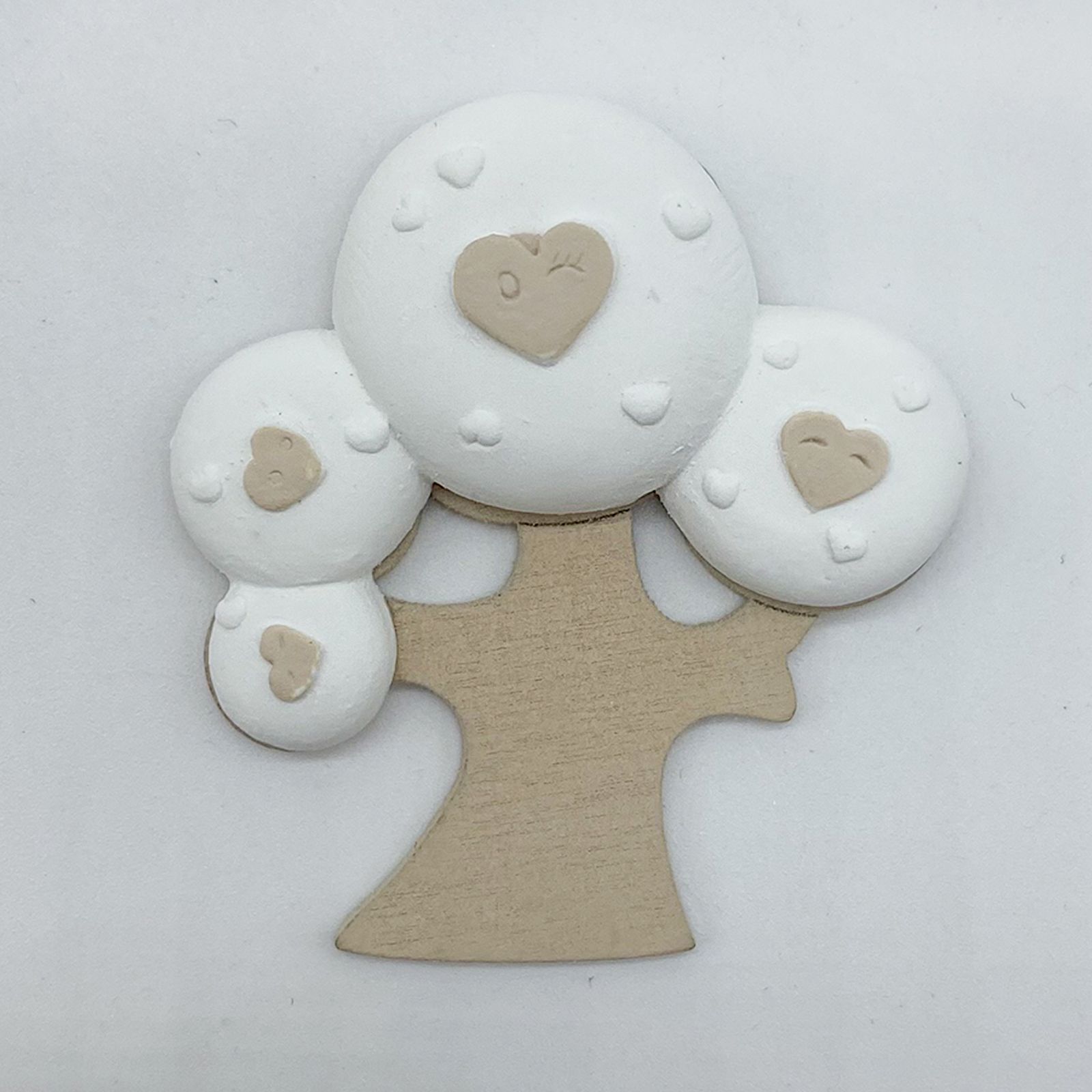 Alberello decorativo in legno con gessetti bianchi per la chioma e piccoli cuoricini tortora da utilizzare come appendino.