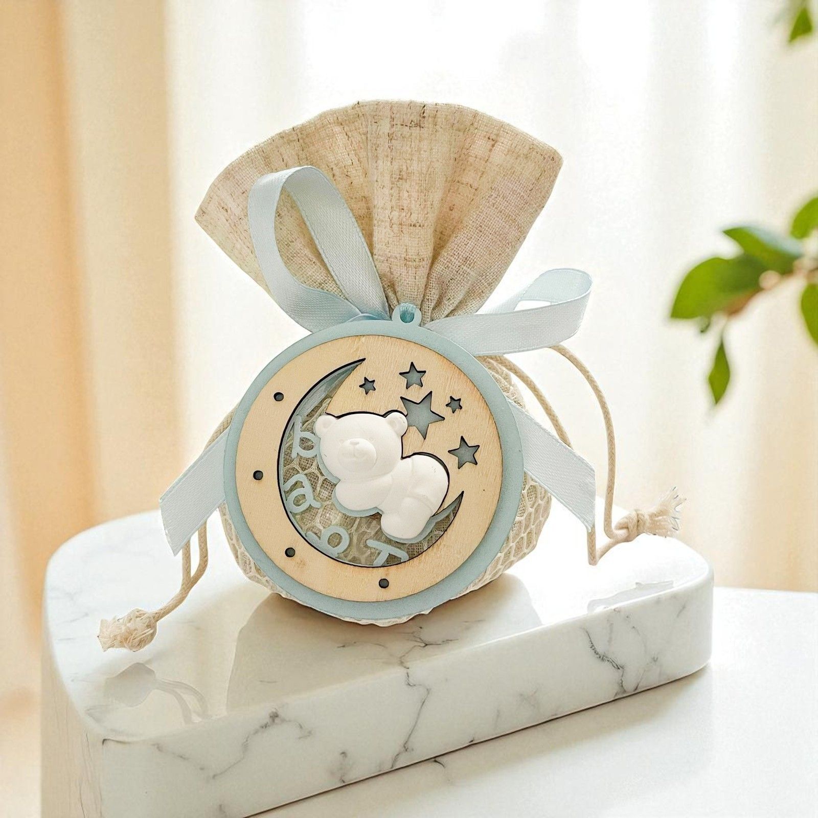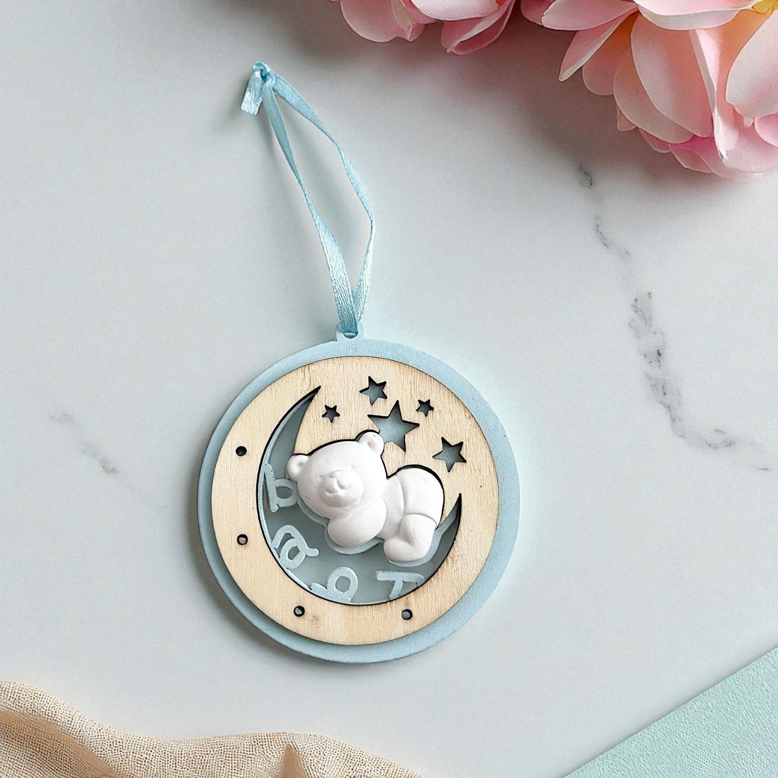 Appendini a medaglione, in legno celeste con mezza luna, stelline incise e scritta "Baby" con piccolo orsetto in gesso.