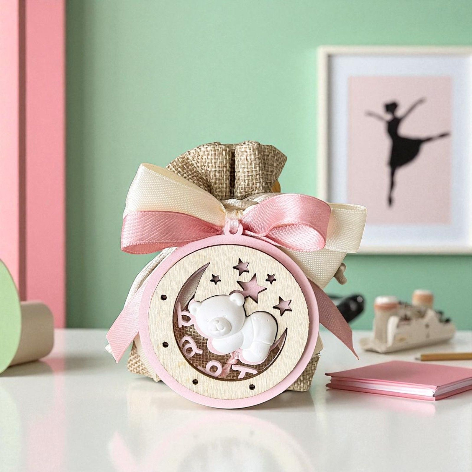 Appendini in legno con luna e stelle in tonalità rosa, con piccolo orsetto in gesso bianco centrale e scritta "Baby", provvisti di asola con nastrino in raso.