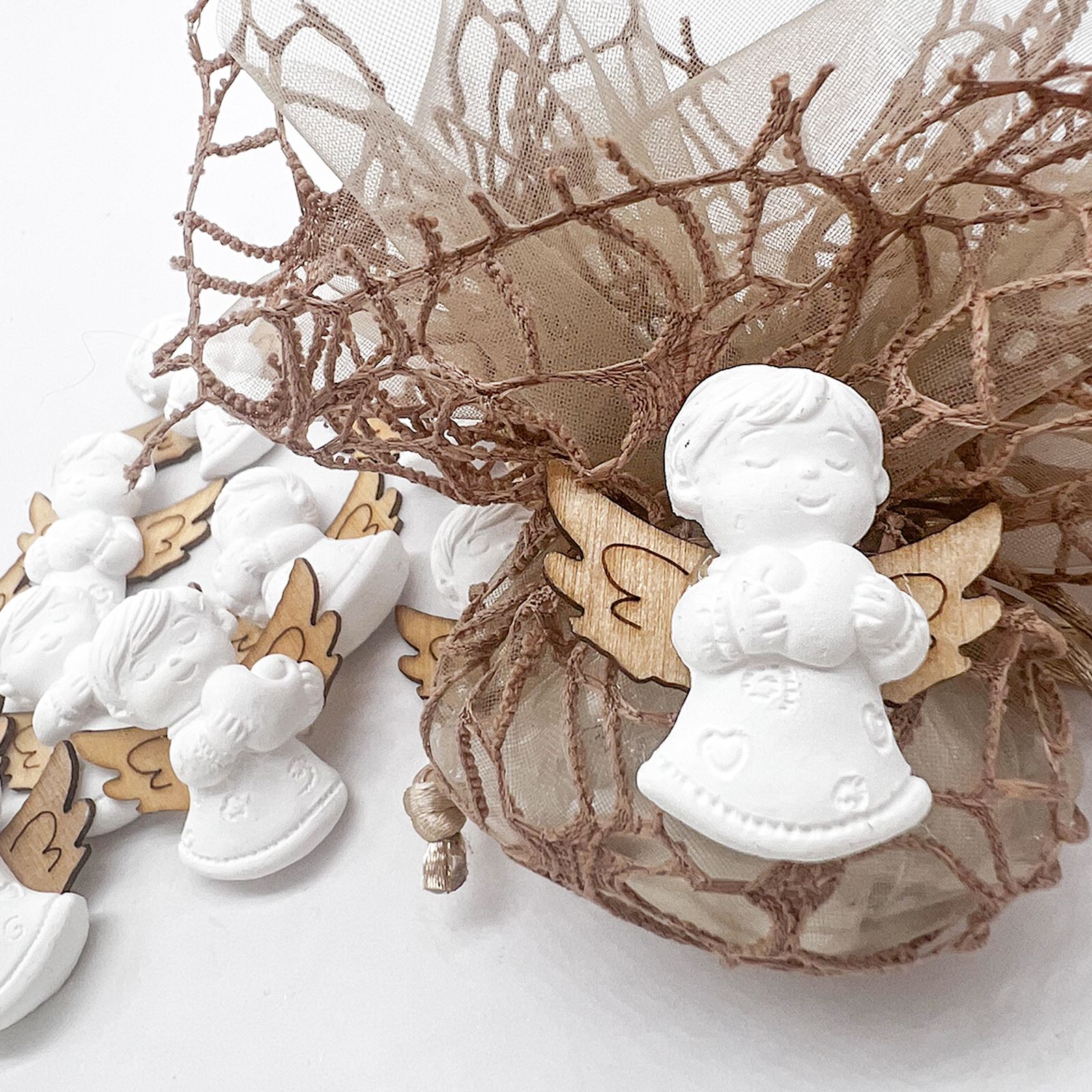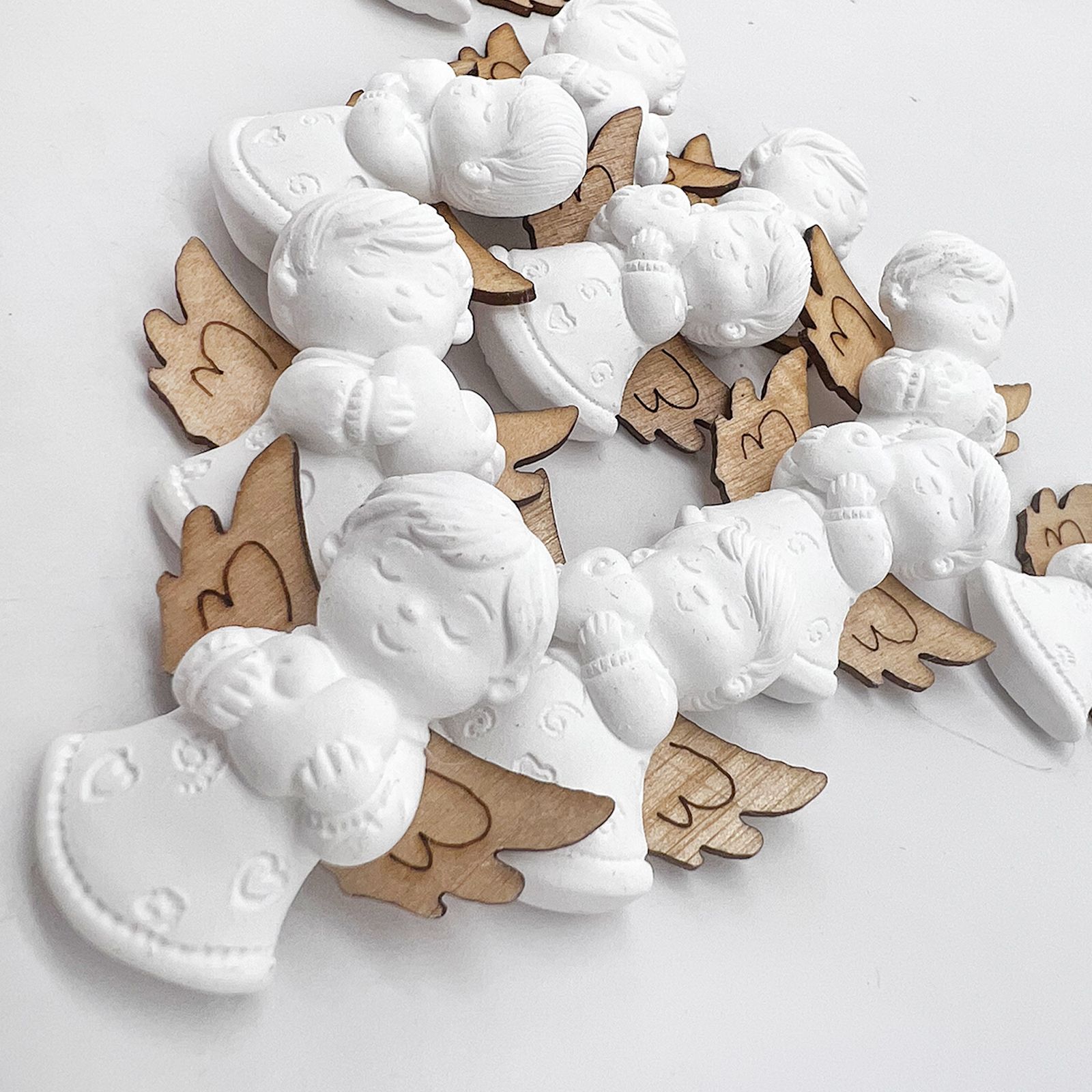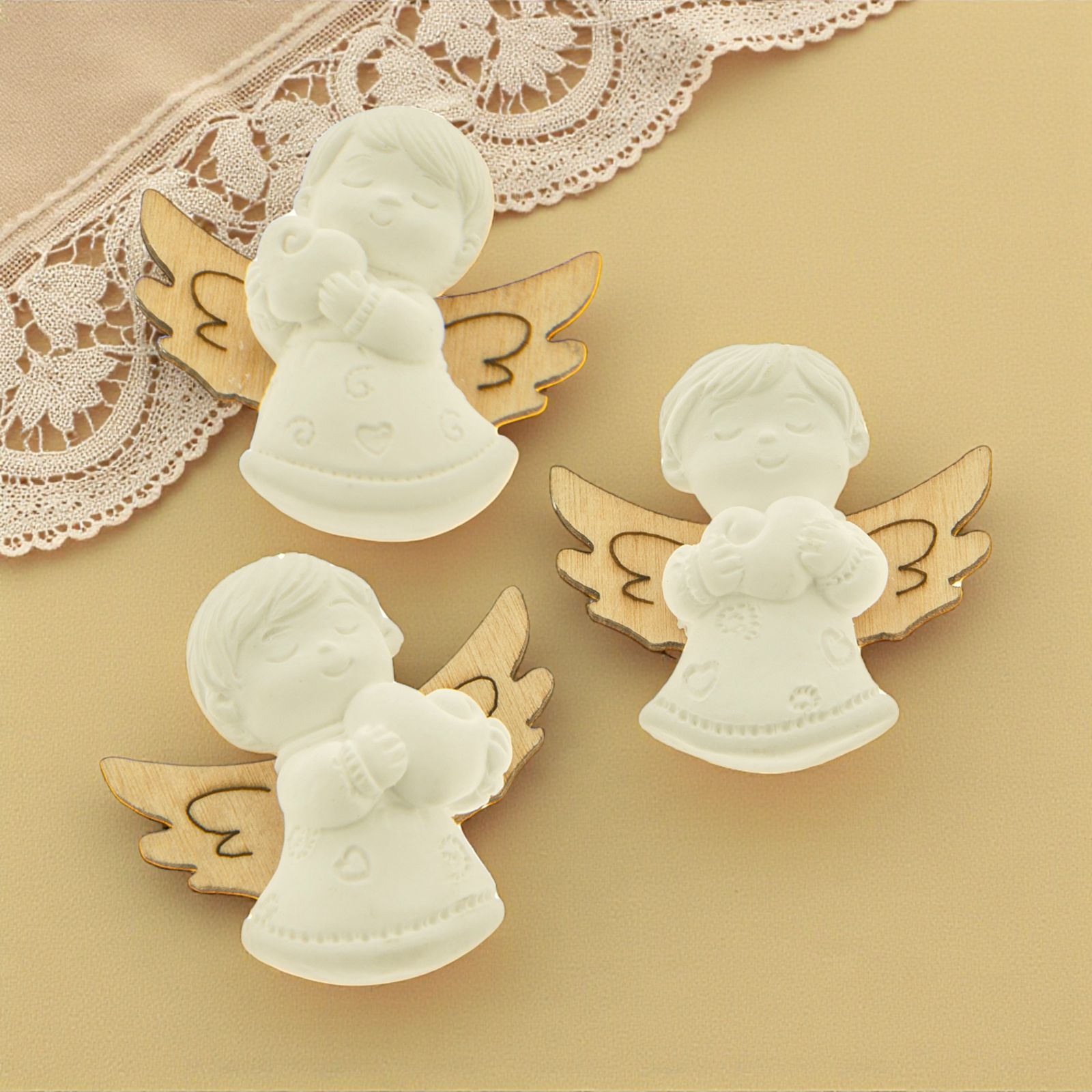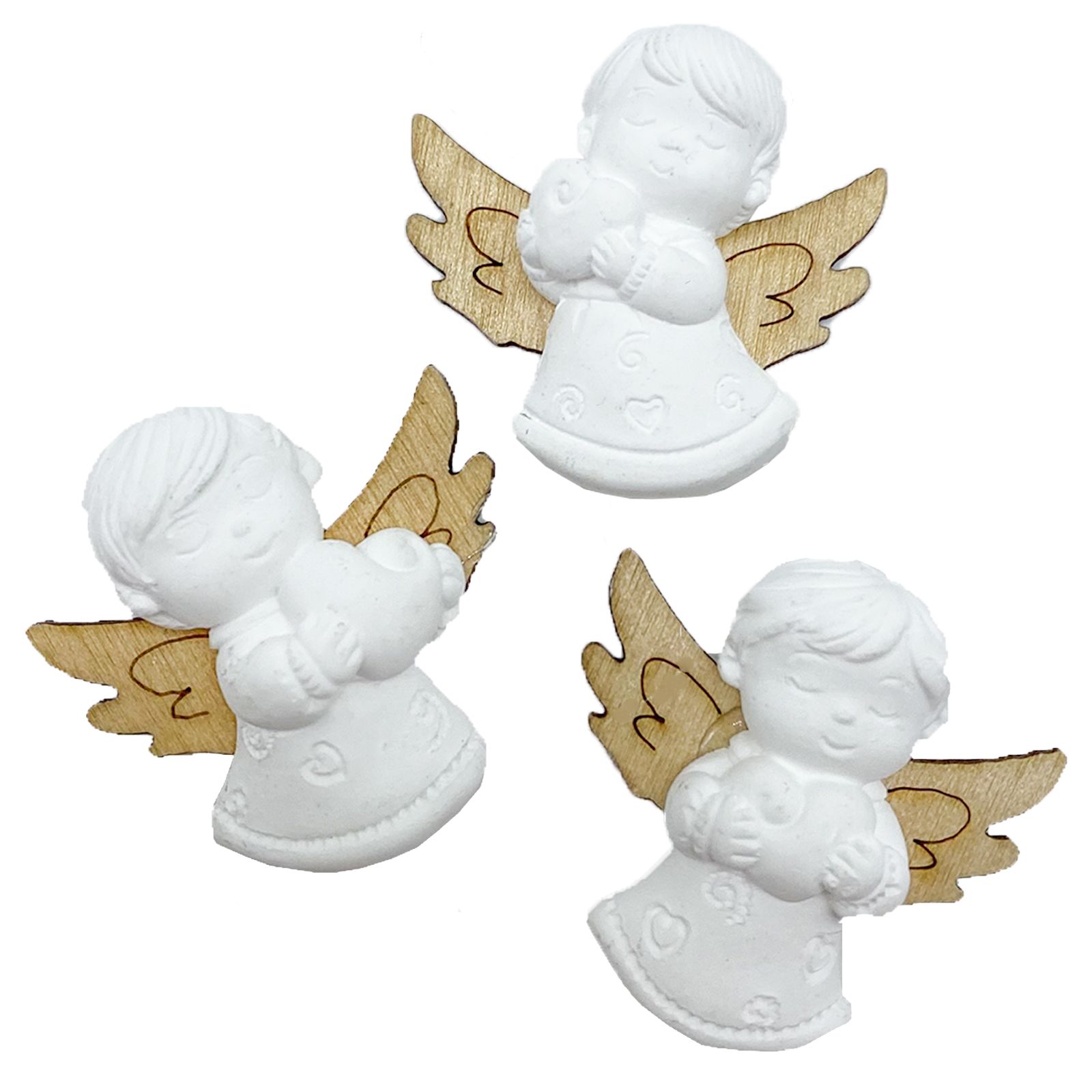 Angioletti in gesso bianco in tre varianti assortite con ali in legno raffigurati mentre stringono tra le mani un cuore.