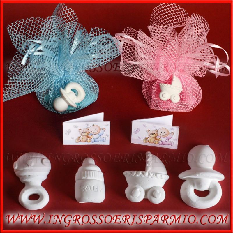 Bomboniere gessetti profumati BIMBI: "biberon, carrozzina, sonaglino, ciuccio" confettate nascita, battesimo bimbo/bimba!
