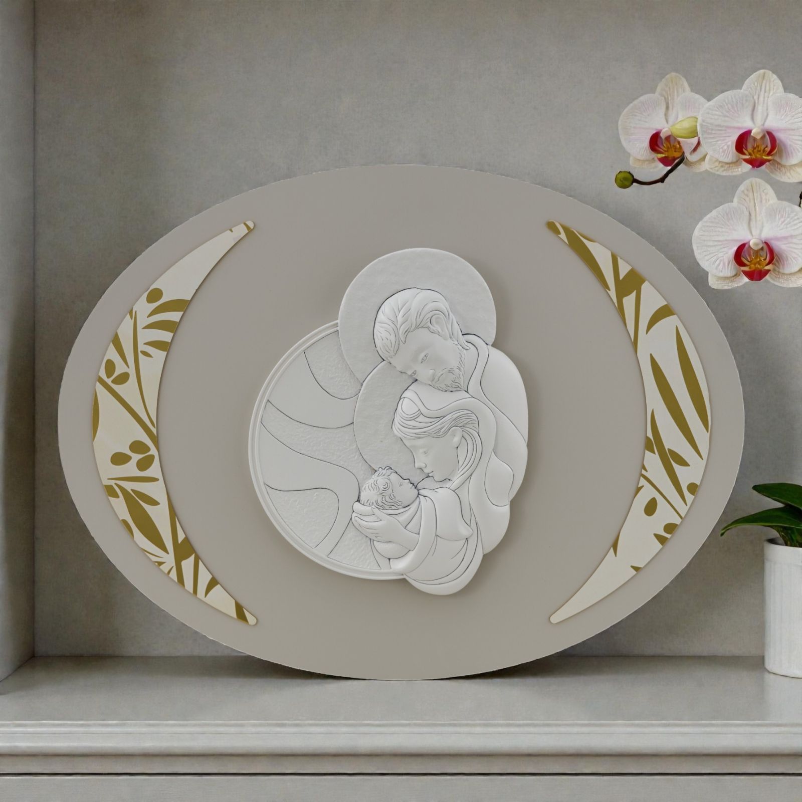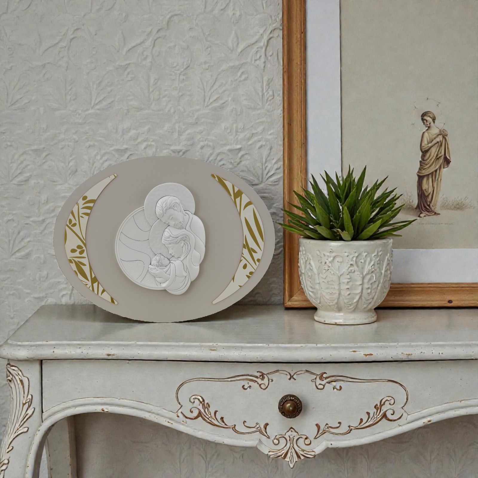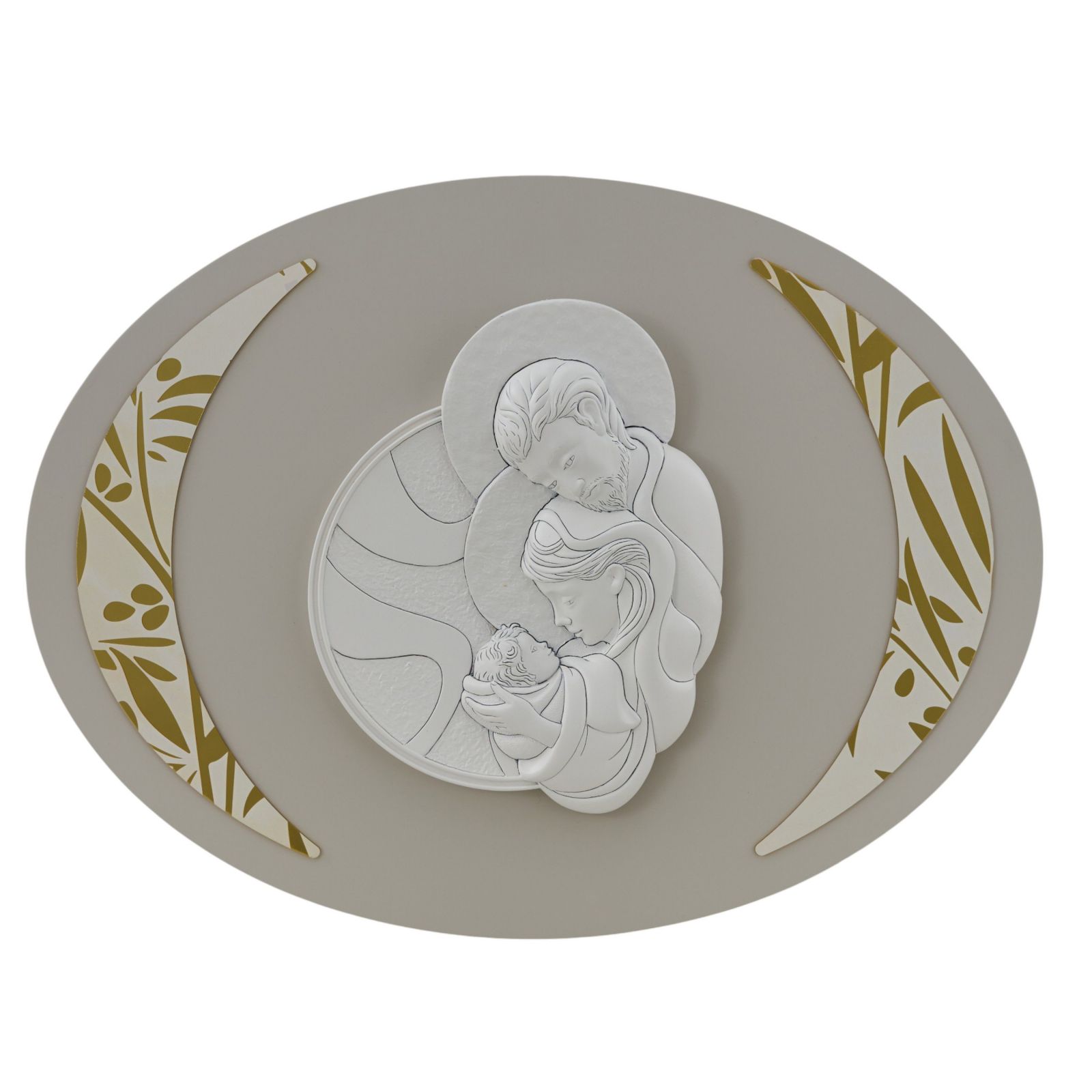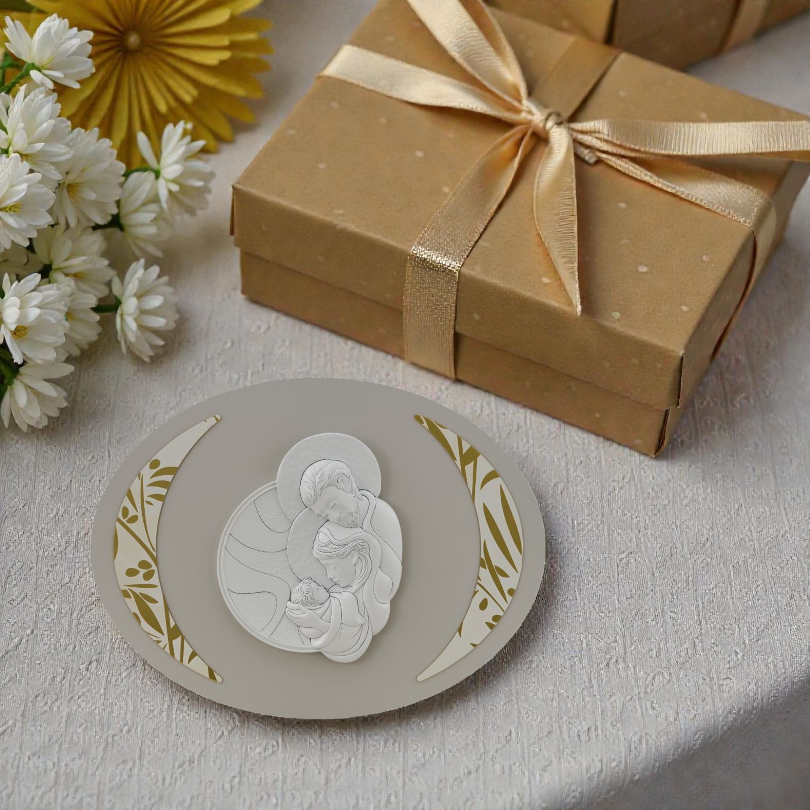 Pensato come bomboniera speciale da donare a padrino, madrina o testimoni, questo capoletto ovale con raffigurazione della Sacra Famiglia è un simbolo profondo di protezione, fede e amore familiare, ideale per celebrare momenti importanti come battesimo, cresima e matrimonio.