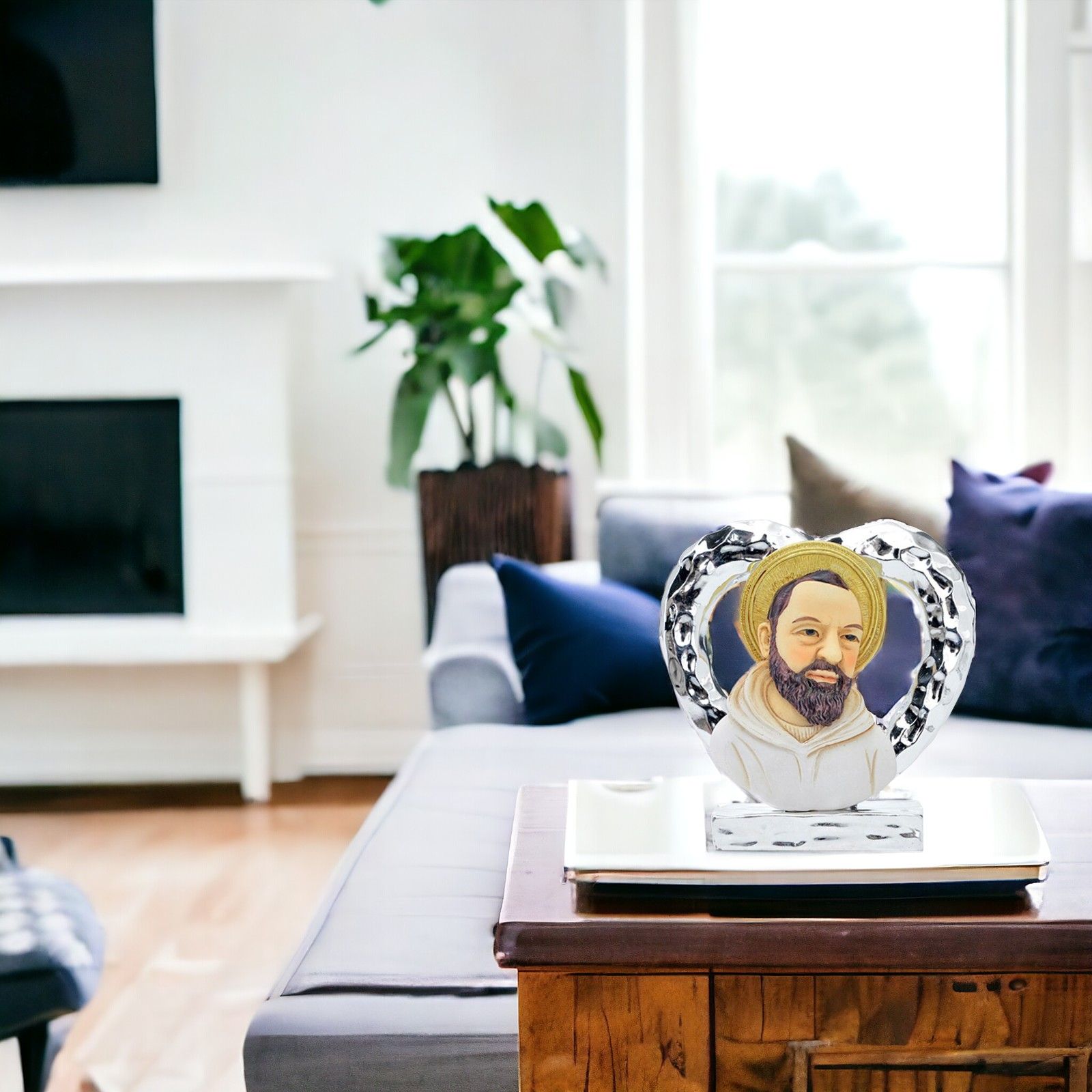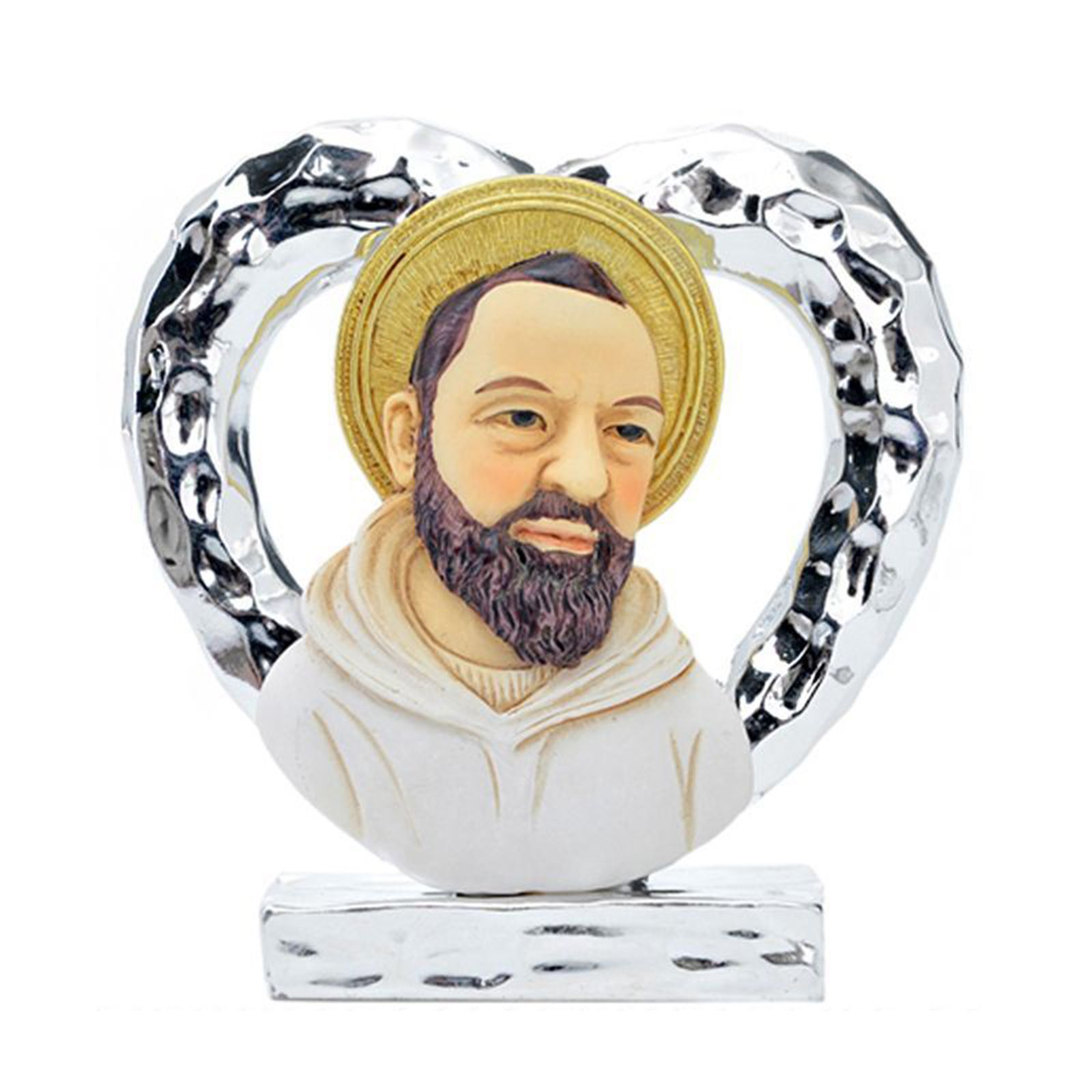 Icone sacre San Pio, composte da sagoma e base in resina argentata e rappresentazione centrale Padre Pio, anch'essa in resina, tonalità di colore avorio.