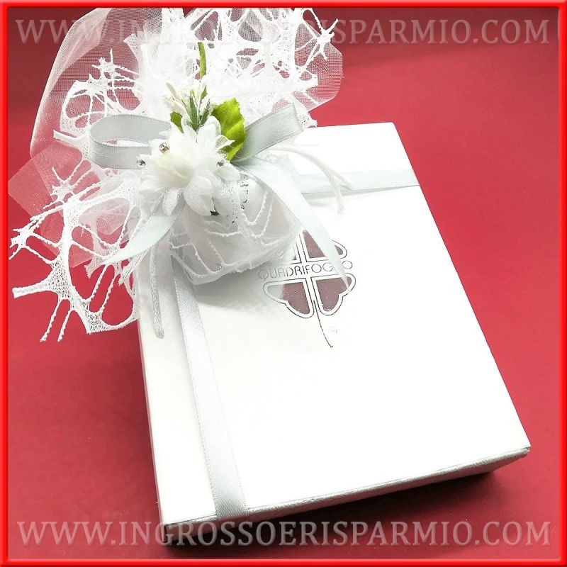 Riceverai i tuoi quadretti battesimo in una scatola regalo bianca e argento a fiammifero, marchiata "Quadrifoglio".
