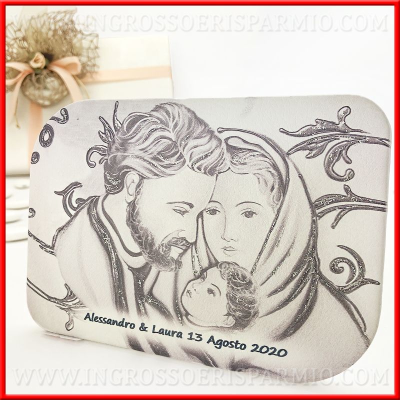 Quadri bomboniere Sacra Famiglia in ecopelle: il supporto del quadro è in legno, mentre la stampa dell'immagine sacra è realizzata su pelle. La raffigurazione è stampata sui toni del grigio/argento ed impreziosita glitter argentati. Ogni quadro Sacra Famiglia può essere applicato al muro o tenuto in appoggio, grazie alla presenza sia di un foro che di un piede d'appoggio.