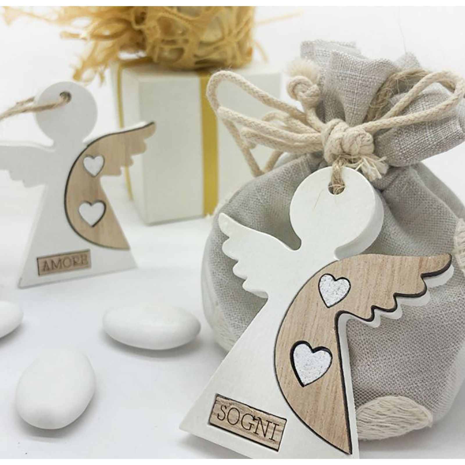 Ordina online questi ciondoli angelo in legno: possibilità di richiedere confezioni già pronte con tulle e confetti!
