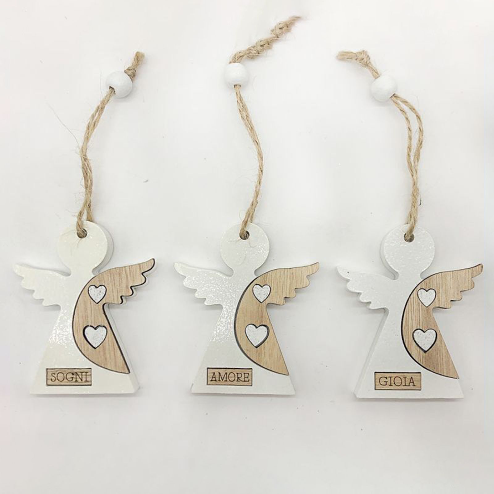 Sagoma angeli stilizzati in legno bianco e color naturale, decorati con cuori e parole "Sogni" "Amore" e "Gioia". 3 modelli assortiti - prezzo unitario. Forniti di appendino in corda/spago.