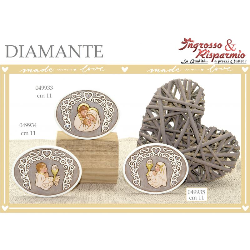 Quadretto in resina da tavolo, di forma ovale, con rappresentazione di un bambino a mani giunte in preghiera dinanzi ad un calice dorato con ostia. Decorato da brillantini argentati, che donano un tocco di luce alla bomboniera.