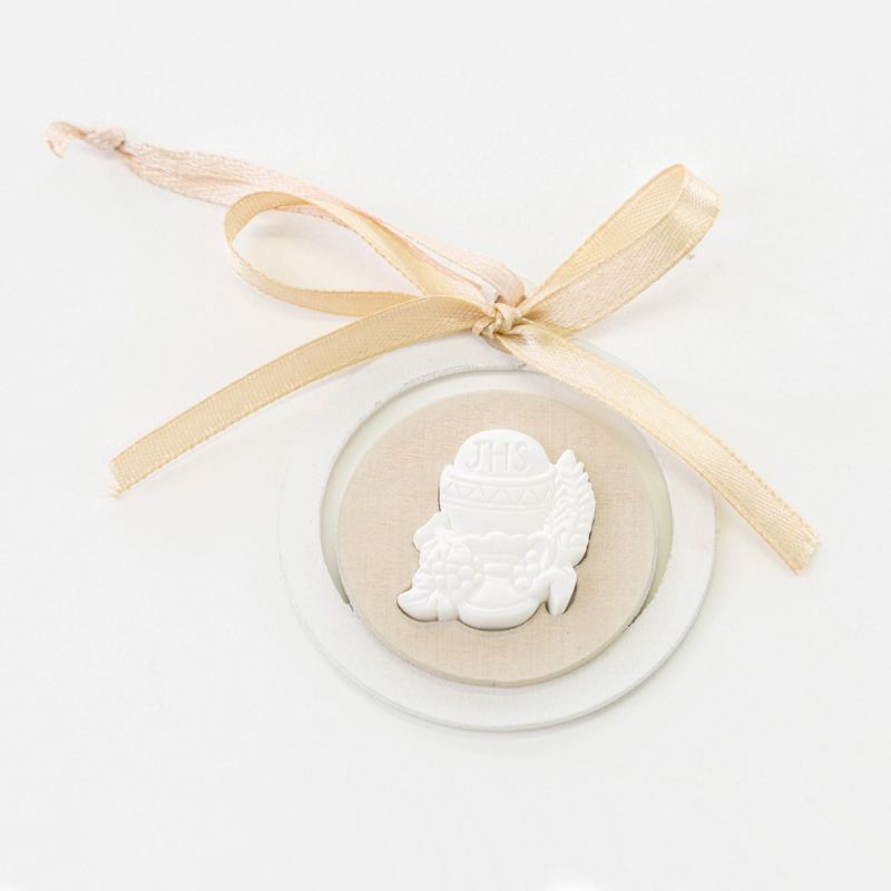 Piccole icone sacre di forma rotonda, composte da un medaglione in legno bianco e tortora e da gessi bomboniere a forma di calice con ostia, applicati al centro. Complete di fiocco e nastrino per poter svolgere la funzione di appendino.