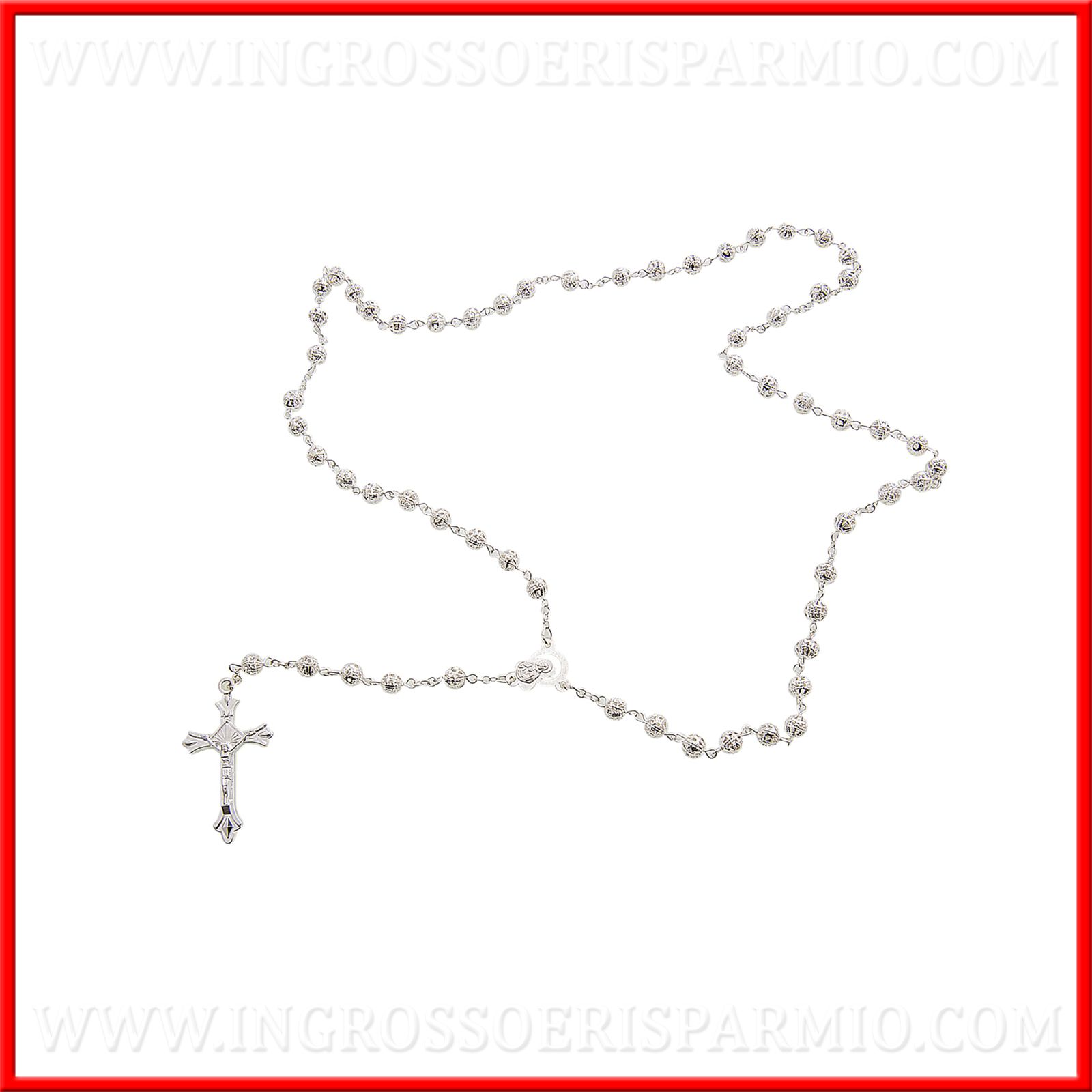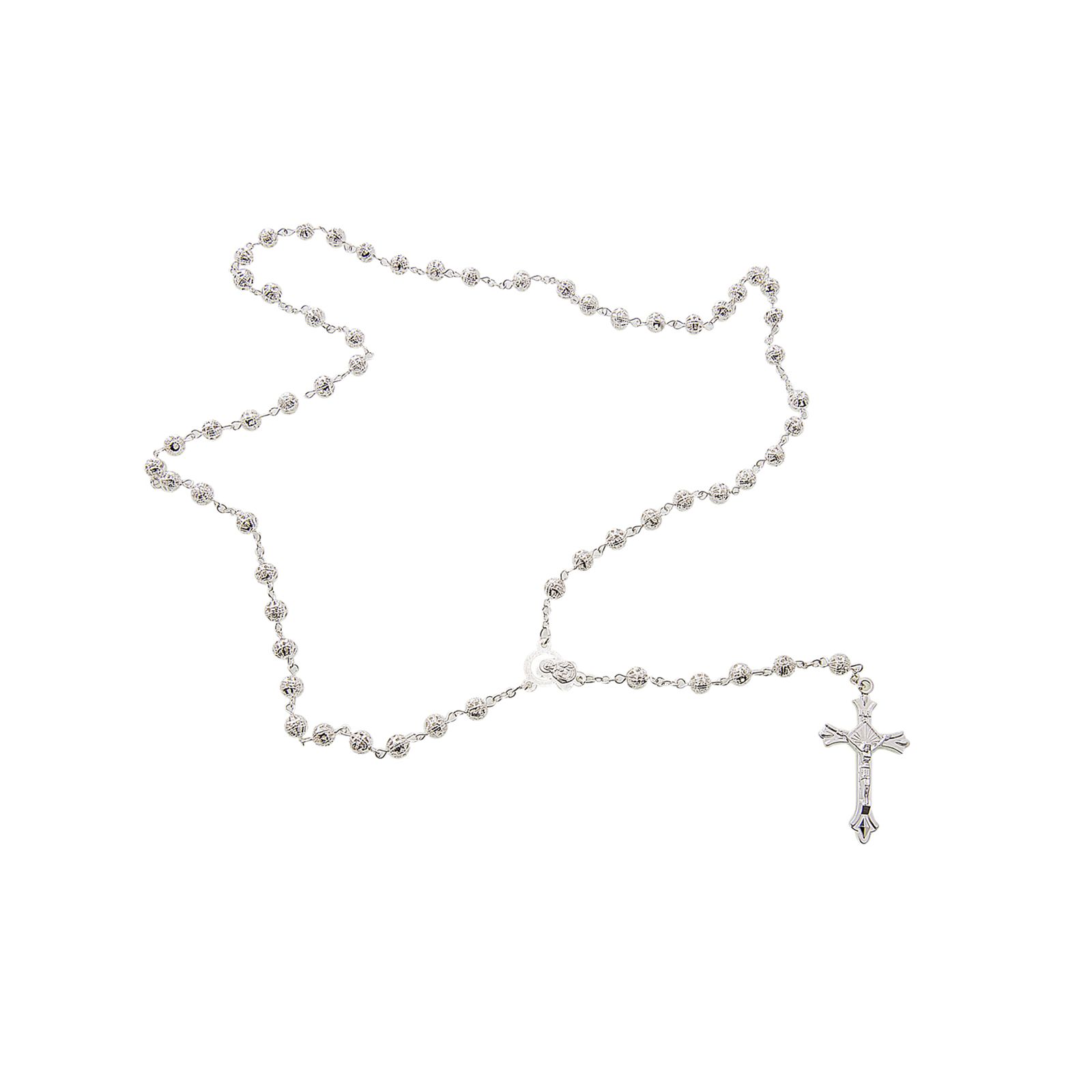 Ecco per te un delicato Rosario, interamente in metallo argentato con grani finemente intarsiato e rappresentazione della Madonna Immacolata e di Gesù crocifisso.