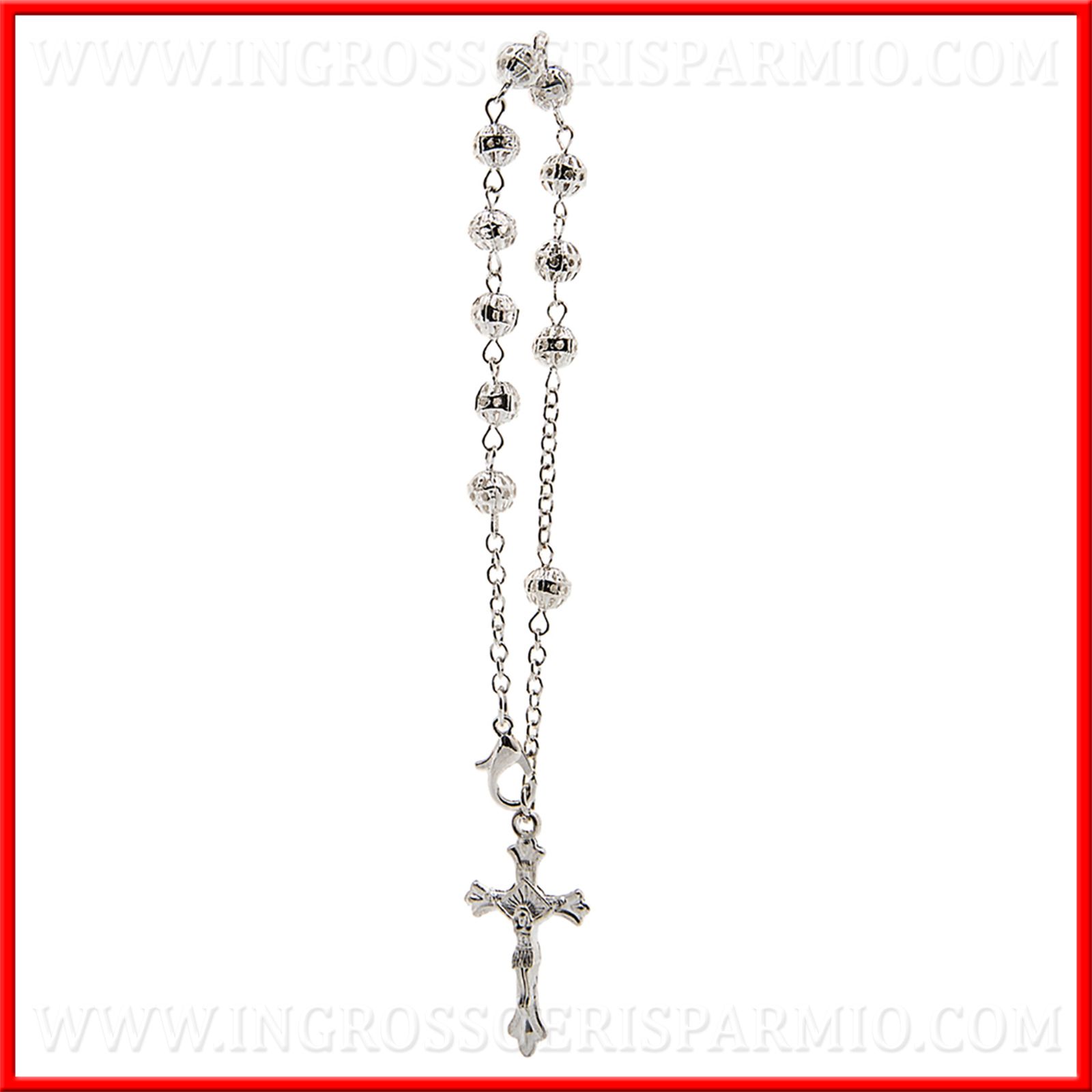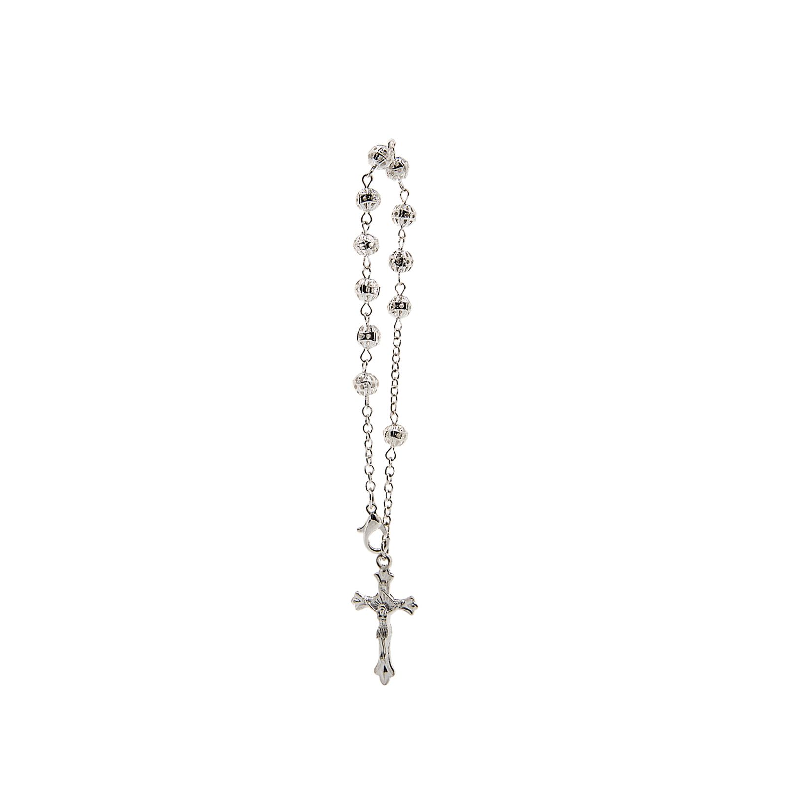 Come questa piccola decina rosario in metallo argentato con lavorazione a grani traforati e piccolo gancio in metallo. La decina termina con la classica raffigurazione di Gesù Crocifisso.