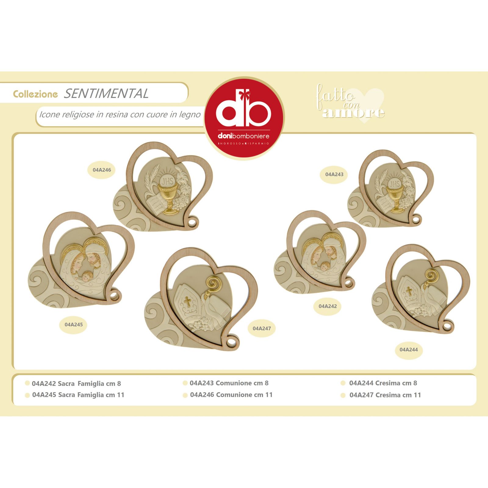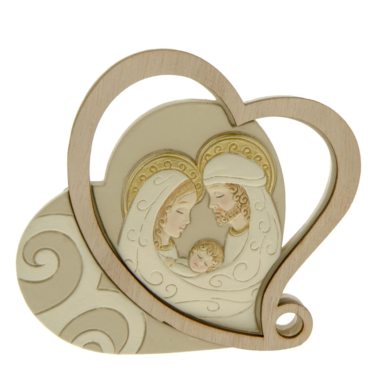 Icone da tavolo con doppio cuore in legno e resina con raffigurazione centrale della Sacra Famiglia, delicatamente colorata con tonalità pastello.