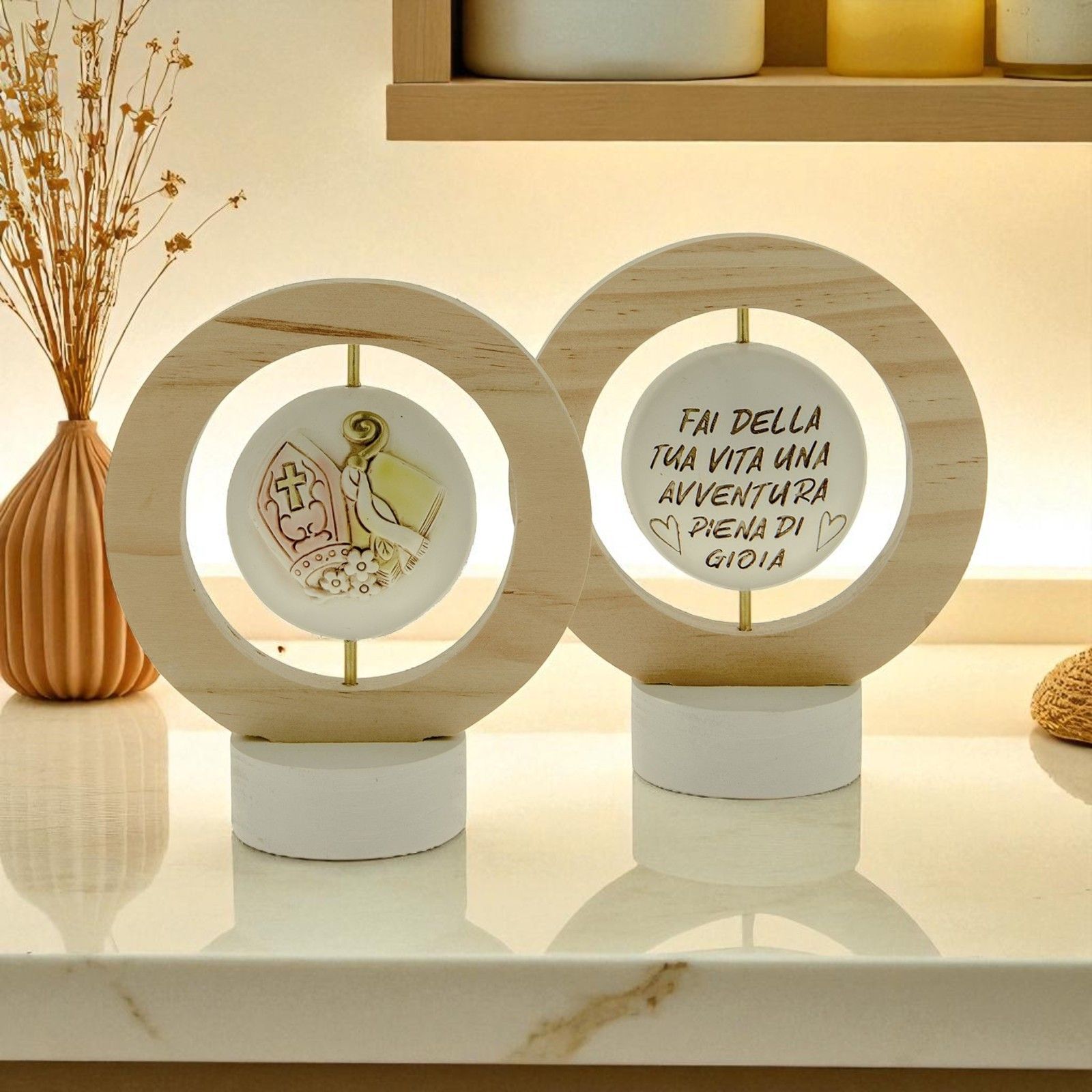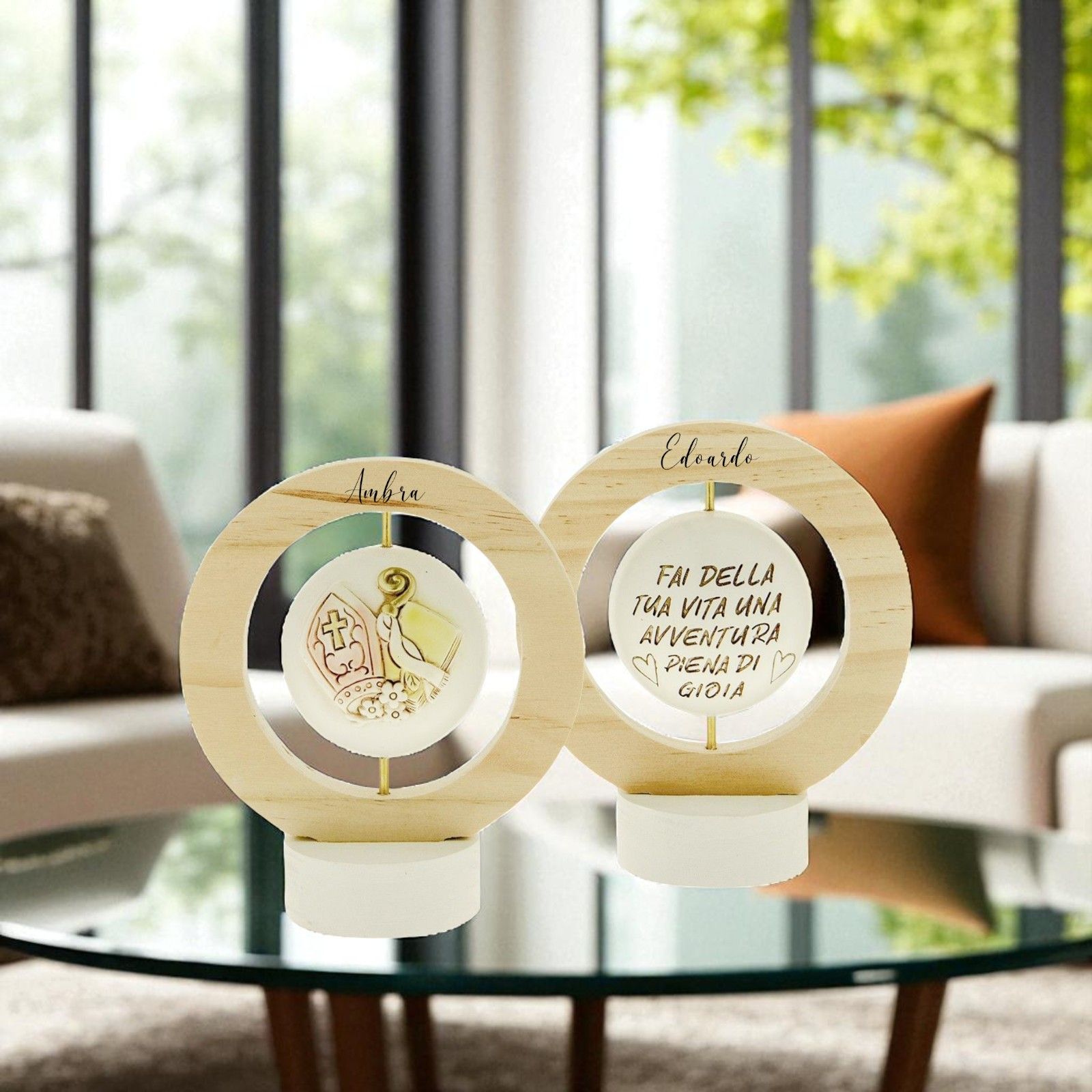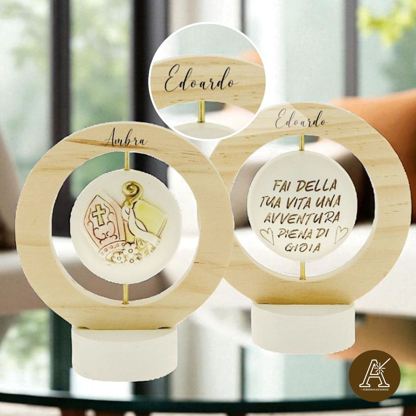 Acquista queste bellissime icone girevoli in resina e legno con cerchio legnoso naturale. L'elemento centrale girevole raffigura da un lato i simboli della Cresima (mitra, pastorale, Vangelo) e dall'altro la frase: "Fai della tua vita una avventura piena di gioia".