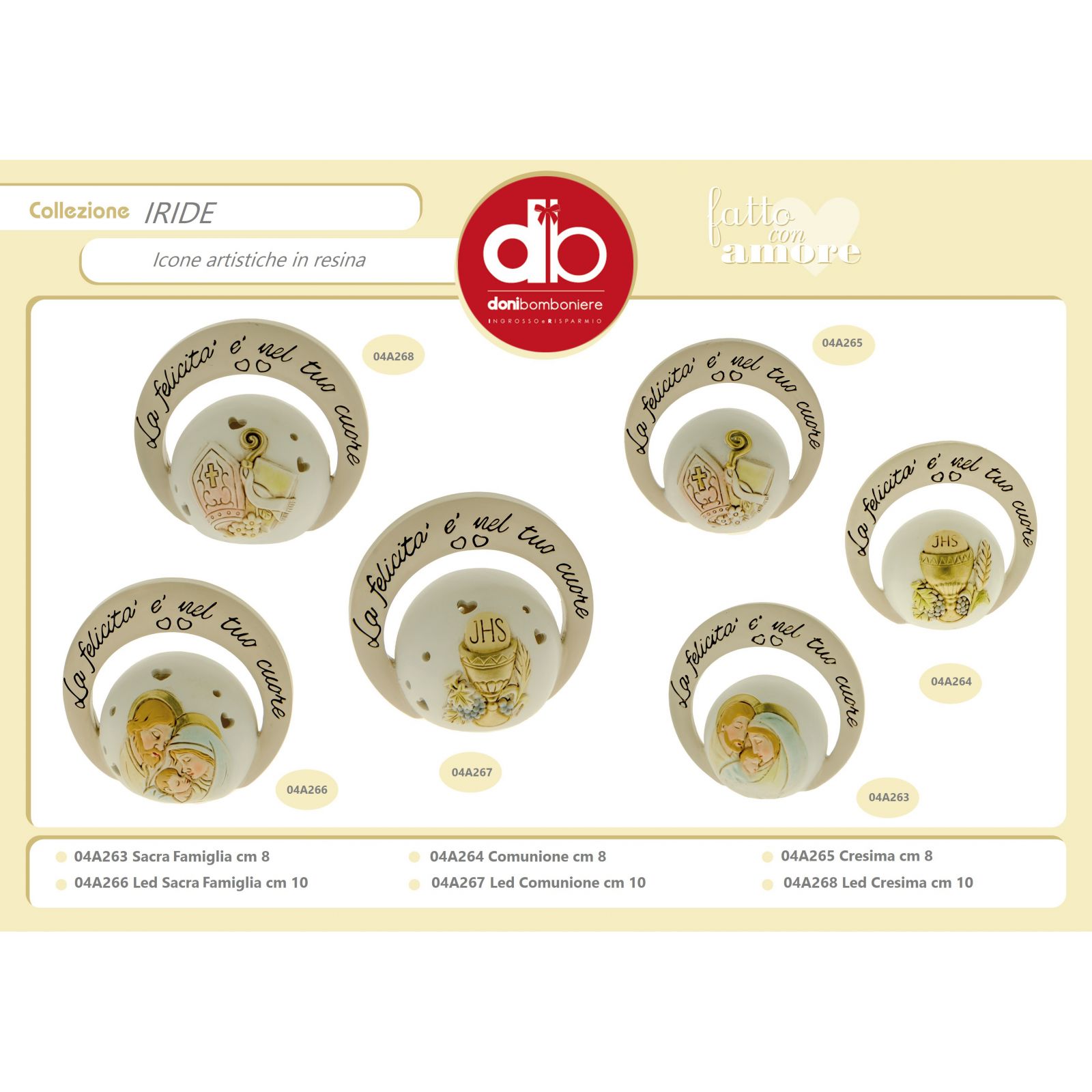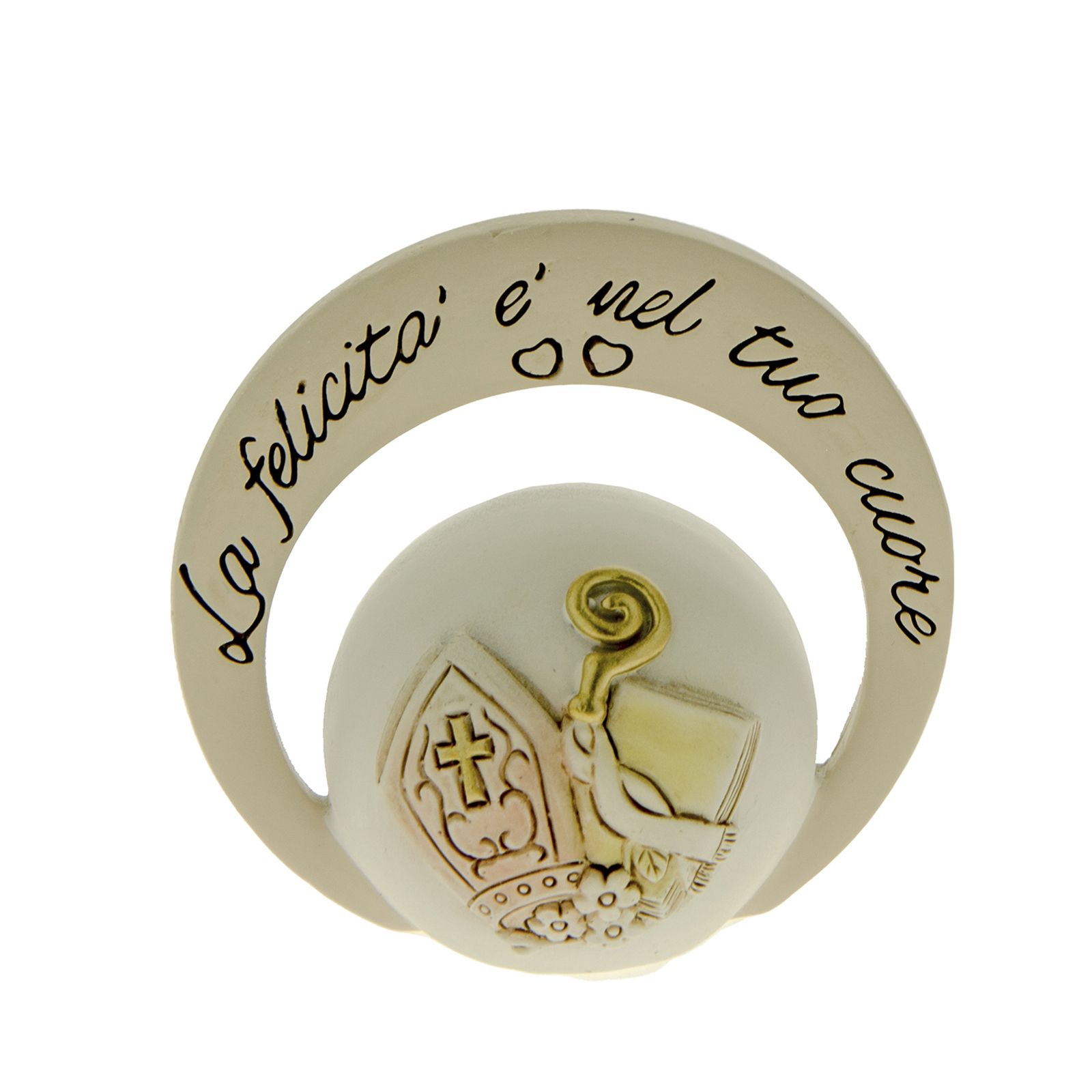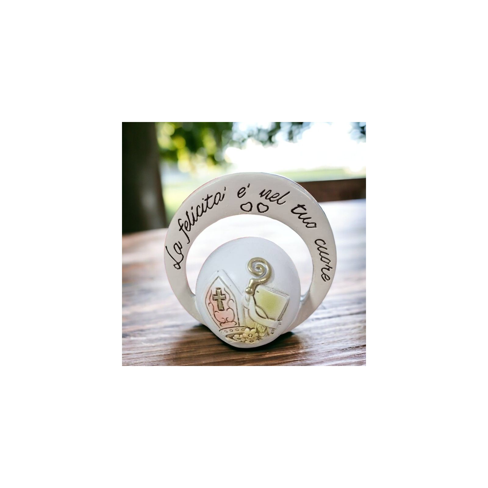 Incantevoli quadretti da tavolo con sfera e arco in resina, in cui sono rappresentati i simboli sacri della Cresima: Vangelo, pastorale e mitra circondati da piccoli fiorellini. Sull'anello esterno è riportata la frase: "La felicità è nel tuo cuore".