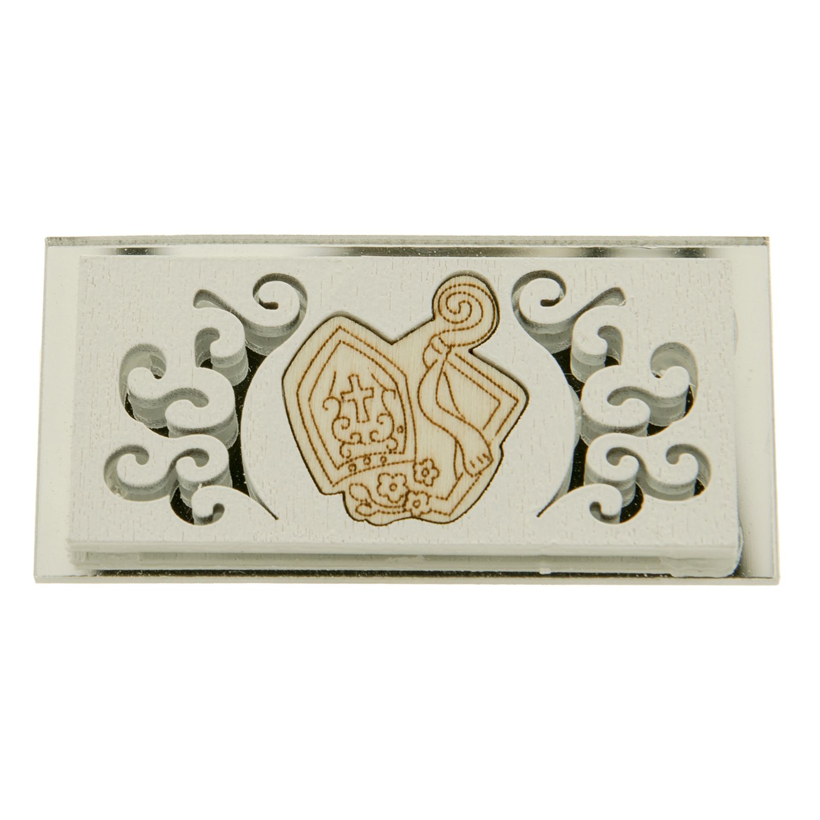 Applicazioni in colore bianco, con effetto intarsiato di forma rettangolare che racchiudono un inserto in legno naturale che raffigura i Simboli Sacri della Cresima, ovvero Mitra e Pastorale.