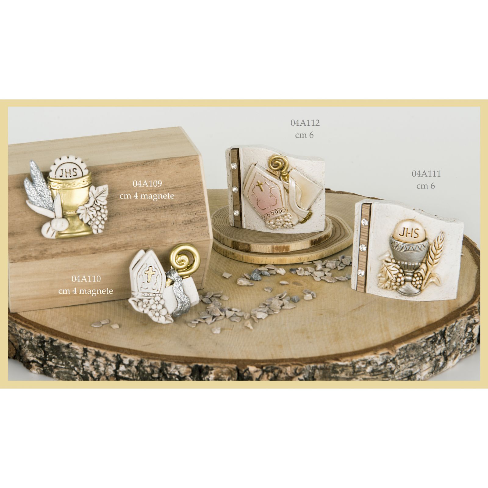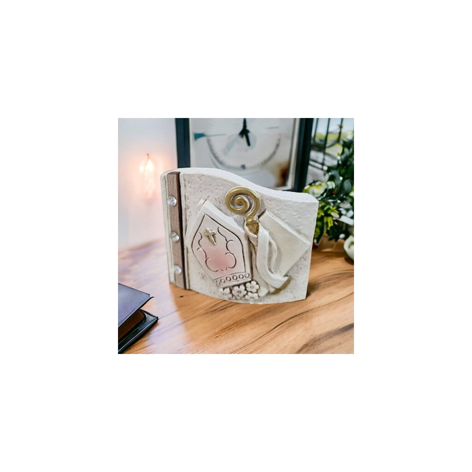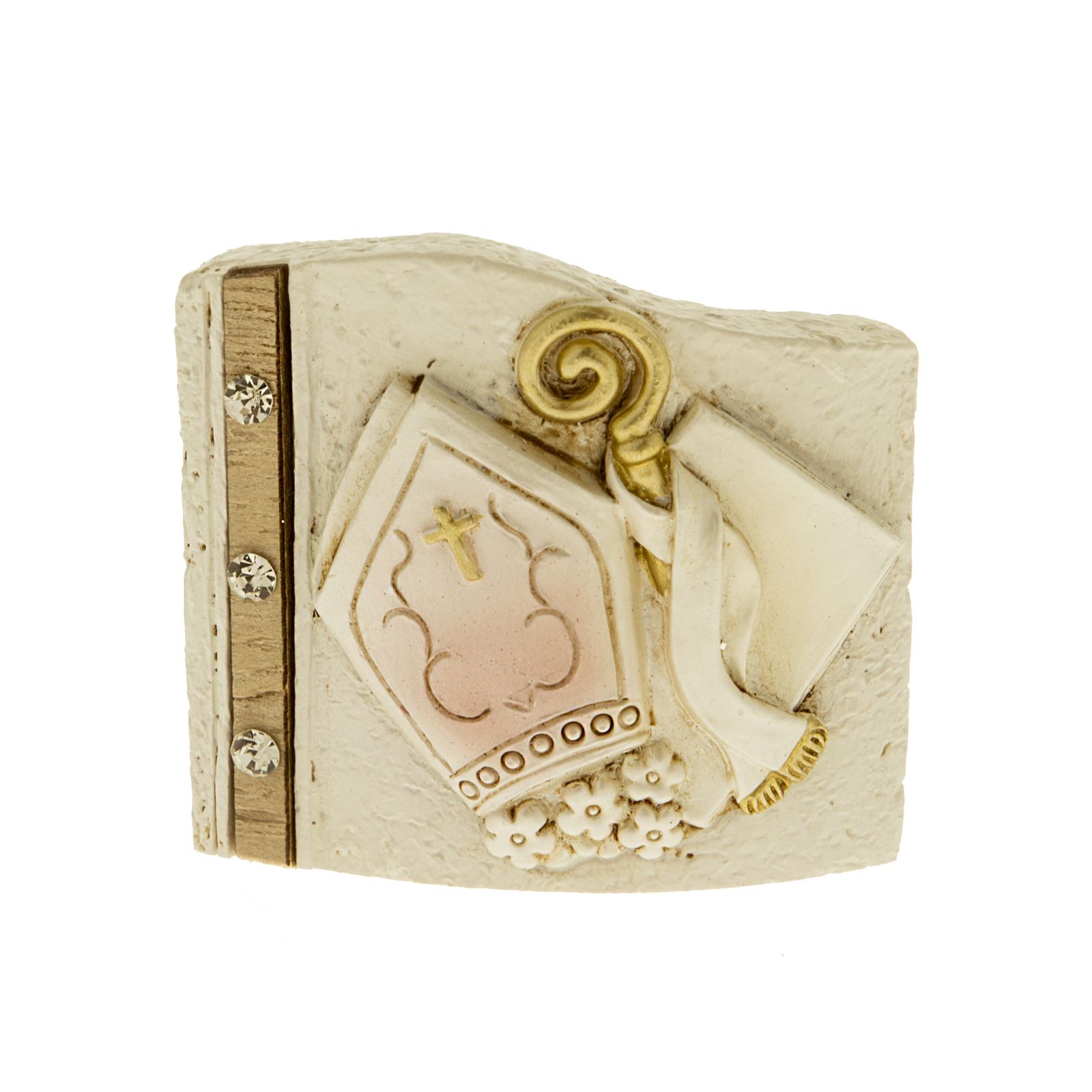 La bomboniera "Simbolo Cresima con Strass" rappresenta un dono significativo e raffinato per celebrare il sacramento della cresima. Realizzata con cura e attenzione ai dettagli, questa icona è realizzata in resina e legno, con eleganti strass posizionati lungo la fascia di legno. L'icona raffigura i simboli tradizionali della cresima, come il cappello vescovo, la stola, il bastone, la bibbia e fiorellini, su uno sfondo bianco decorato con sfumature pastello e tocchi dorati.
