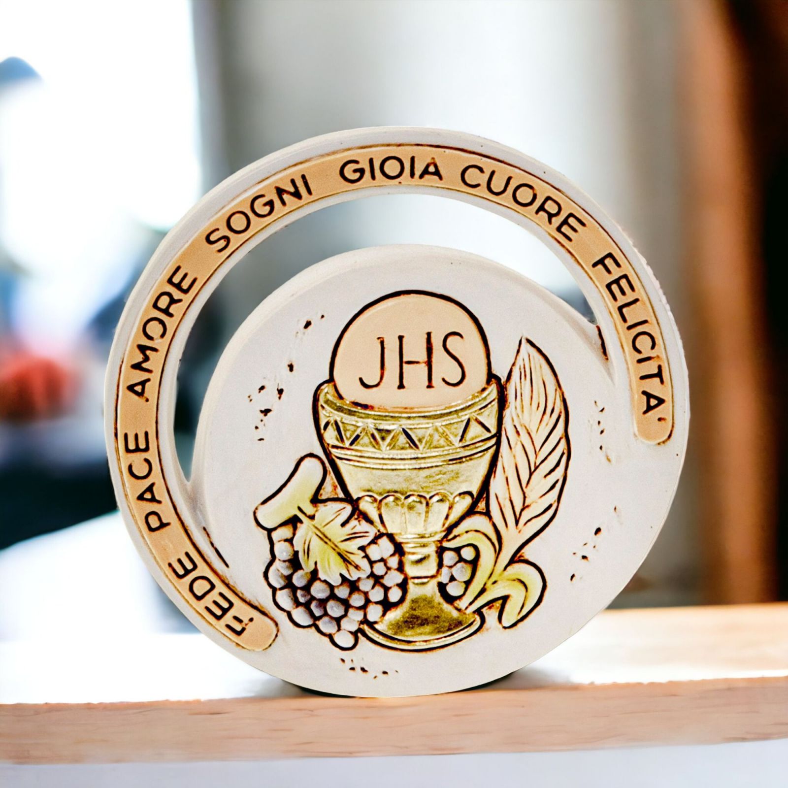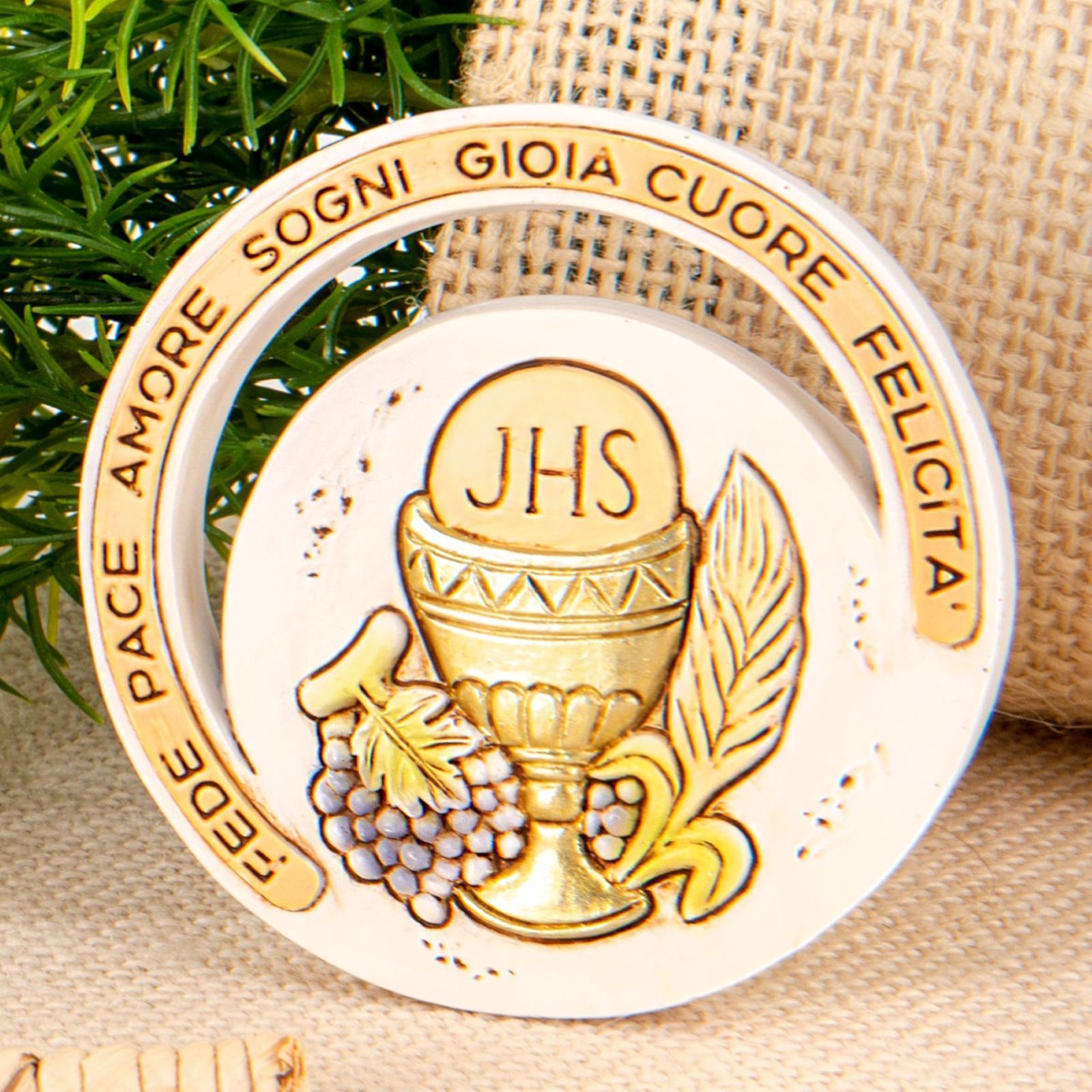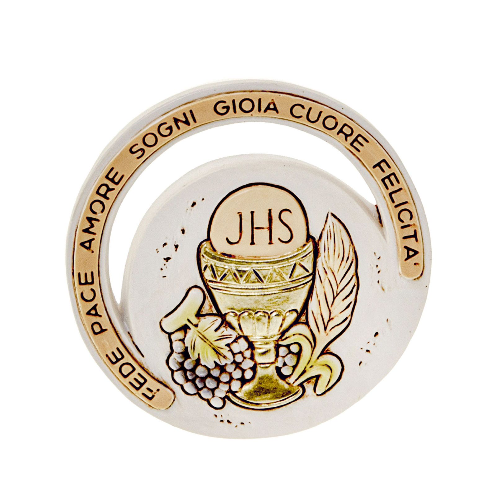 Si tratta di una bomboniera realizzata in resina dalla forma circolare con all'interno la raffigurazione 'dei simboli sacri dell'evento, ostia e calice. Intorno al calice sono raffigurati i simboli del pane, dell'uva, il grano e sul bordo dell'icona ci sono le parole fede, pace, amore, sogni, gioia, cuore e felicità, unendo così in un semplice oggetto i significati più profondi. D