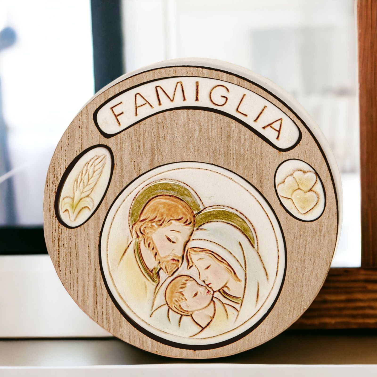 Regala tenerezza e amore con questa bomboniera sacra realizzata con cura e attenzione. La bomboniera con sacra famiglia è un'icona di forma circolare con raffigurazione di Maria, Giuseppe ed il Bambino . L'immagine sacra, incorniciata da un contorno di legno naturale è decorata cn la parola famiglia, una spiga e dei cuori e dona un tocco di arte e originalità ai tuoi regali. La bomboniera, di dimensioni dm 8 cm circa, è realizzata con materiali di resina e legno, di colore bianco e legno naturae. È ideale per eventi come Battesimo, Prima Comunione e Matrimonio ed è un modo dolce per esprimere pensierini e ricordini a chi ami.