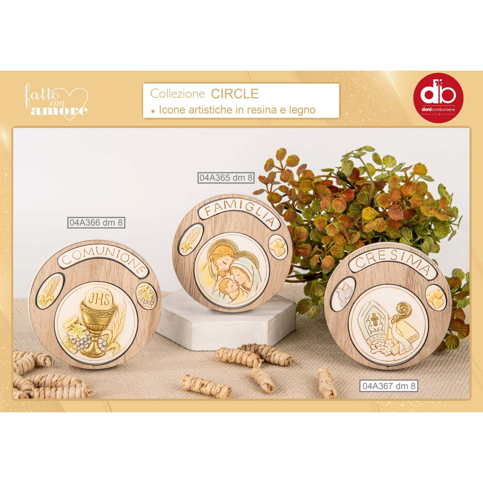 Bomboniera sacra con icona di forma circolare, realizzata in resina e legno. La bomboniera è di colore bianco e raffigura i simboli sacri della Santa Cresima: pastorale, mitra e bibbia. Misura circa 8 cm di diametro e rappresenta un oggetto di tenerezza ed amore per celebrare un evento tanto importante come quello della Santa Cresima. Un regalo unico, che rievoca i momenti più belli e santi della nostra vita. Un pensierino che racchiude quella parte di spiritualità che accompagna i nostri giorni, un'icona artistica che parla al cuore. Un ricordino che ci fa pensare al valore della vita e a quella fede rinnovata ogni giorno.