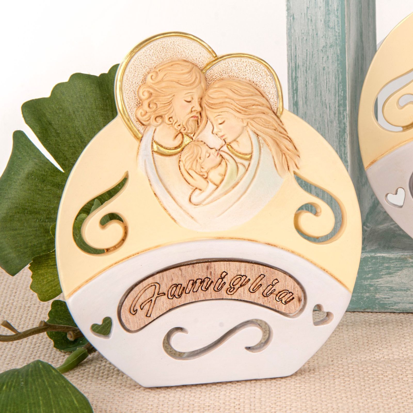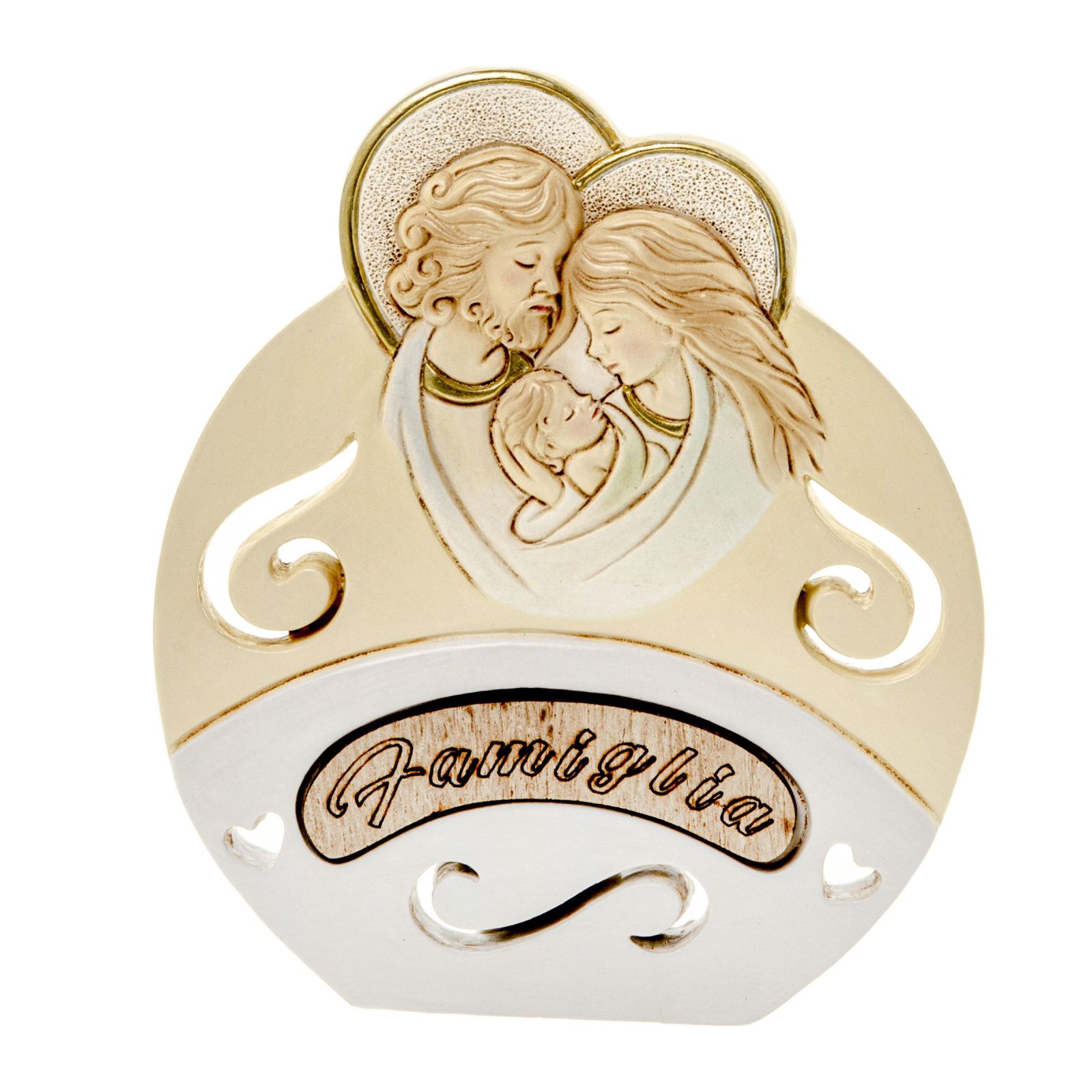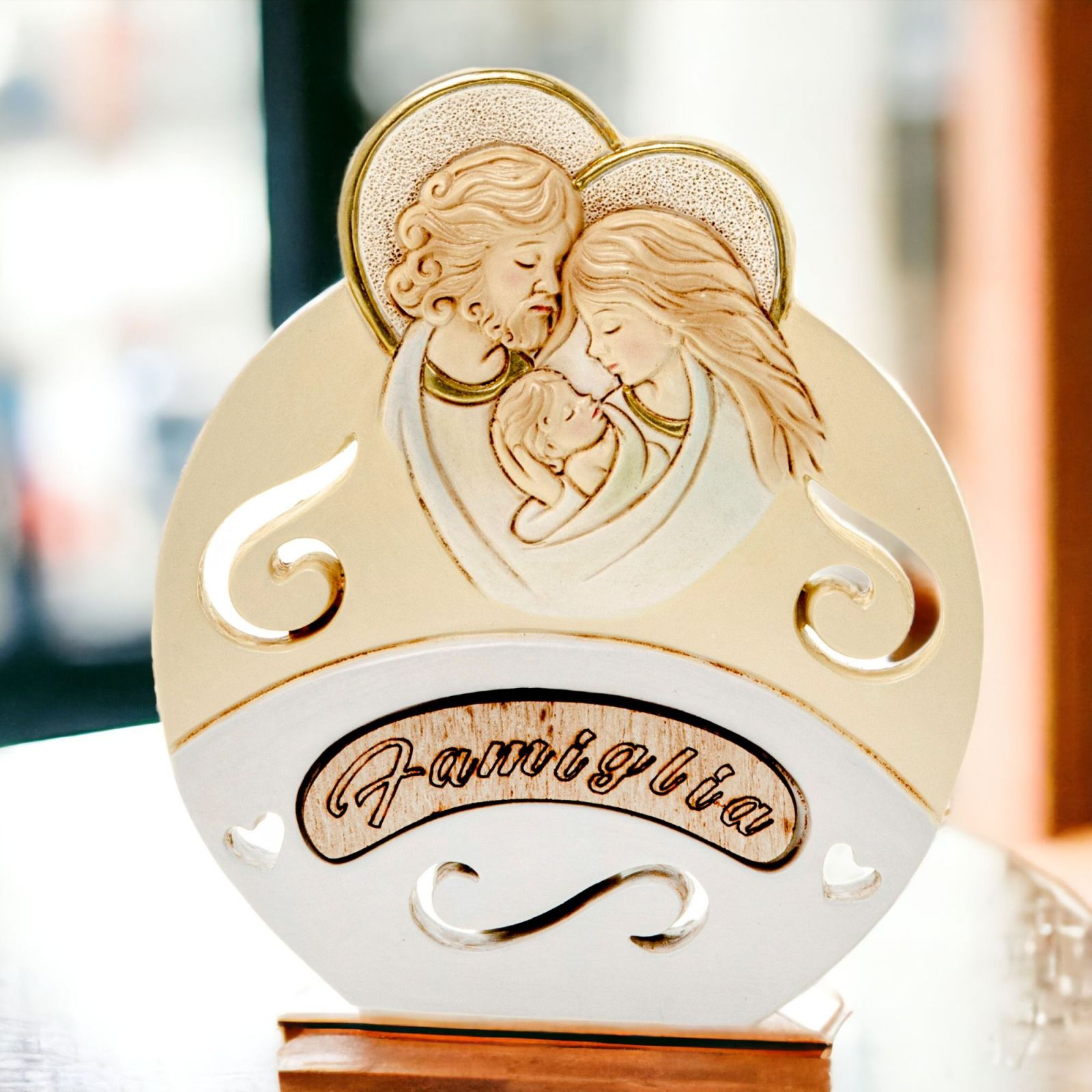 Regala questa icona sacra di forma circolare con raffigurazione sacra famiglia e una dolce scritta “Famiglia”. Un omaggio che porterà simboli di tenerezza e amore, realizzato con materiali pregiati come resina e legno. L' icona artistica con raffigurazione di Gesù, Giuseppe e Maria avrà grande effetto sugli eventi speciali come ad esempio il battesimo, la prima comunione o il matrimonio.