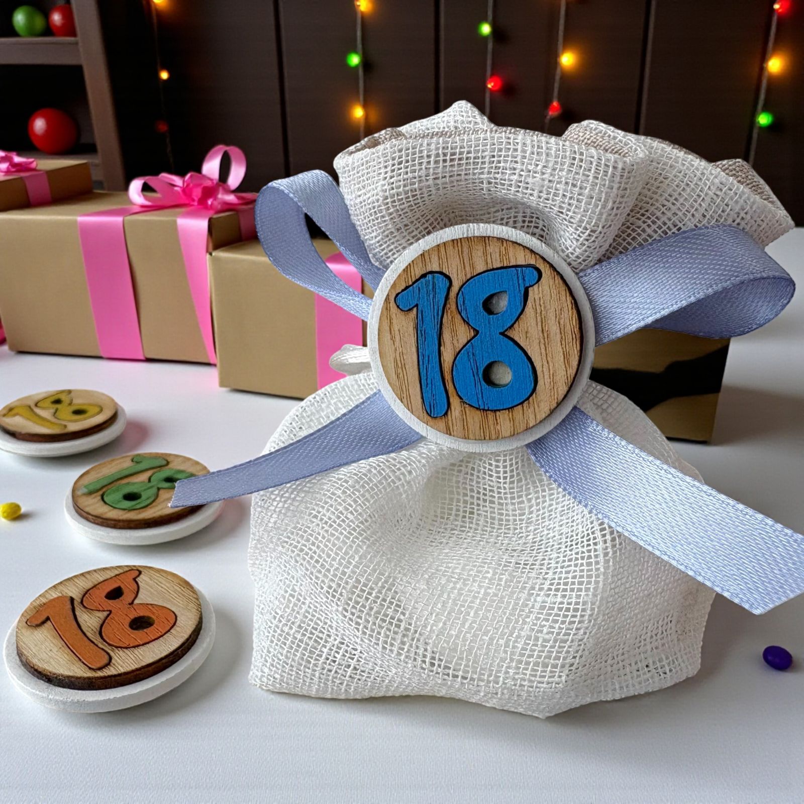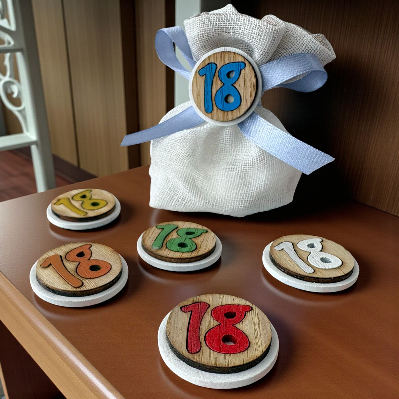 Per celebrare l'emozione dei 18 anni, questo raffinato sacchetto portaconfetti è pensato per chi desidera offrire ai propri invitati una bomboniera originale ricca di significato. L'applicazione tonda con numero 18, decorata con uno sfondo effetto legno e colori assortiti tra rosso, giallo, arancione, verde, bianco e azzurro, rende ogni sacchettino unico e pieno di vivacità. Ideale come segnaposto 18, aggiunge armonia e gioia alla tavola del tuo evento, perfetto sia come bomboniera ragazzo che bomboniera ragazza.
