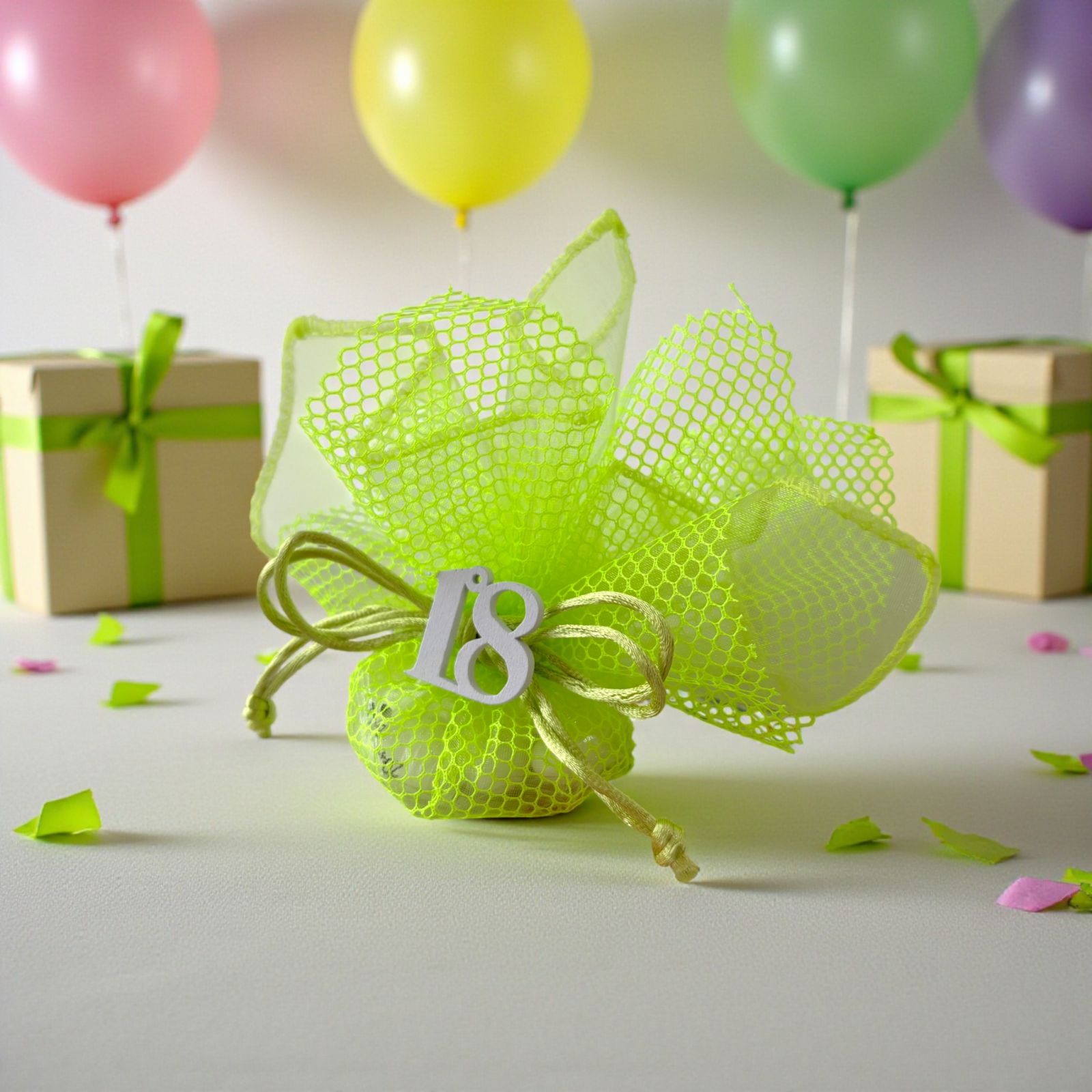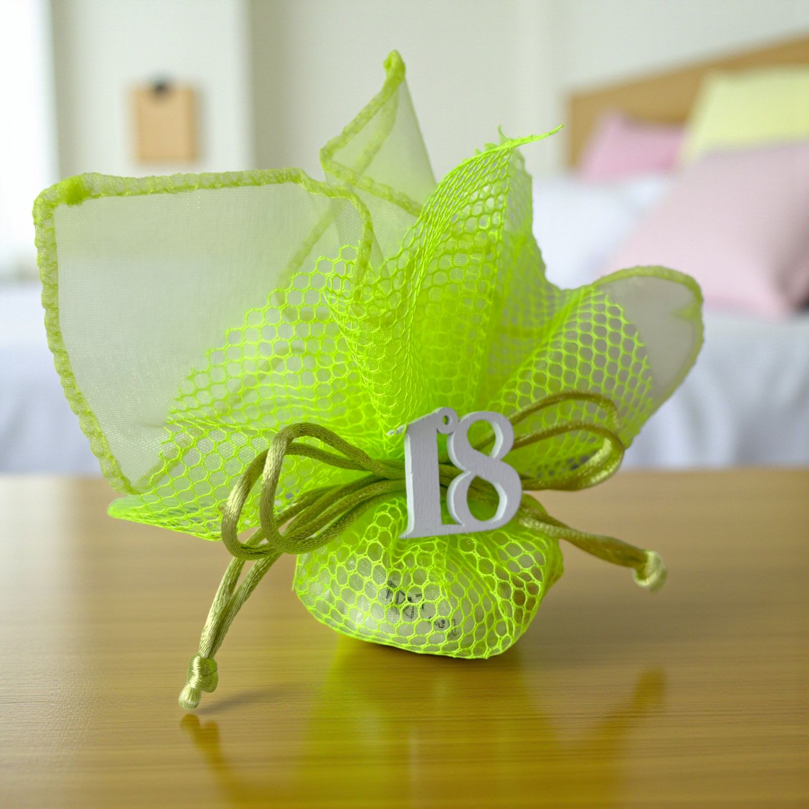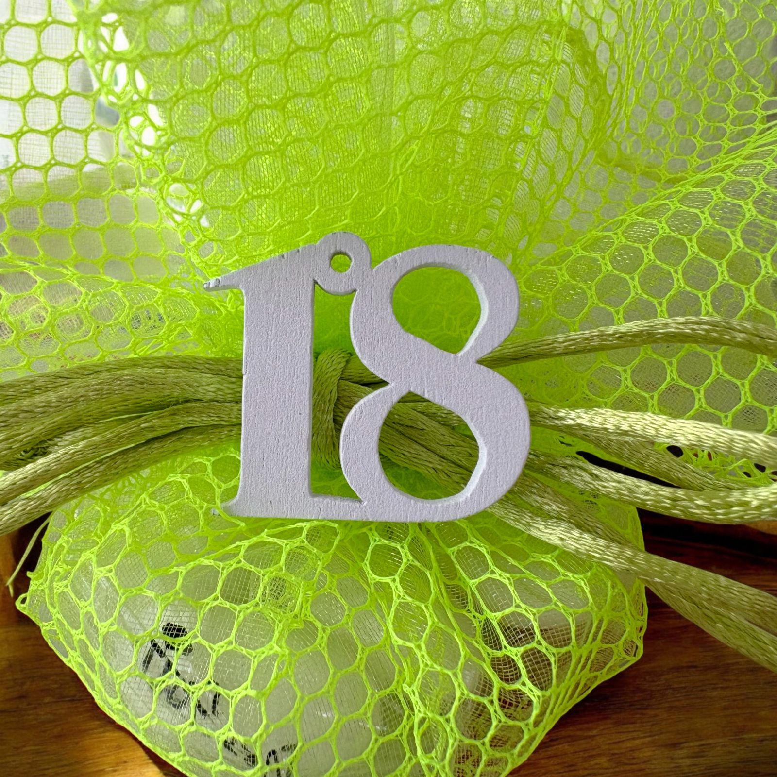 Festeggia i tuoi 18 anni con stile grazie a questo vivace sacchetto portaconfetti verde fluo, impreziosito da un’elegante applicazione in legno con numero 18 bianca.