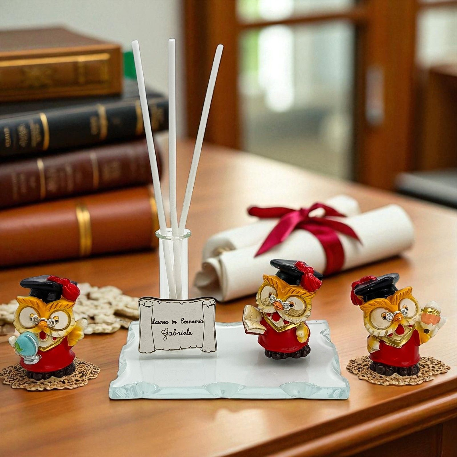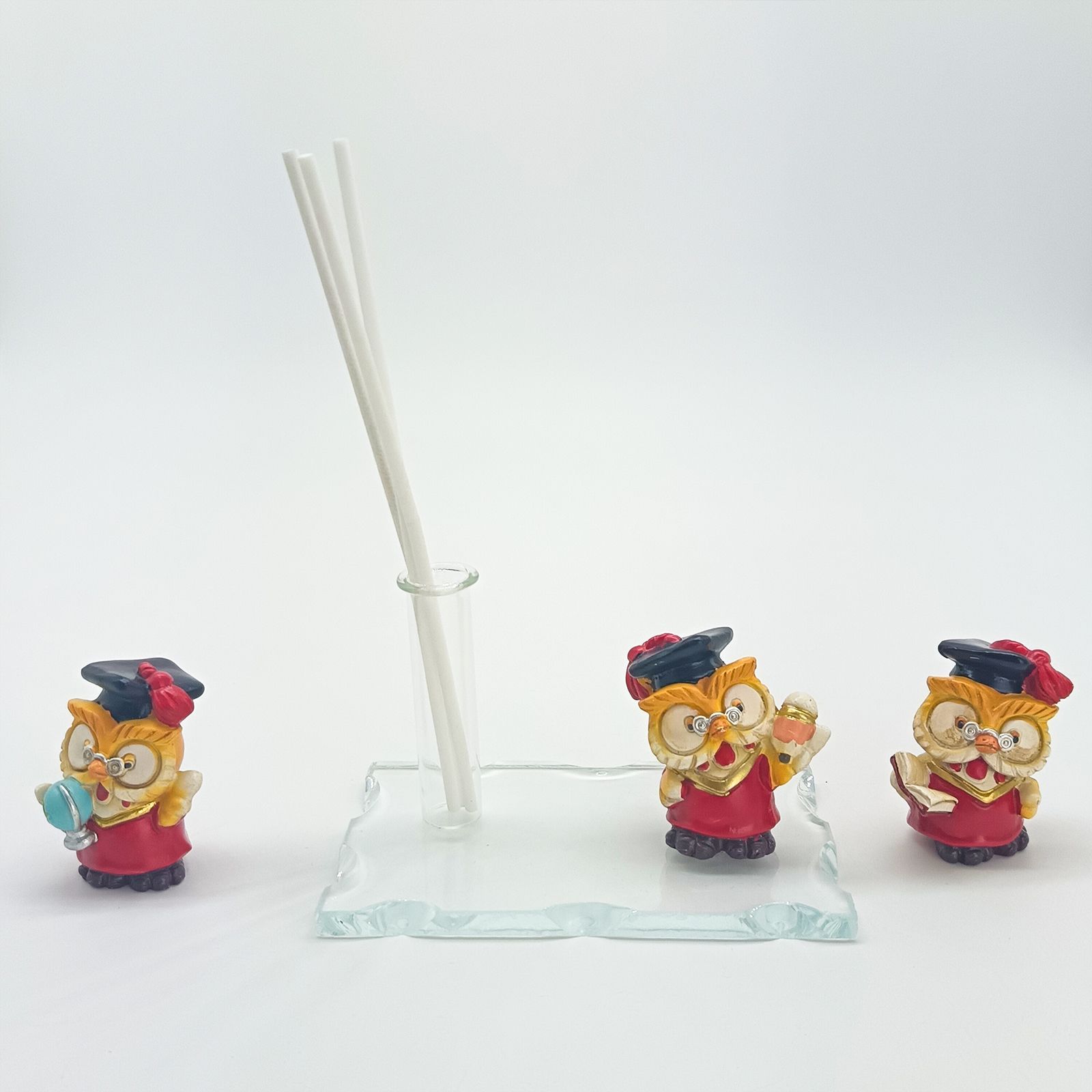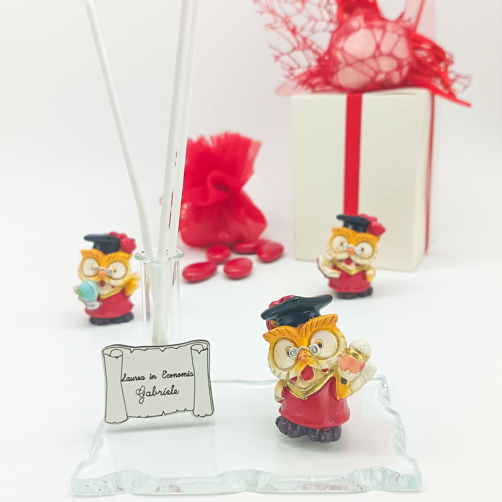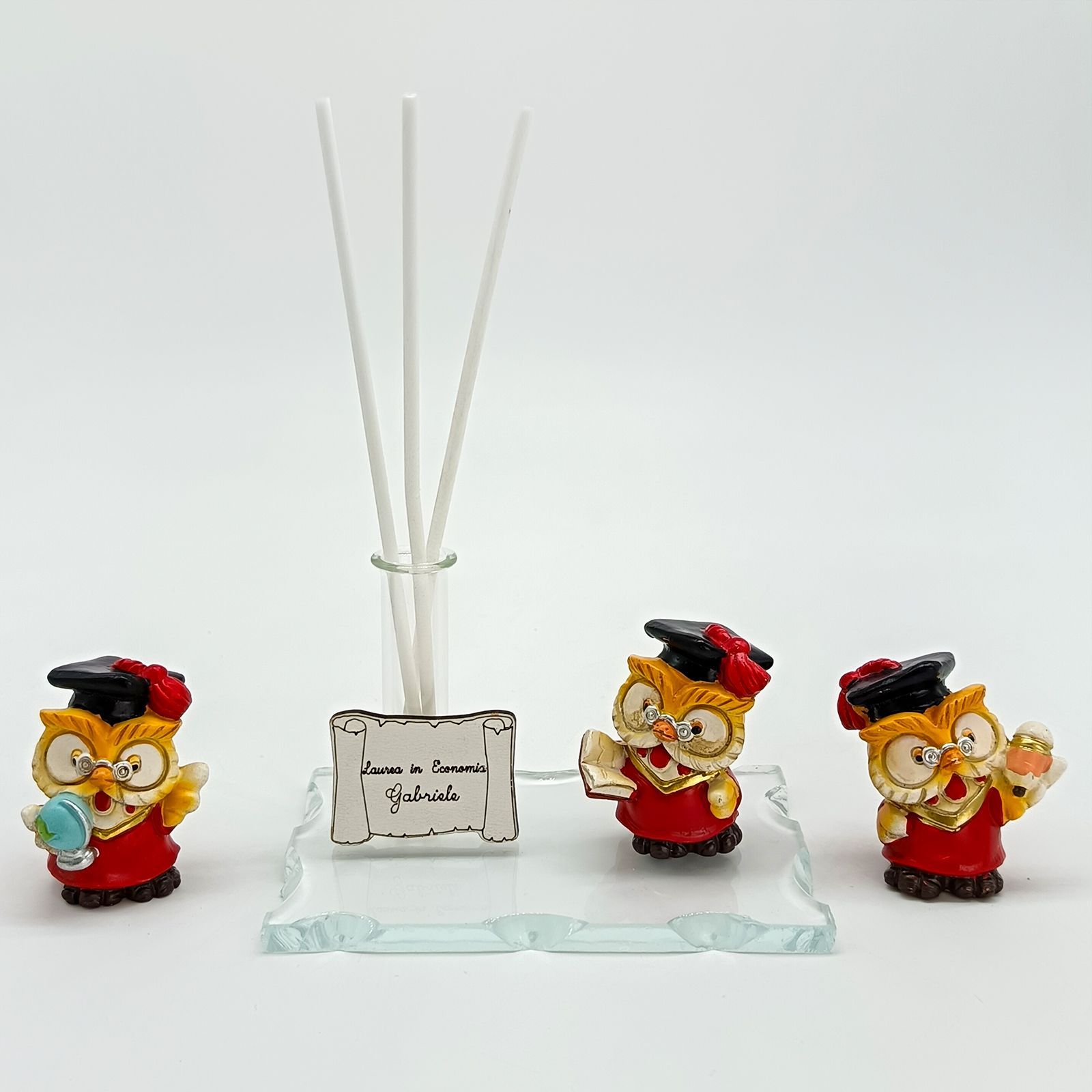 Nel giorno della laurea, sorprendi i tuoi ospiti con un tocco di originalità grazie a questa elegante bomboniera diffusore essenza su base in vetro, arricchita da un simpatico gufetto laureato portafortuna, assortito in tre modelli: con una matita, un libro o un mappamondo tra le mani.