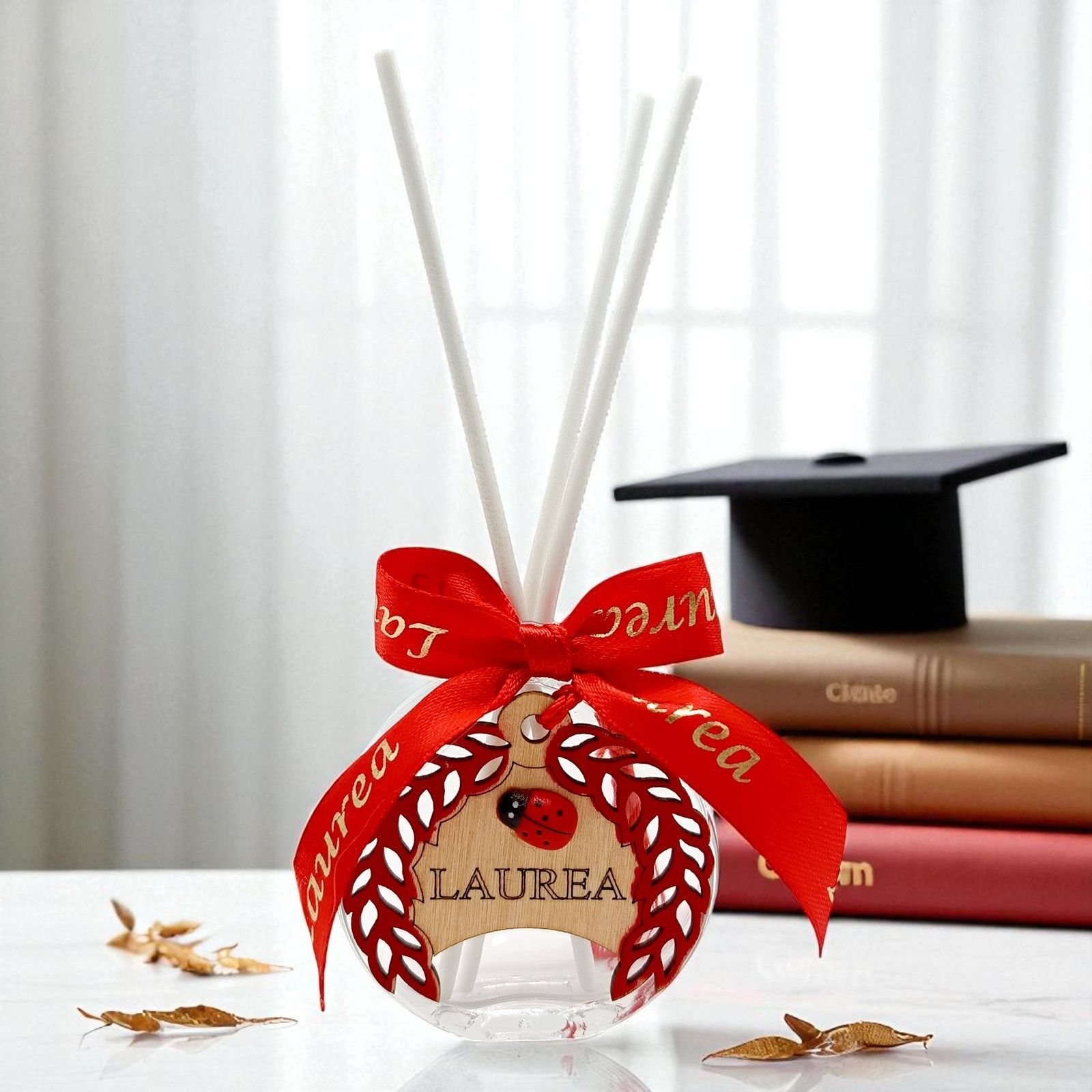 Celebra la laurea con un tocco di eleganza grazie a questo diffusore ambiente, decorato con un’applicazione in legno raffigurante la corona d’alloro, la scritta “Laurea” e una simpatica coccinella rossa. Un’idea raffinata e profumata per festeggiare un traguardo importante.