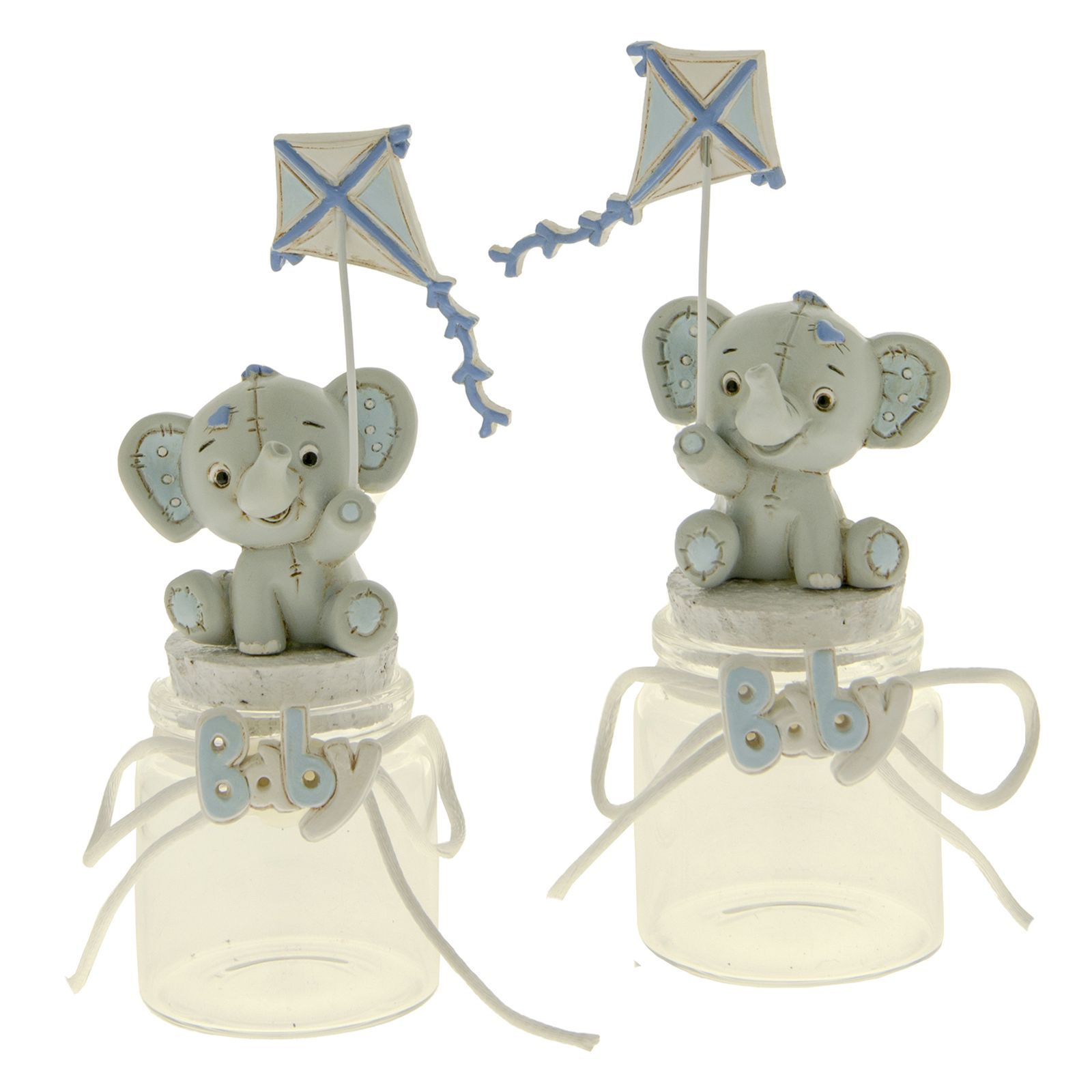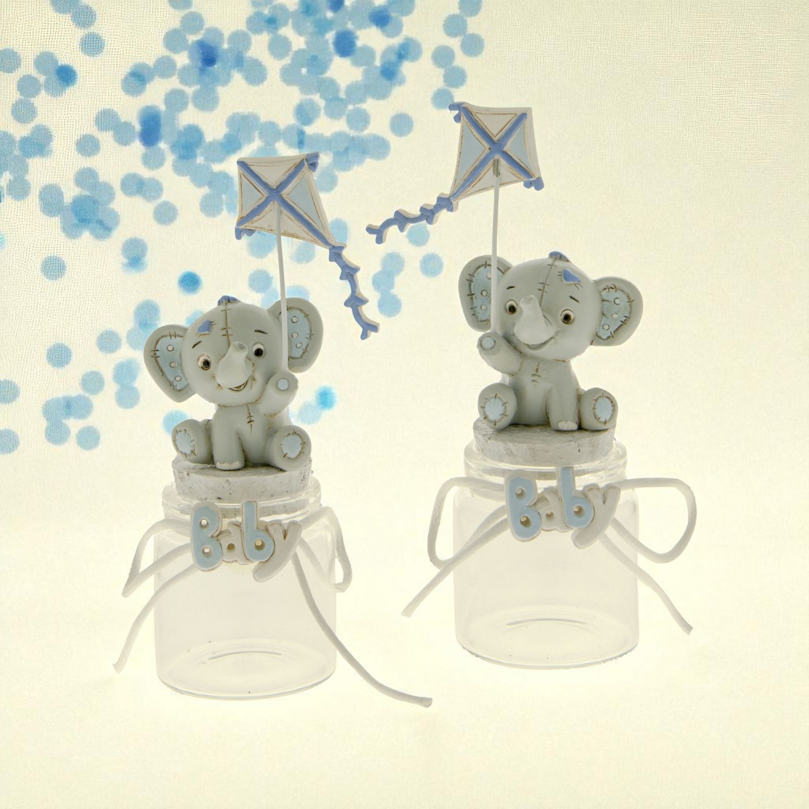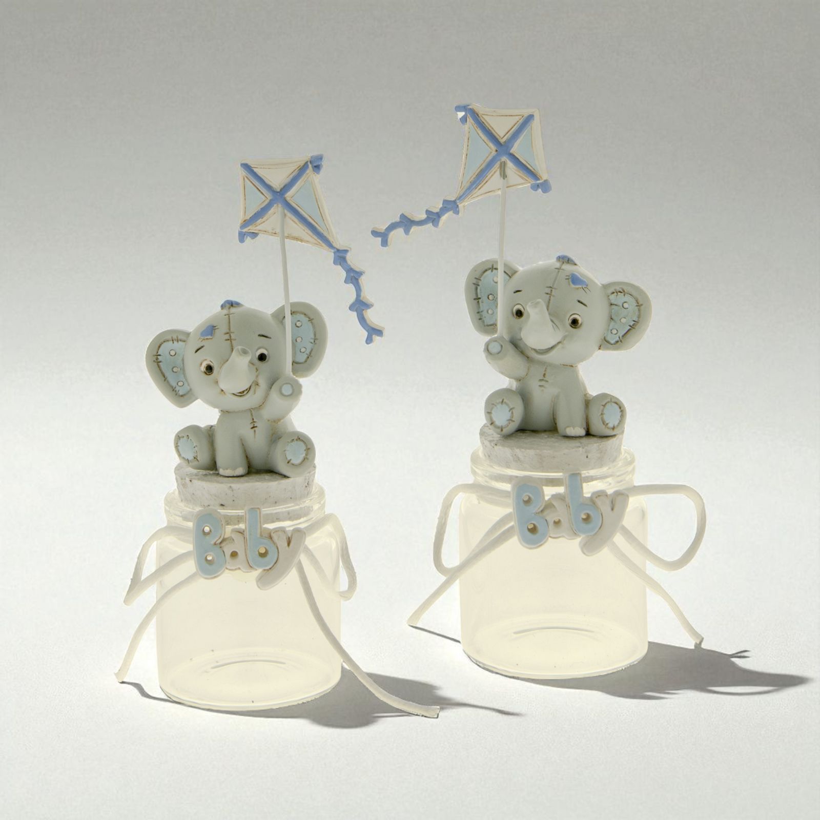 Barattoli per confetti con tappo in sughero ed elefantino in resina, modello Dumbo, con effetto peluche con finte impunture e particolari celesti. Gli elefantini tengono in una zampa un aquilone (zampa destra o sinistra a seconda dell'assortimento). Sul collo del barattolino, invece,è presente la scritta "Baby" in bianco e celeste con un fiocchetto bianco che percorre tutta la circonferenza.