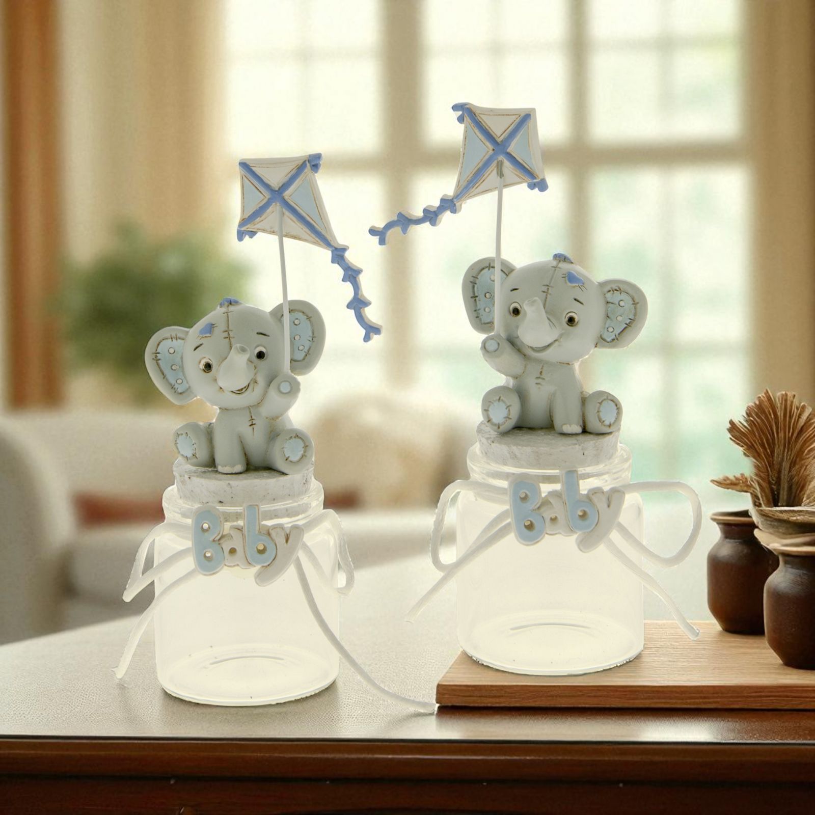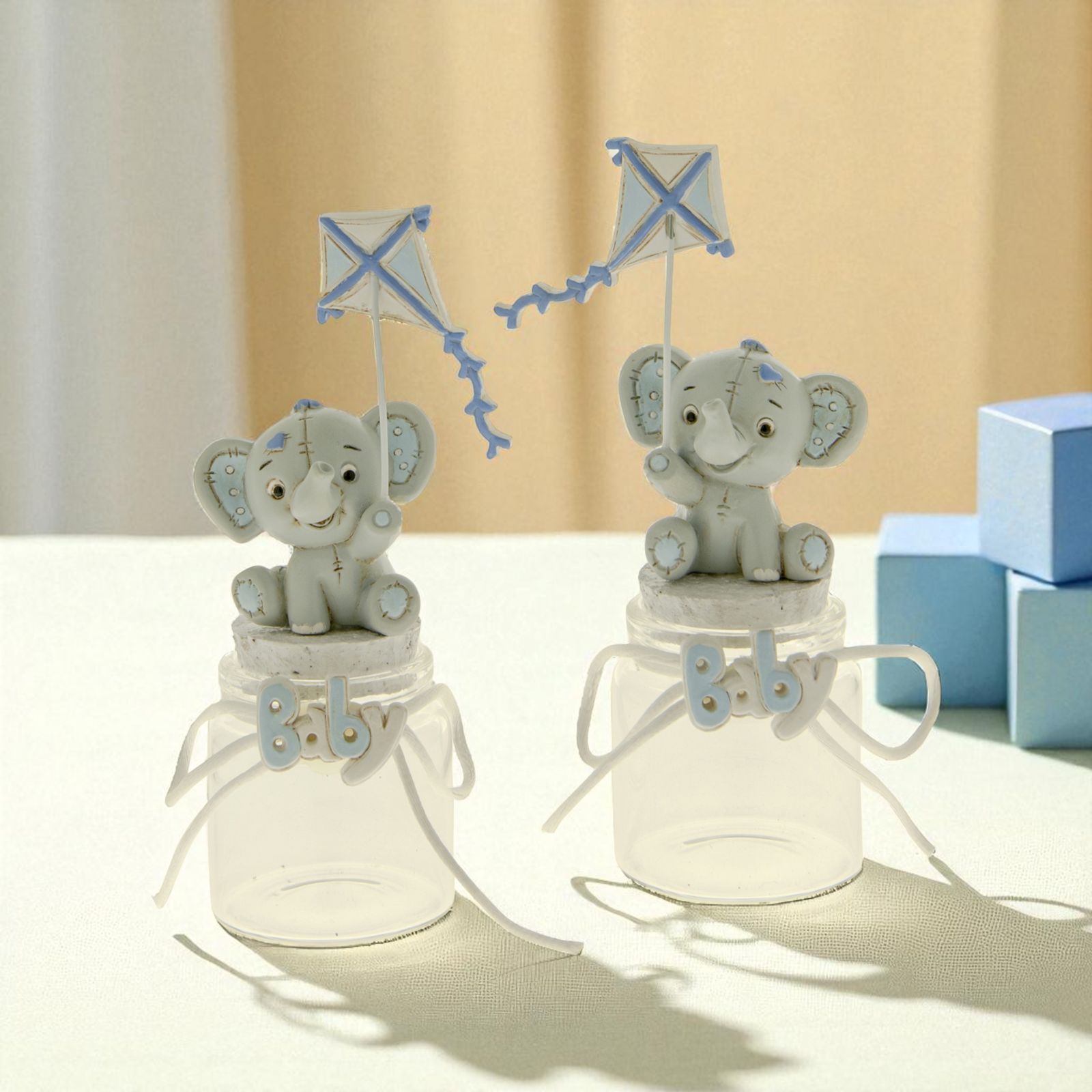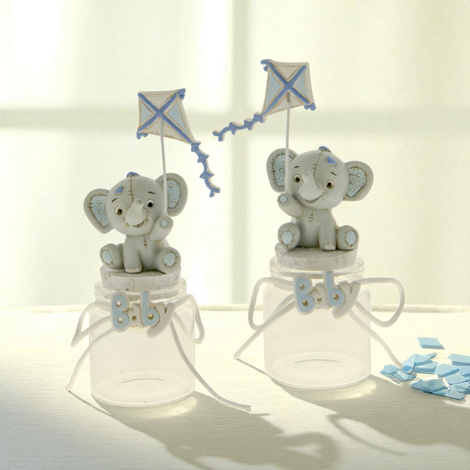 Barattoli per confetti con tappo in sughero ed elefantino in resina, modello Dumbo, con effetto peluche con finte impunture e particolari celesti. Gli elefantini tengono in una zampa un aquilone (zampa destra o sinistra a seconda dell'assortimento). Sul collo del barattolino, invece,è presente la scritta "Baby" in bianco e celeste con un fiocchetto bianco che percorre tutta la circonferenza.