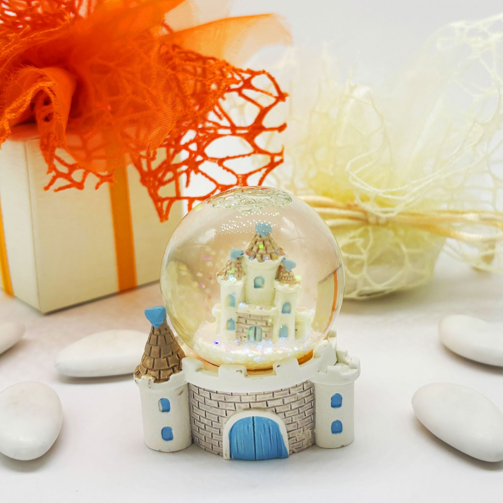 Regala un tocco di magia con la palla di neve con castello principesco, ideale per celebrare la nascita o il primo compleanno di un bimbo. Questo elegante oggetto in bianco e celeste con un castello fiabesco all’interno è il pensierino perfetto per i tuoi invitati, un ricordo indimenticabile di un giorno speciale.
