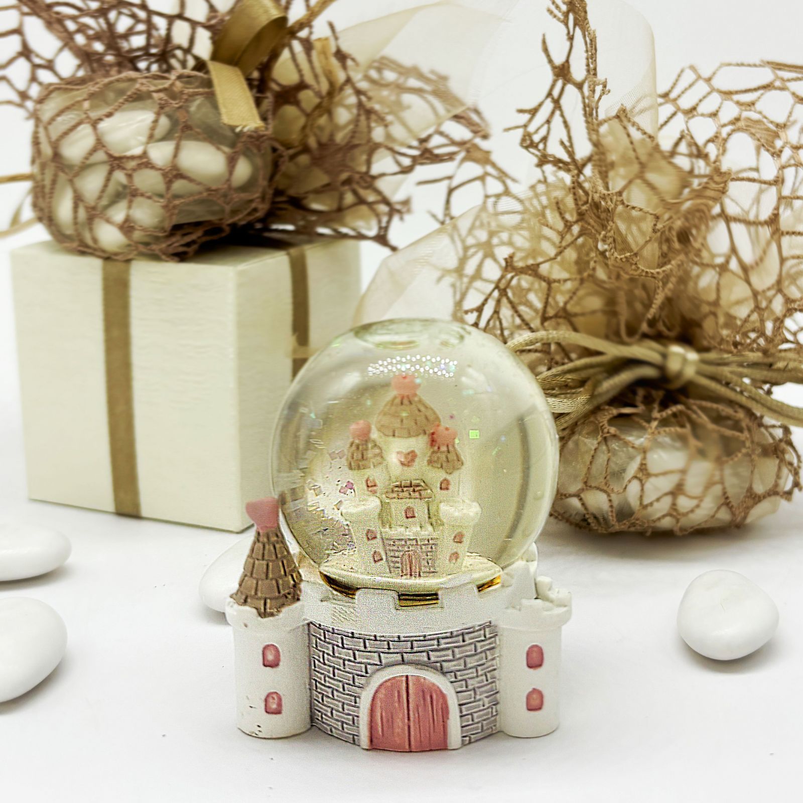 La scelta di una palla di neve come bomboniera porta con sé un messaggio di purezza e magia, perfetto per accogliere una nuova vita. Il castello principesco al suo interno simboleggia sogni e protezione, rendendo questo dono ancor più speciale per una bambina appena arrivata o nei suoi primi passi di vita.