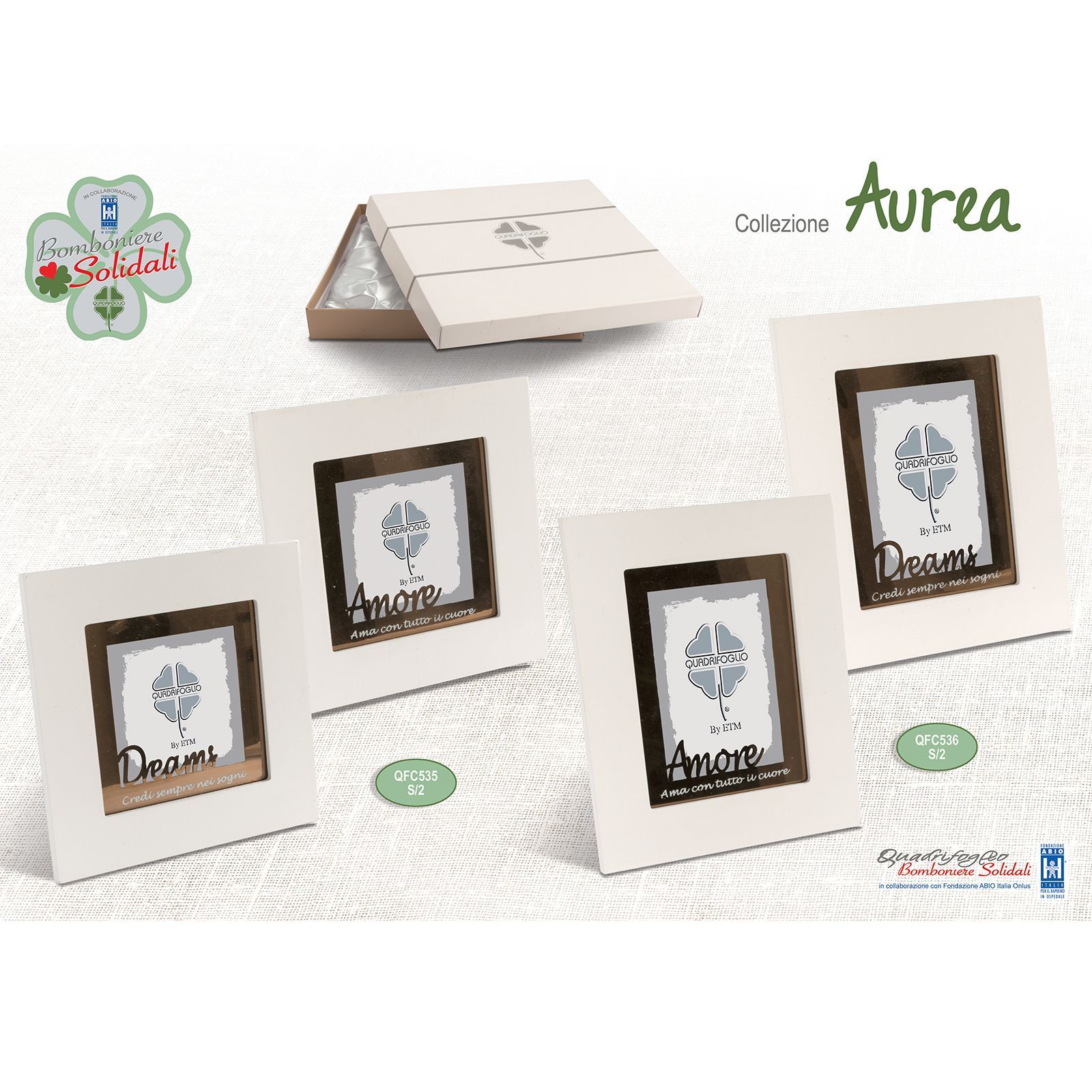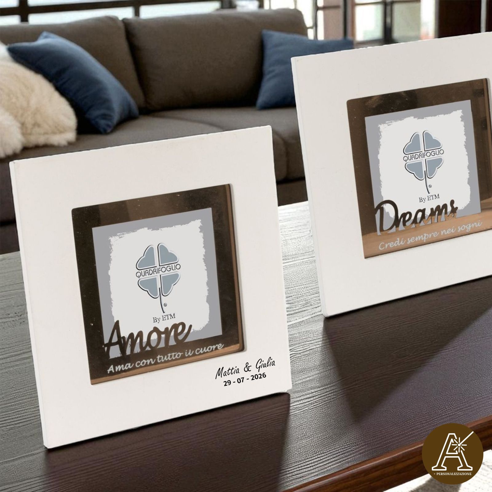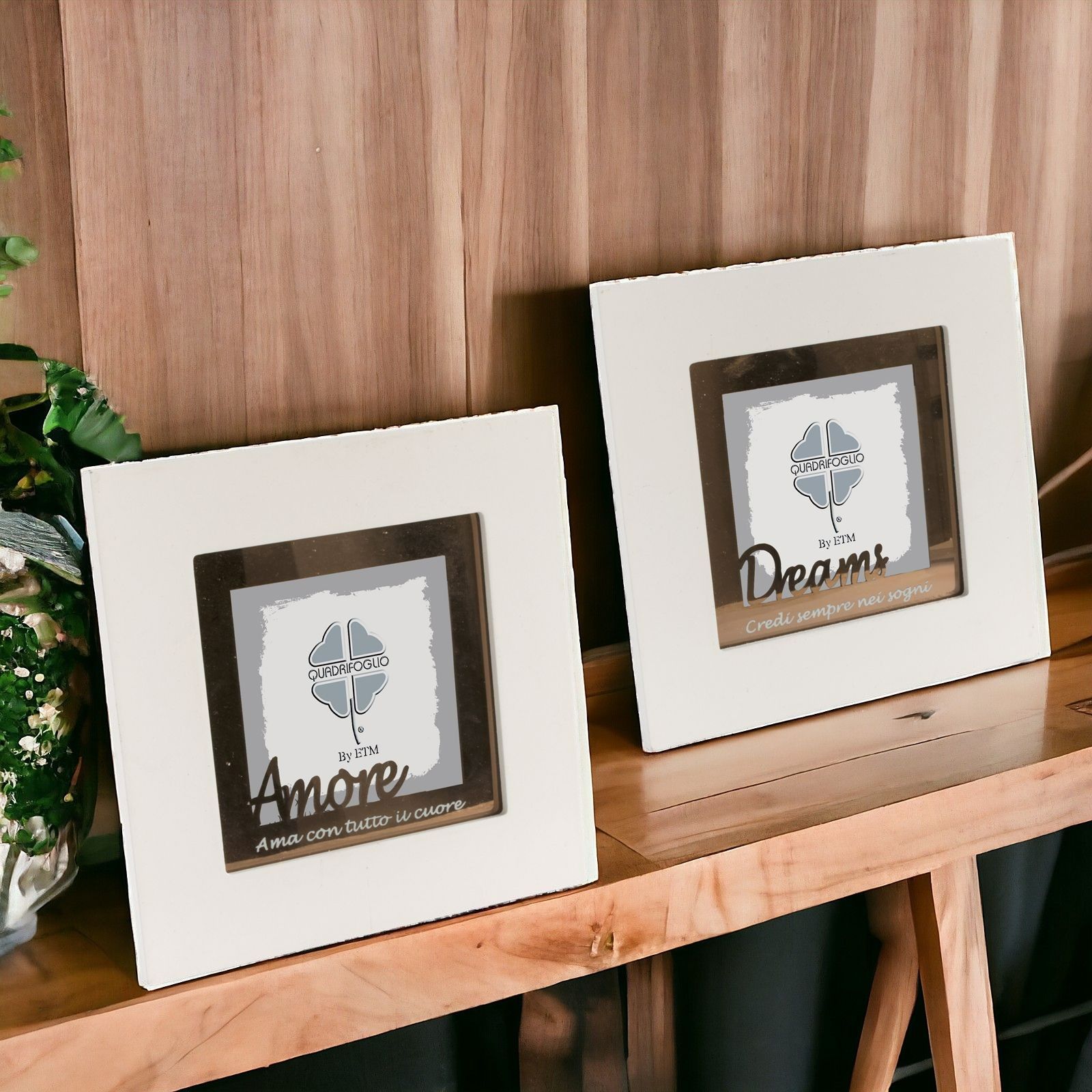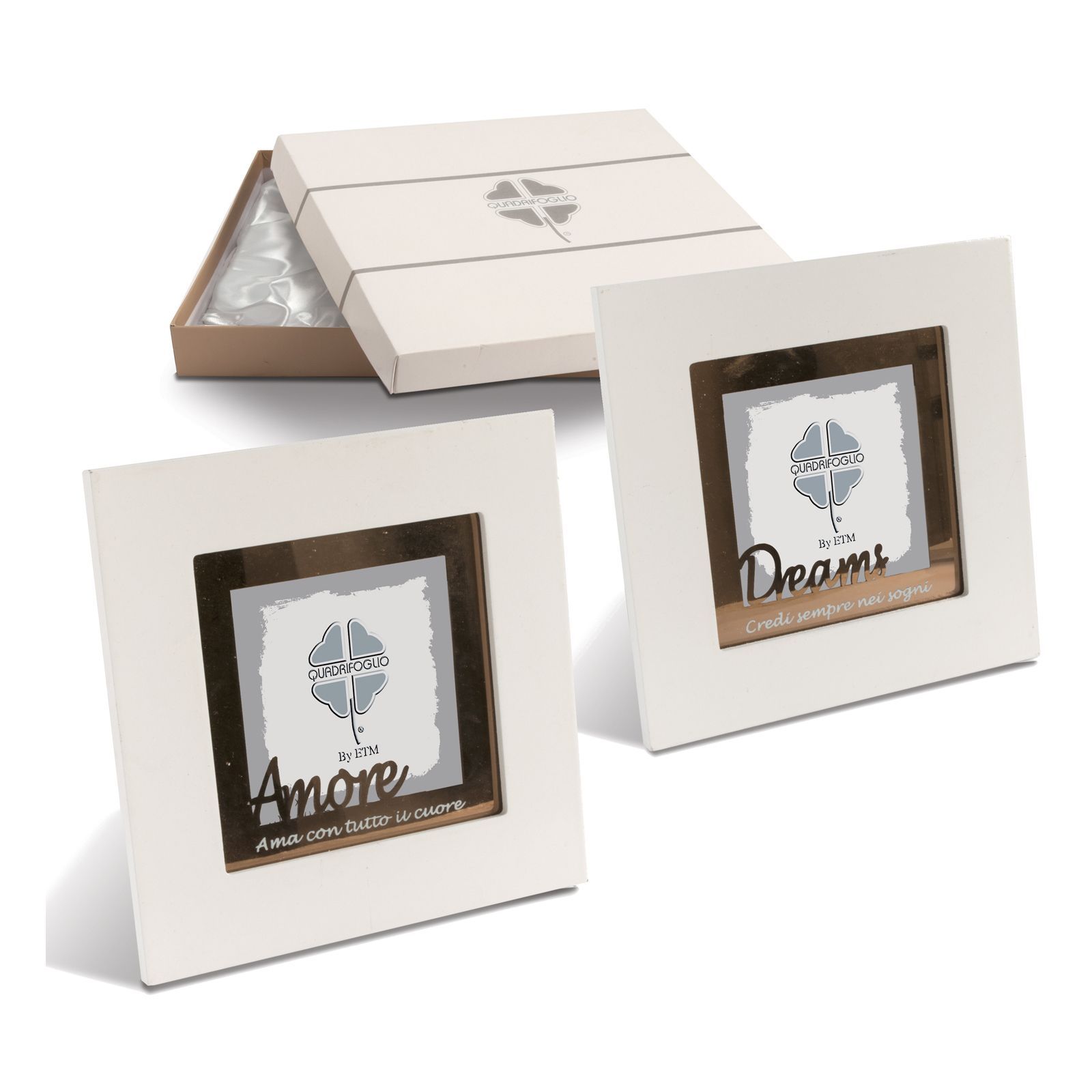 Ogni portafoto è arricchito da parole e frasi significative, che diventano un messaggio da custodire: assortiti in due modelli (non selezionabili singolarmente) – AMORE con frase "Ama con tutto il cuore" e DREAMS con frase "Credere sempre nei sogni...".