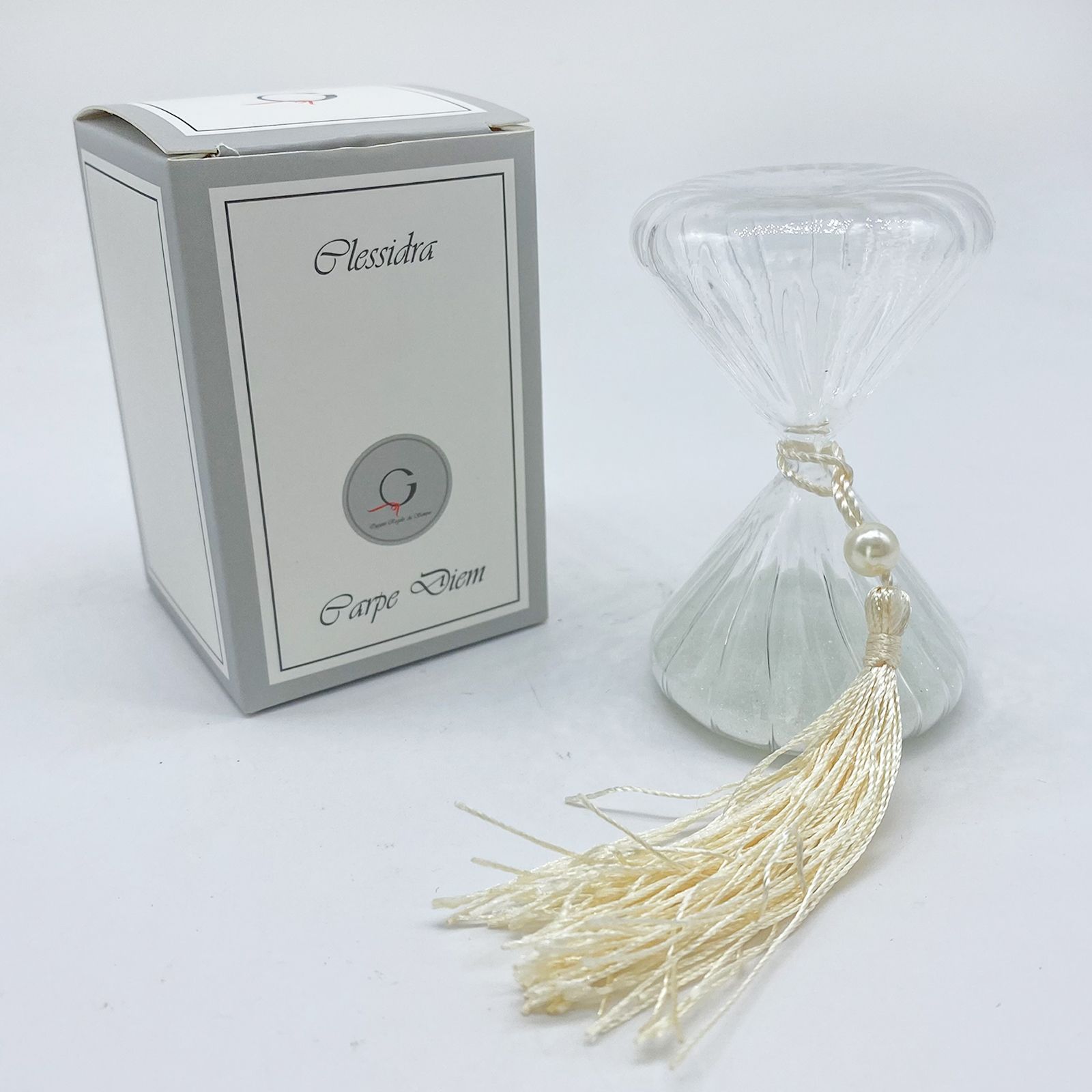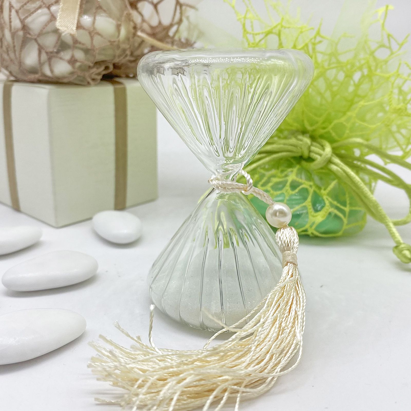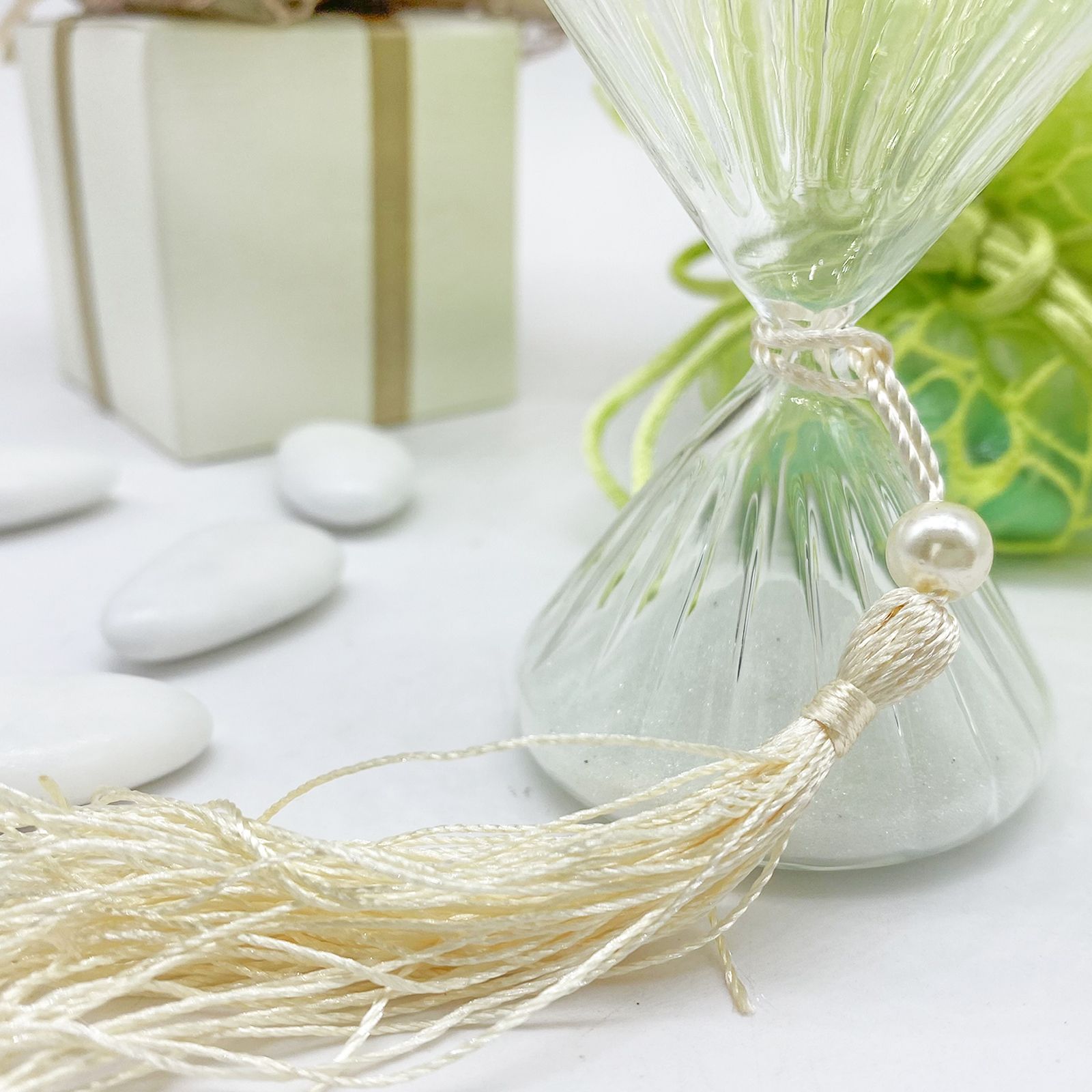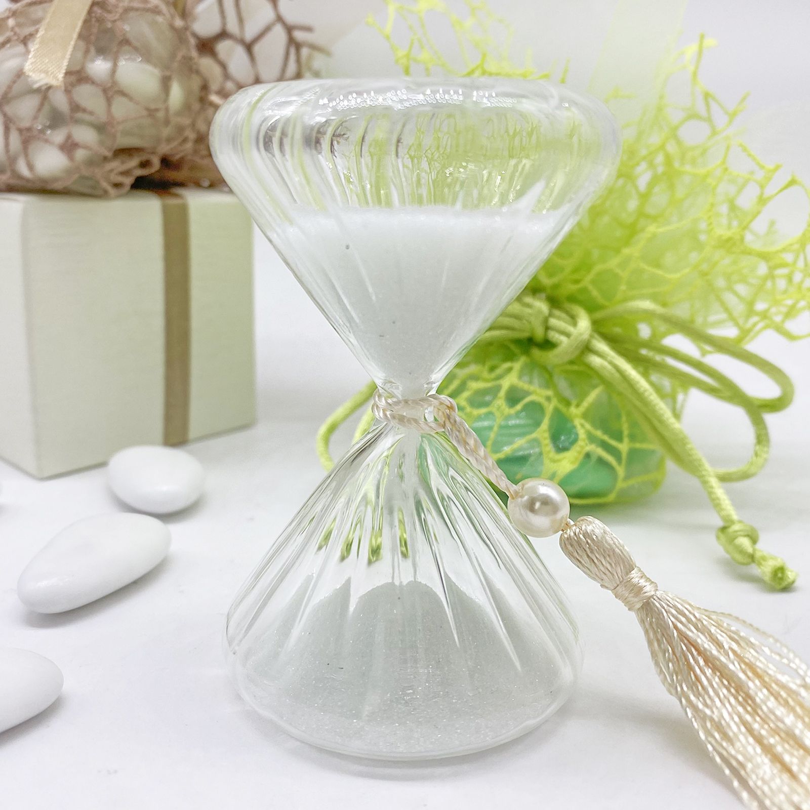 Aggiungi un tocco di eleganza e raffinatezza ai tuoi eventi speciali con la nostra clessidra con sabbia bianca. Caratterizzata dalla sua grazia senza tempo, questa bomboniera è l'emblema di momenti indimenticabili e di ricordi preziosi.
