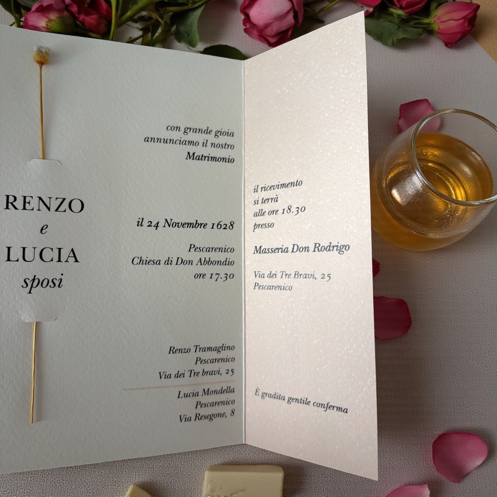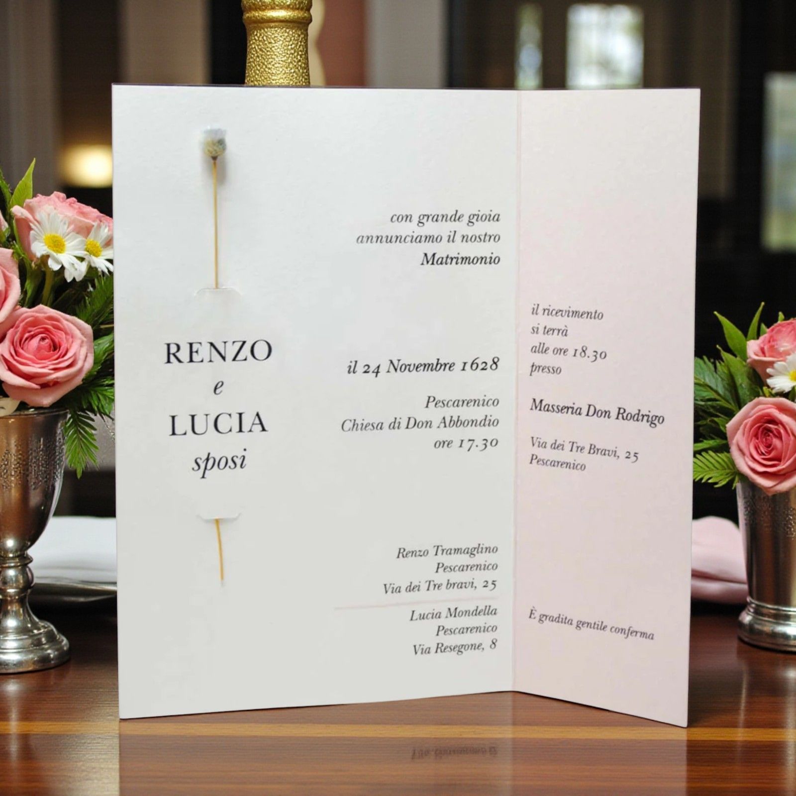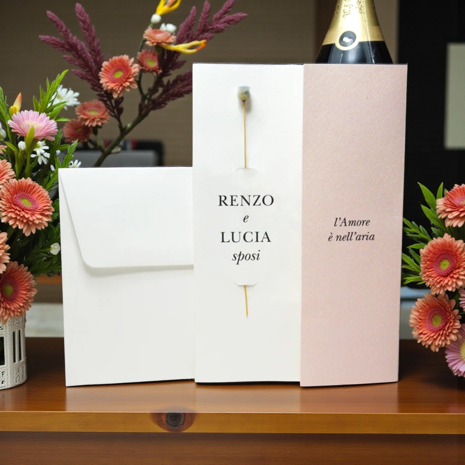 Realizzato in cartoncino panna con una delicata parte laterale rosa antico, questo invito si distingue per la sua bellezza e raffinatezza. All'interno, troverete il testo dell'invito alla cerimonia in chiesa, nella parte frontale, e al ristorante o per il taglio torta (o puoi lasciarlo vuoto), nella parte laterale sinistra, accompagnato da un piccolo fiore secco posizionato con cura, rendendo ogni particolare ancora più prezioso.