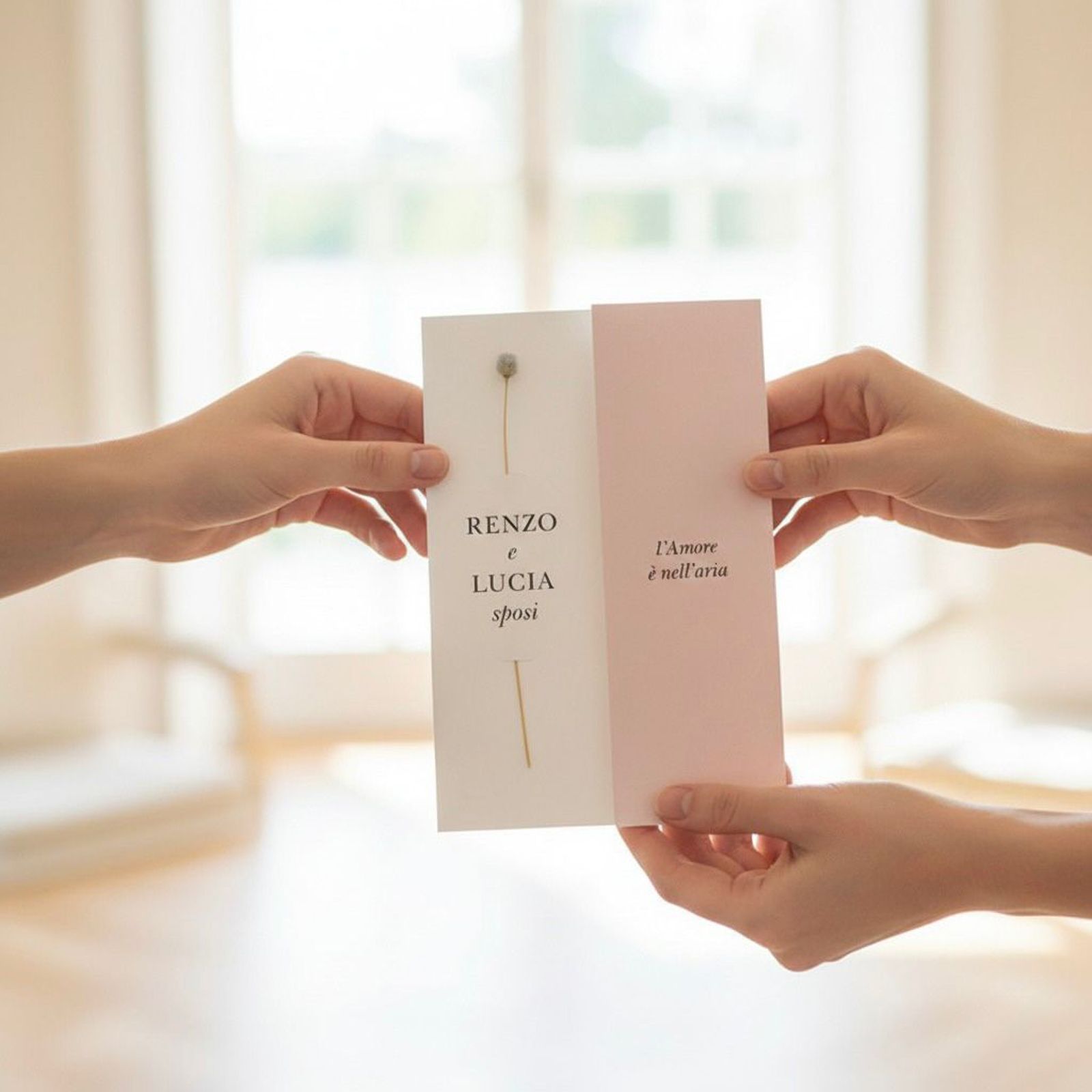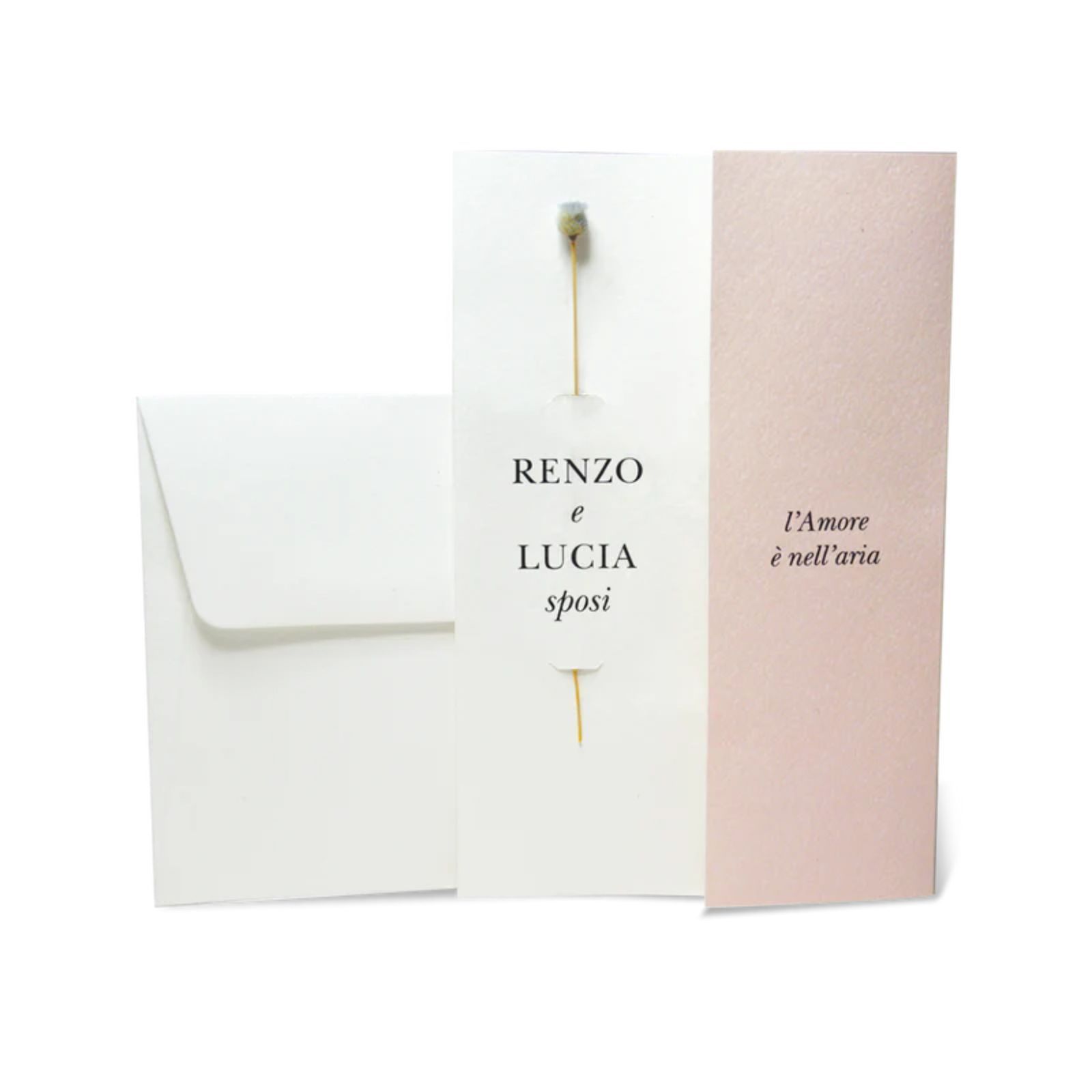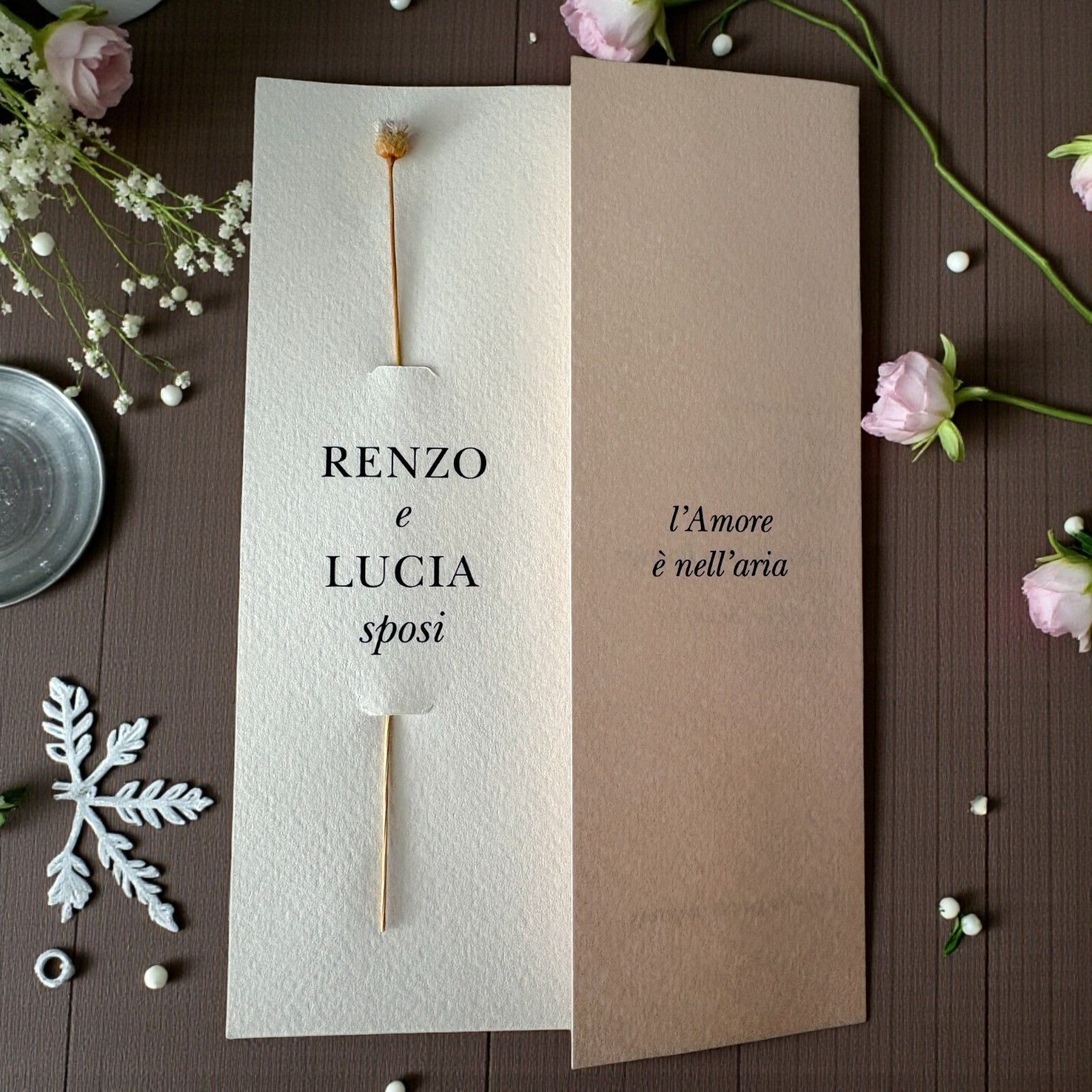 Scopri il nostro invito di matrimonio con fiore secco, un elemento prezioso per rendere unico il vostro giorno speciale. Questo invito personalizzato esprime non solo le vostre emozioni, ma anche l'importanza di ogni dettaglio con un tocco di eleganza. La frase "L'amore è nell'aria" invita gli ospiti a condividere un momento di gioia e celebrazione, creando un’atmosfera magica fin dal primo sguardo.