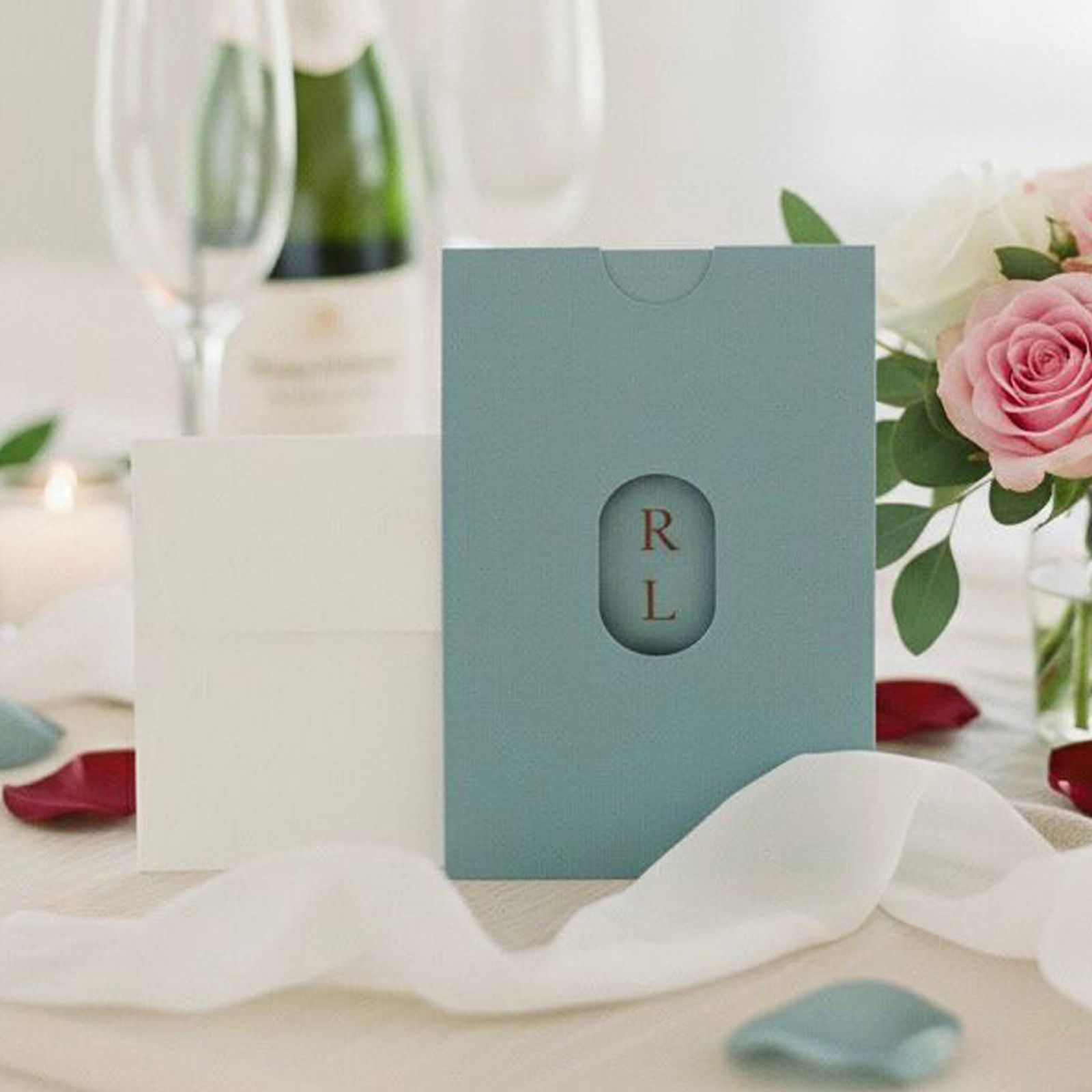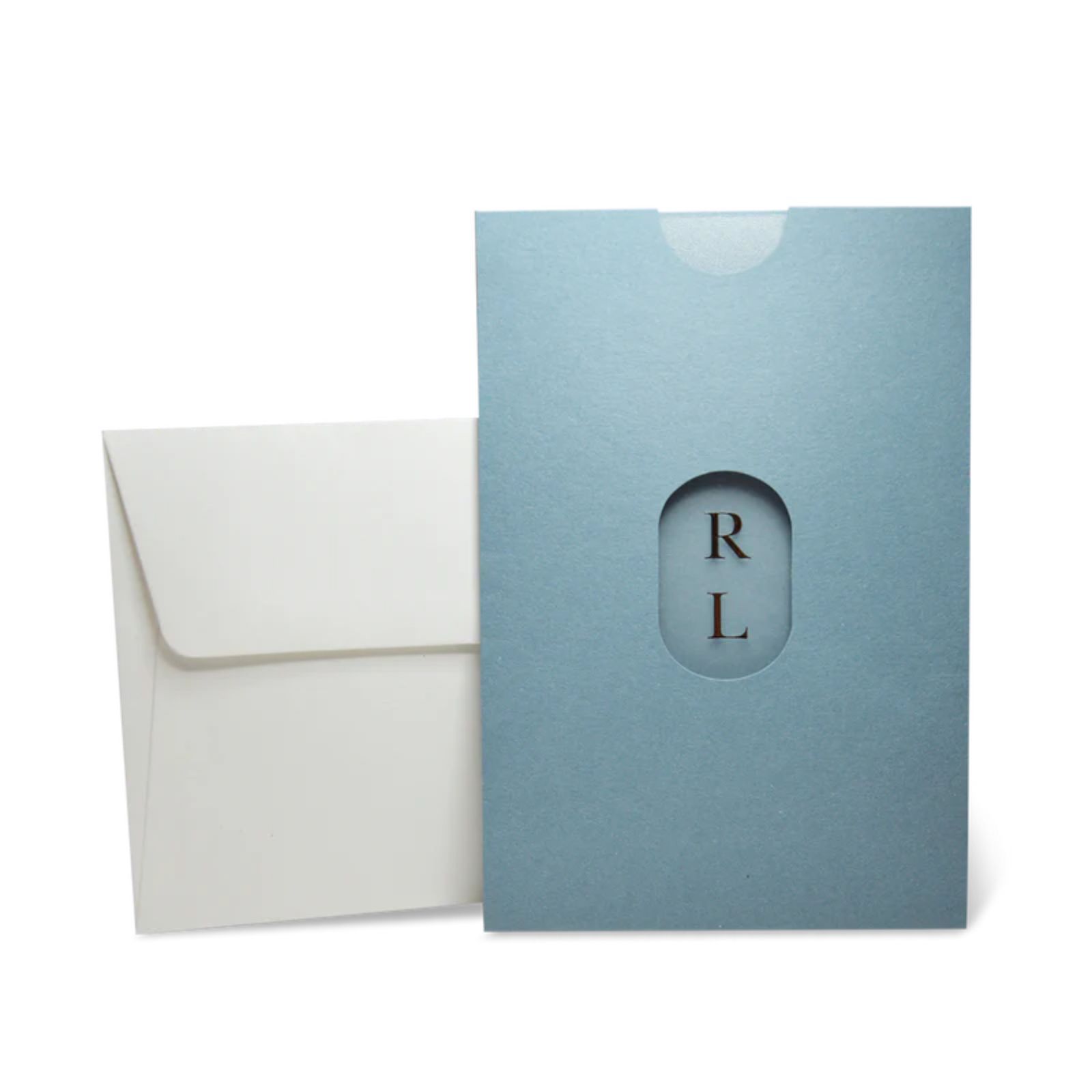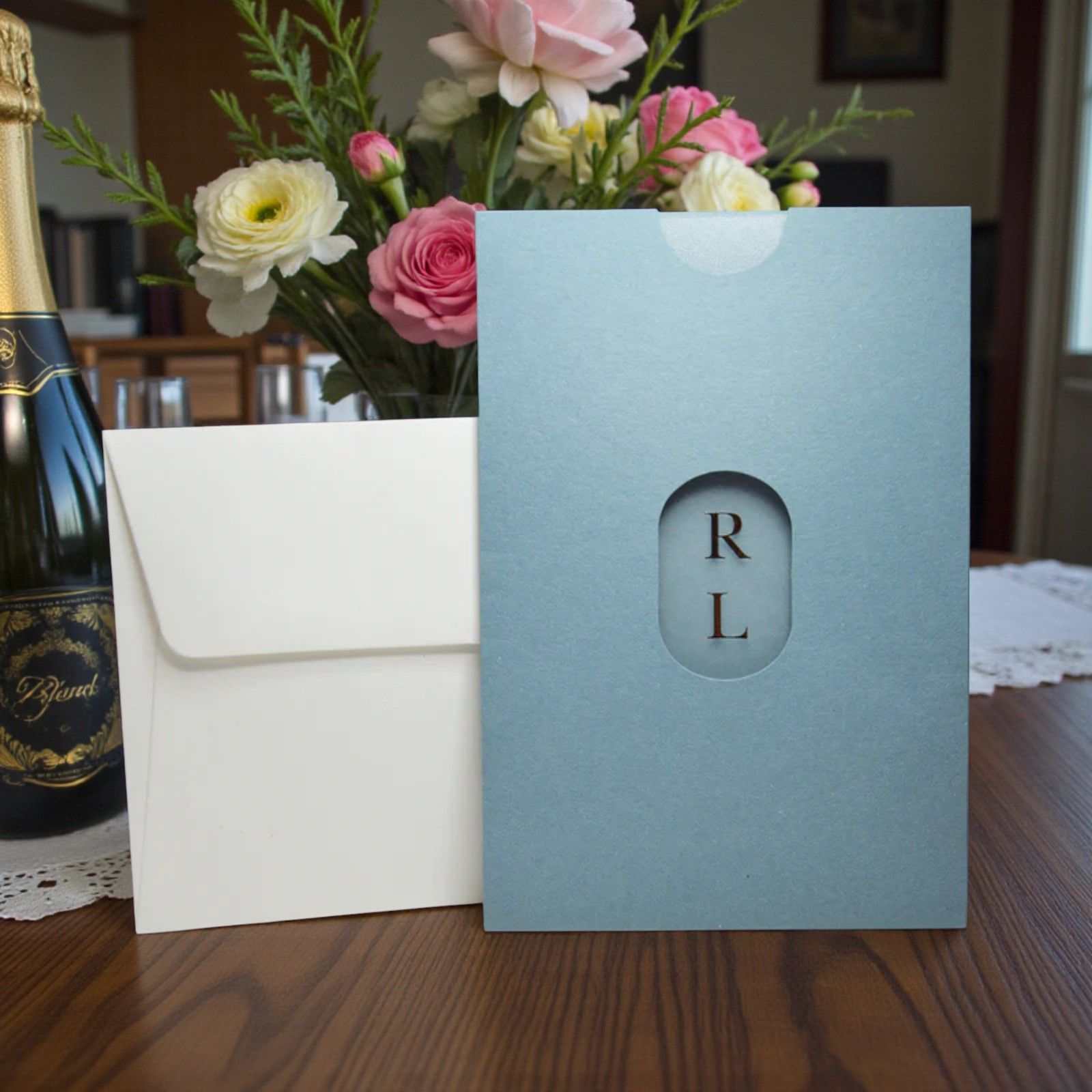 Ogni dettaglio di questo invito personalizzato è stato curato con passione: l'apertura centrale rivela le vostre iniziali, rendendo ogni partecipazione un pezzo unico. La busta celeste polvere aggiunge un tocco di dolcezza e freschezza, il complemento ideale per un matrimonio da sogno.