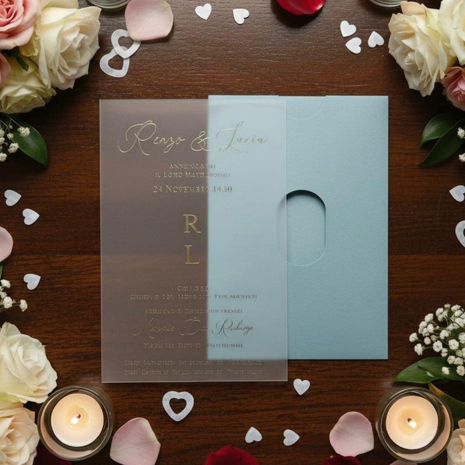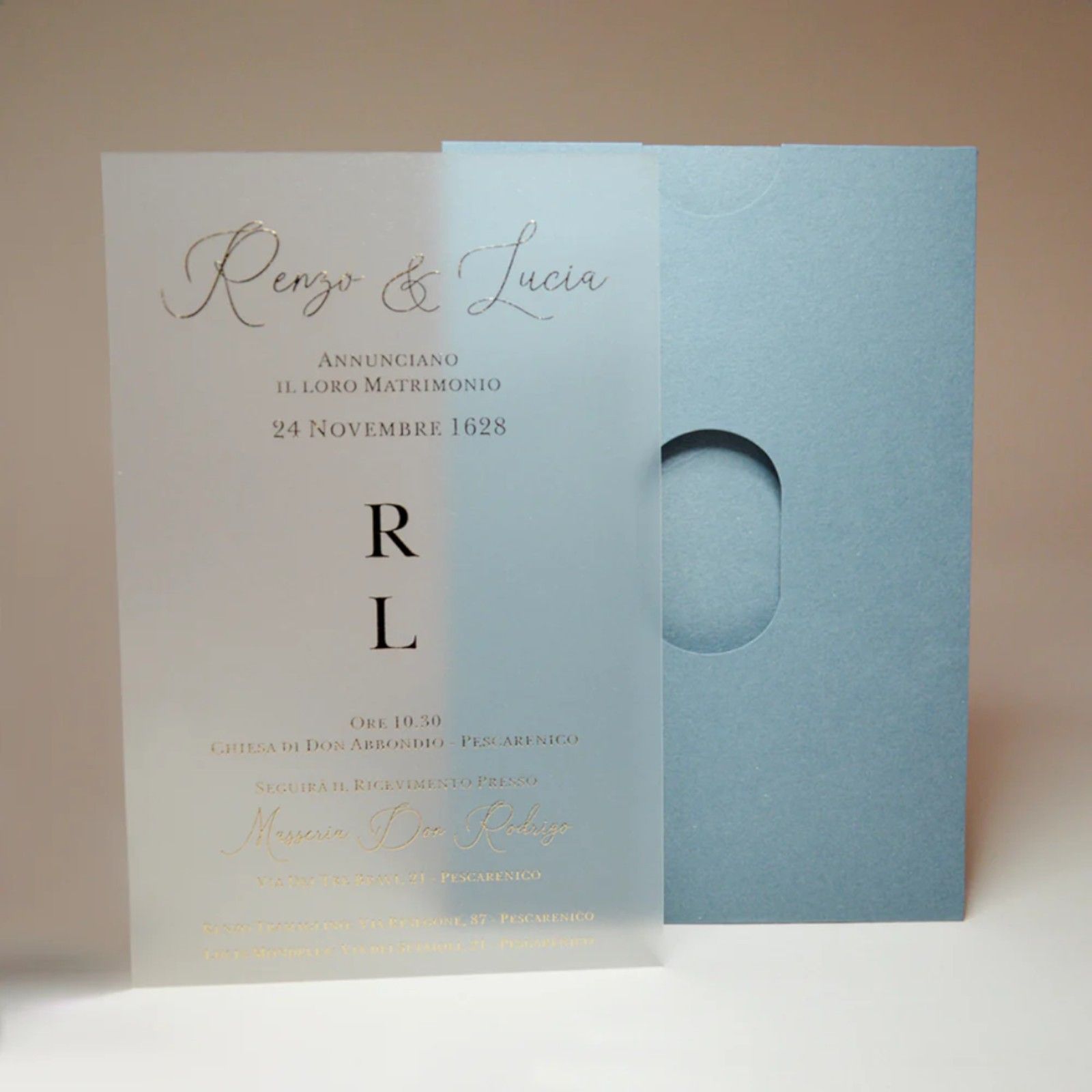 Scopri l'eleganza senza tempo delle nostre partecipazioni di matrimonio, un invito pensato per esprimere la gioia e l'emozione del vostro grande giorno. Realizzato con busta in cartoncino di alta qualità, celeste polvere, il nostro invito di matrimonio in PET opaco, con scritte in oro UV lucido, estraibile dall'alto, è il modo perfetto per annunciare il vostro amore in modo raffinato e unico. Con un design delicato e una palette di colori che richiama il cielo sereno, questo invito diventa un prezioso ricordo per i vostri ospiti.