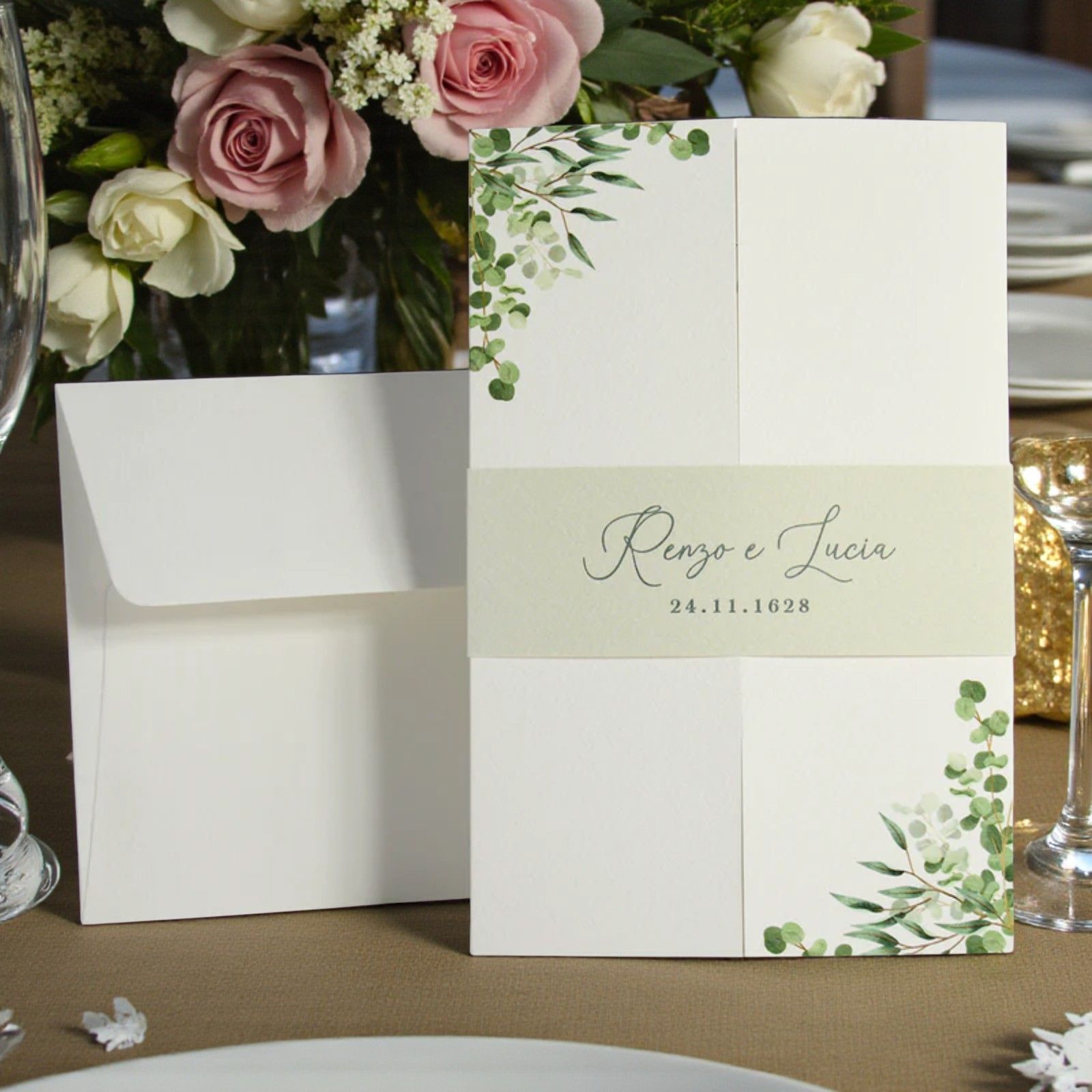 Scoprite l'importanza di un invito di matrimonio che racconta la vostra storia d'amore. La partecipazione a finestra con fascia e foglie è il modo perfetto per annunciare il giorno più bello della vostra vita. Con un design elegante e raffinato, questa partecipazione non è solo un semplice invito, ma un anticipato assaggio della gioia e delle emozioni che si vivranno nel giorno delle nozze. Lasciate che i vostri invitati sentano l'amore che vi unisce già dal primo sguardo!