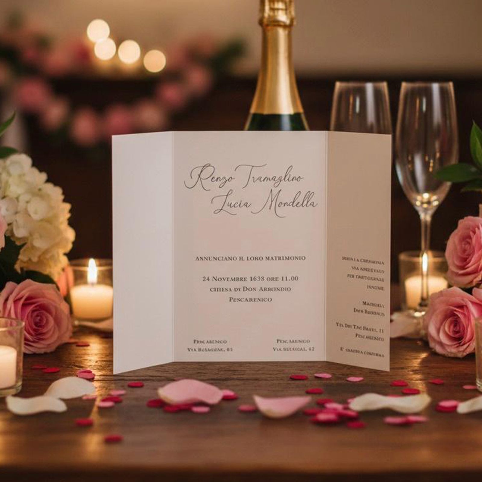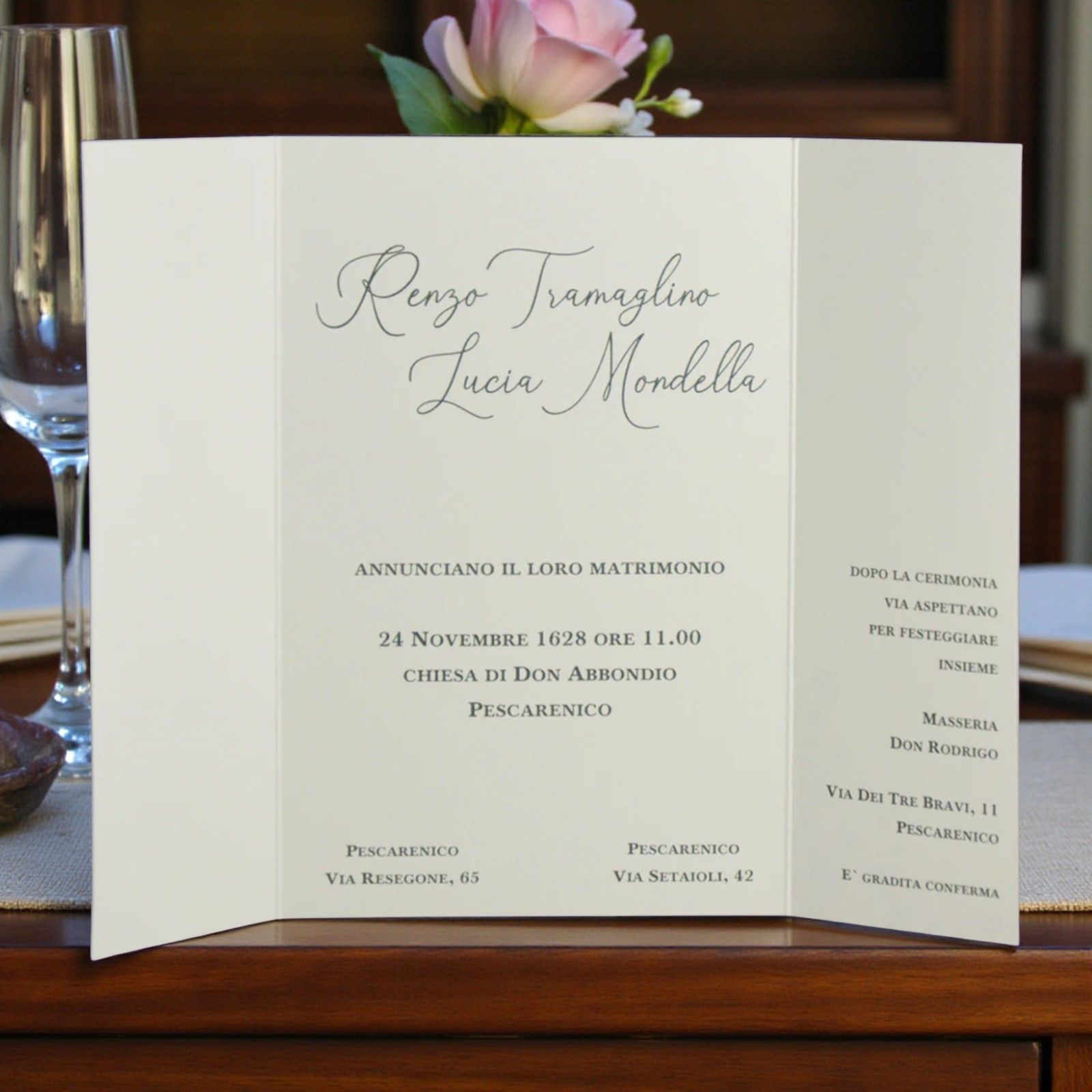 All'interno è presente invito alla cerimonia nella parte centrale, mentre l'invito per il ristorante, o per il taglio torta, che può anche essere lasciato vuoto, è presente nella parte sinistra.
